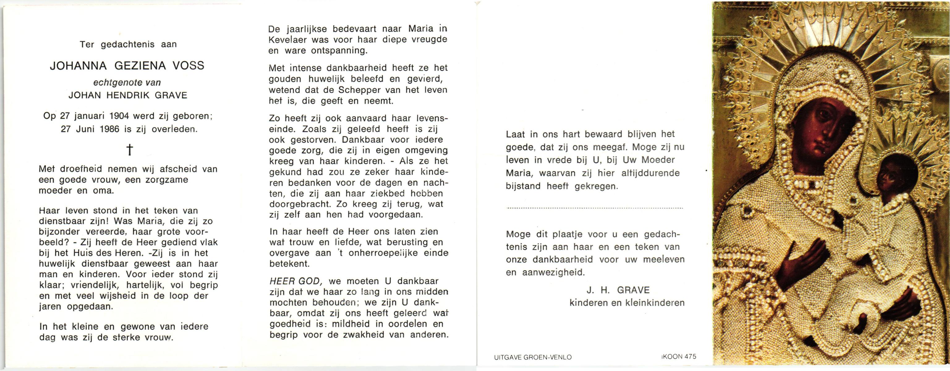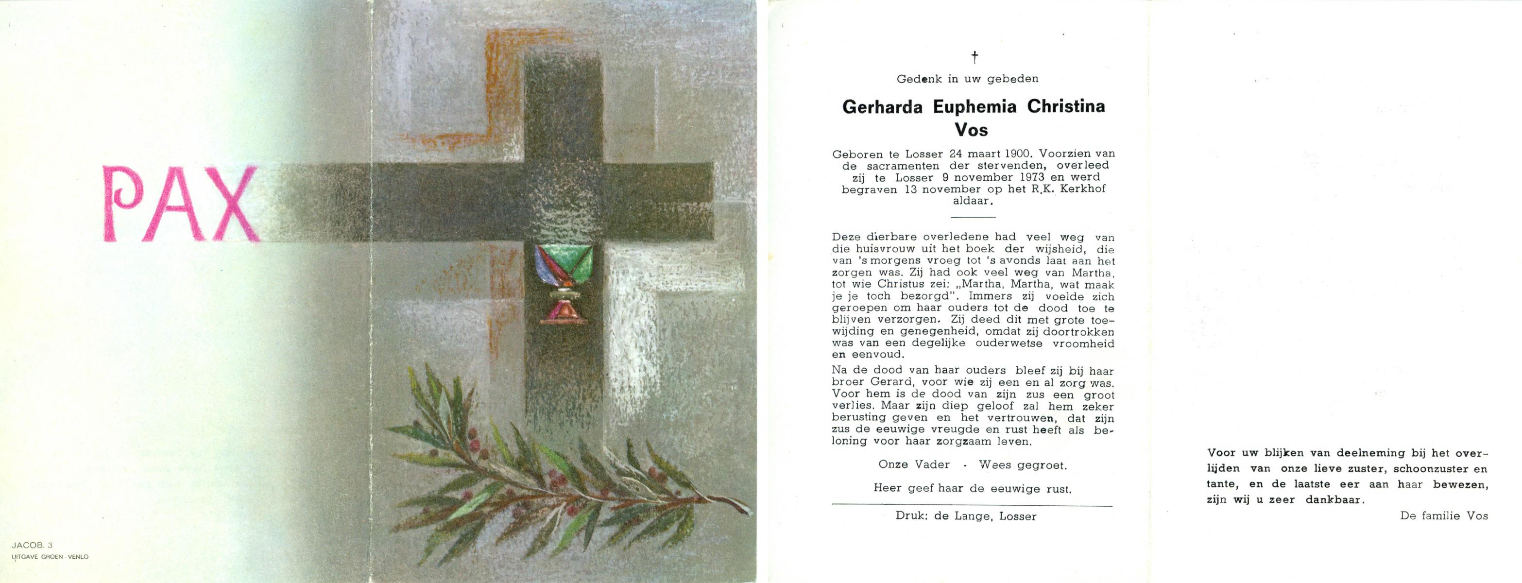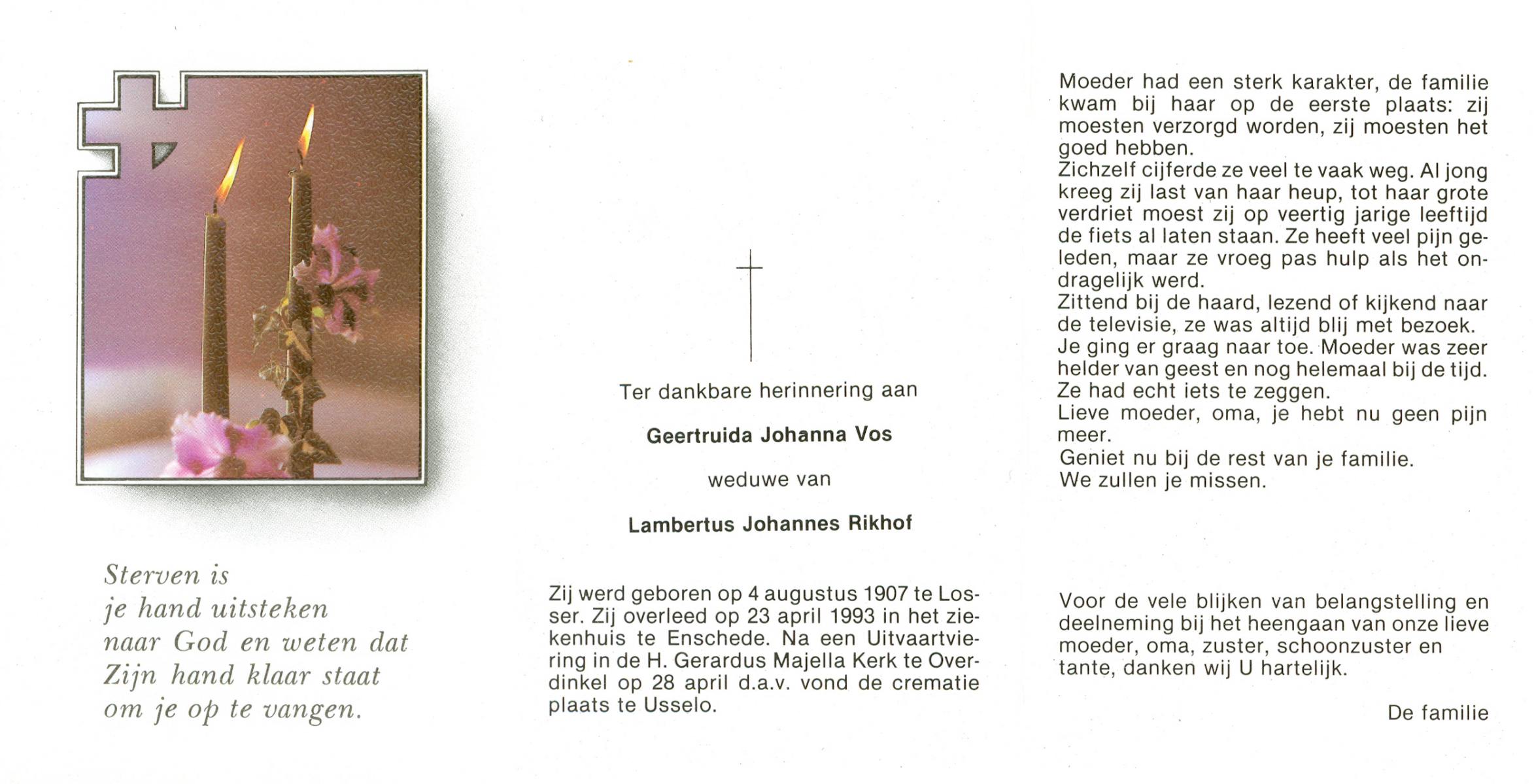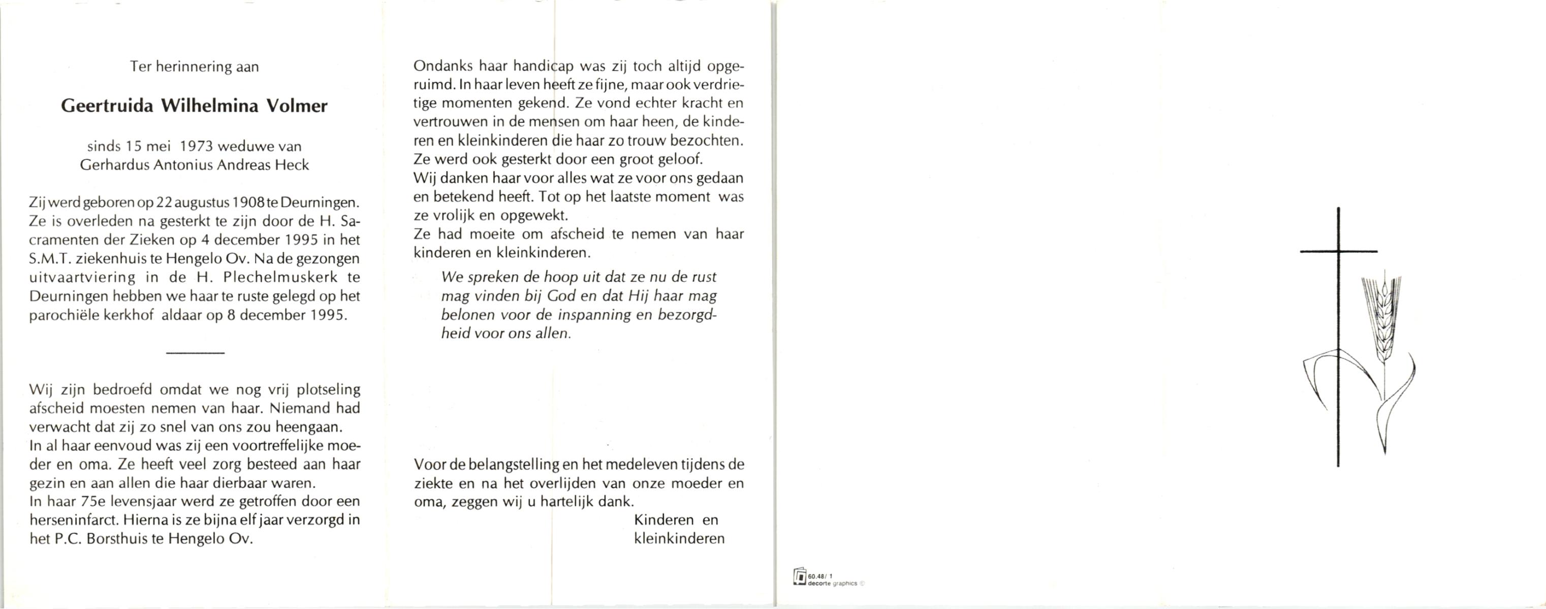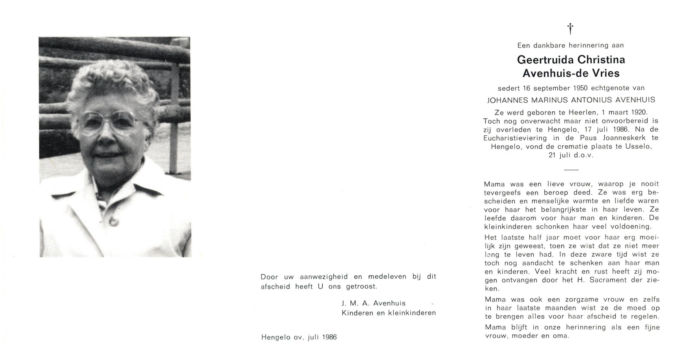 VRIES, de, Geertruida Christina, geboren op 1-3-1920 te Heerlen, overleden op 17-7-1986 te Hengelo (Ov.) op 66-jarige leeftijd, gecremeerd op 21-7-1986 te Usselo.