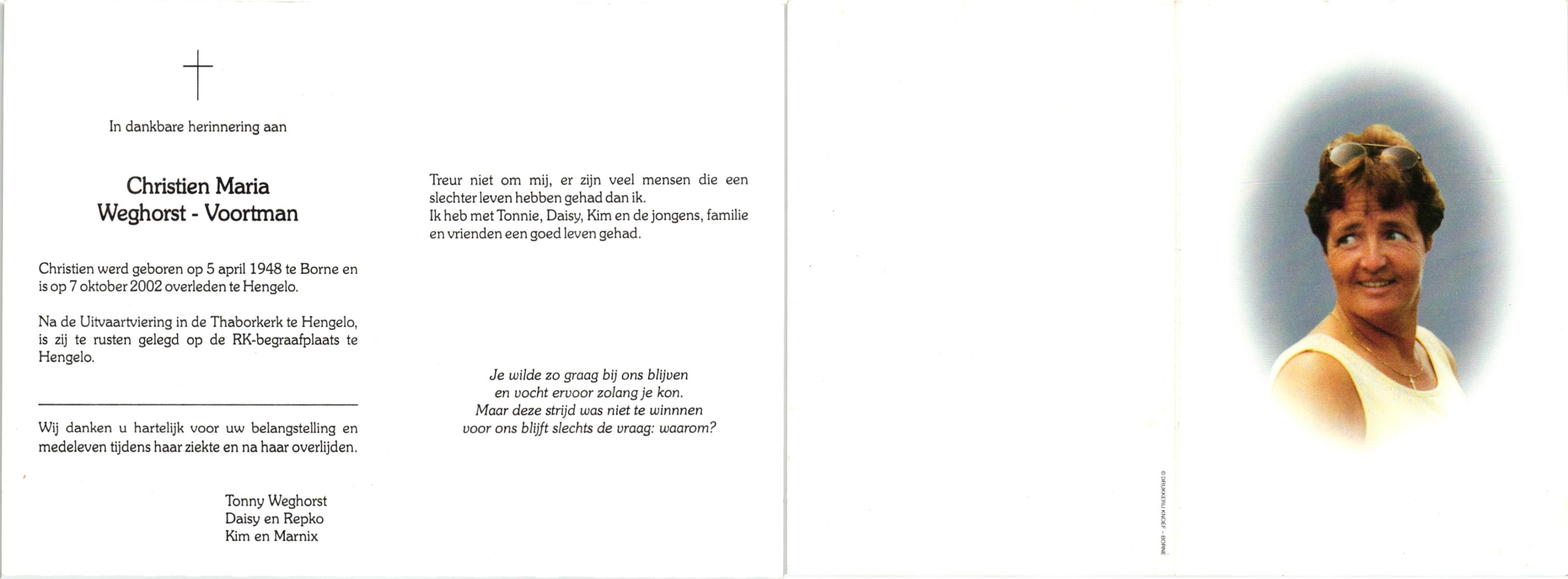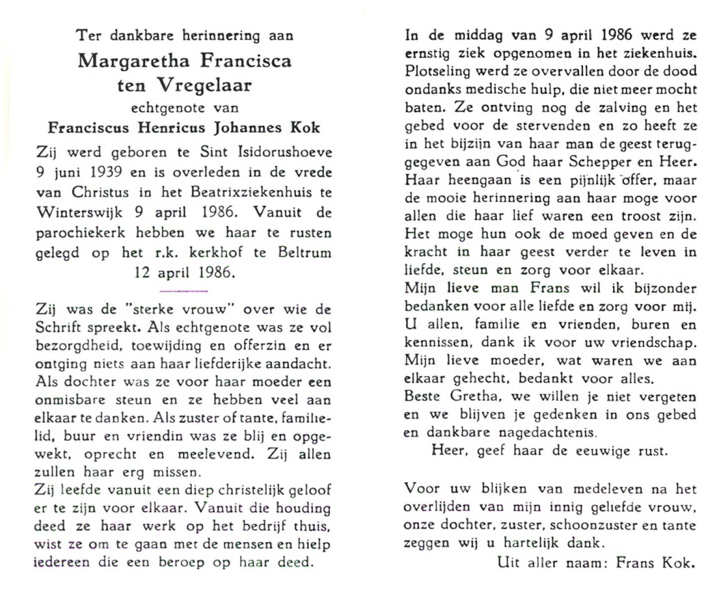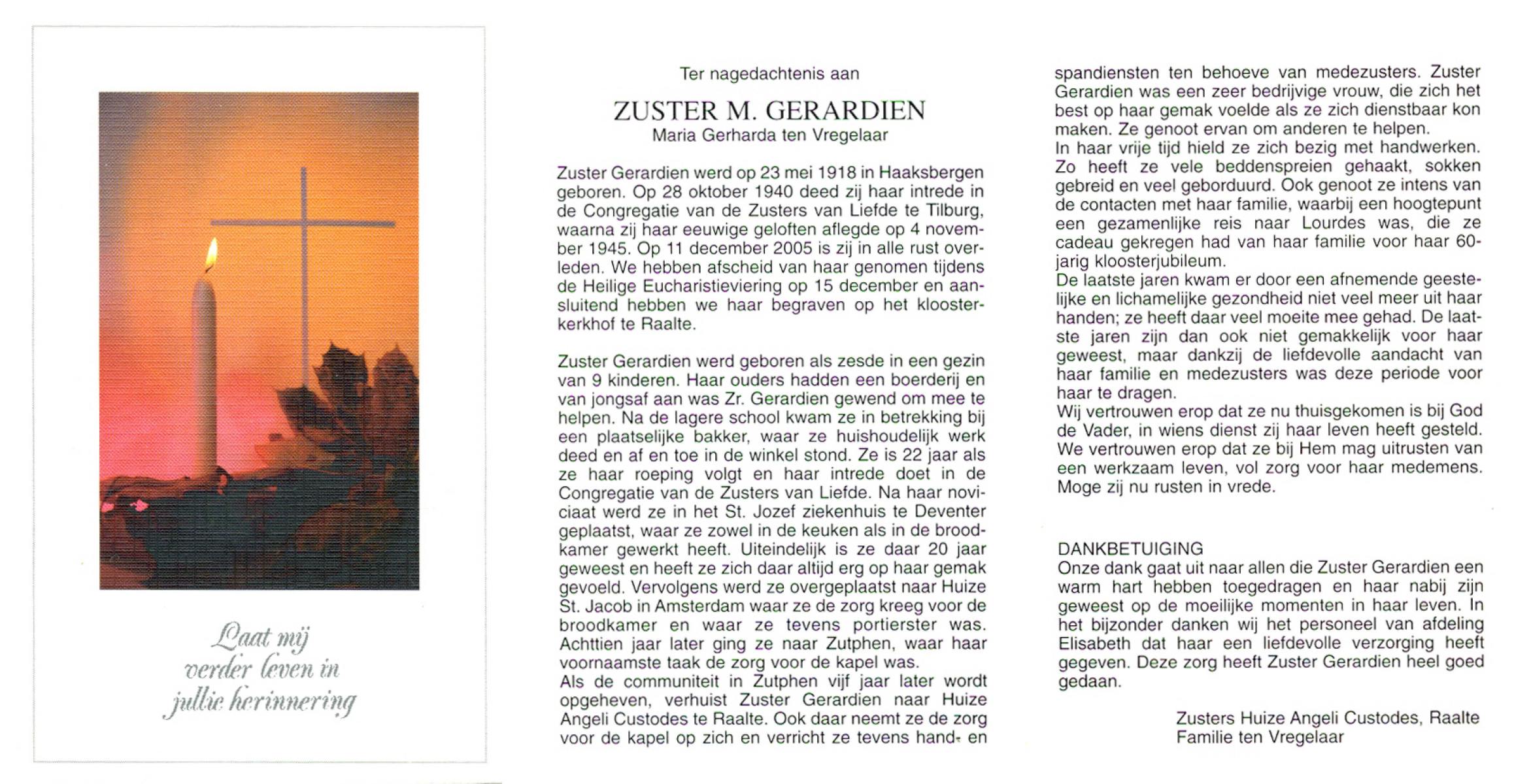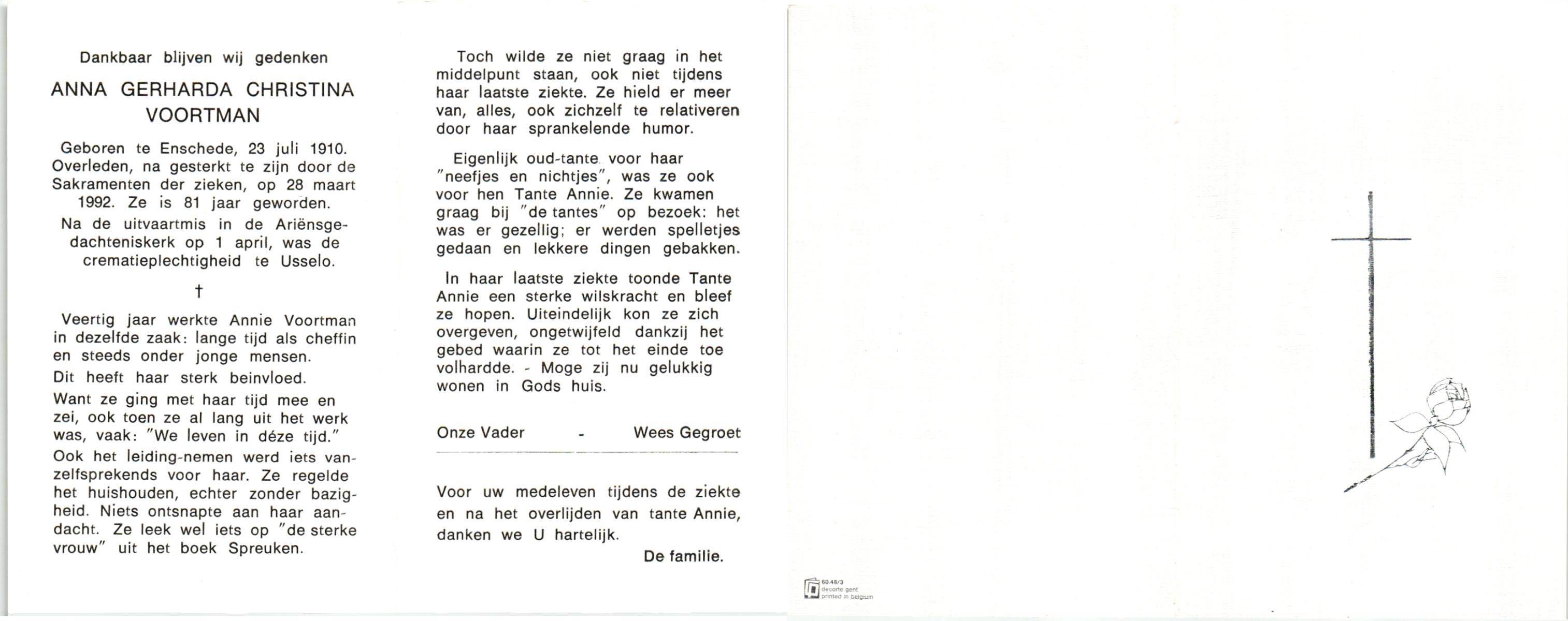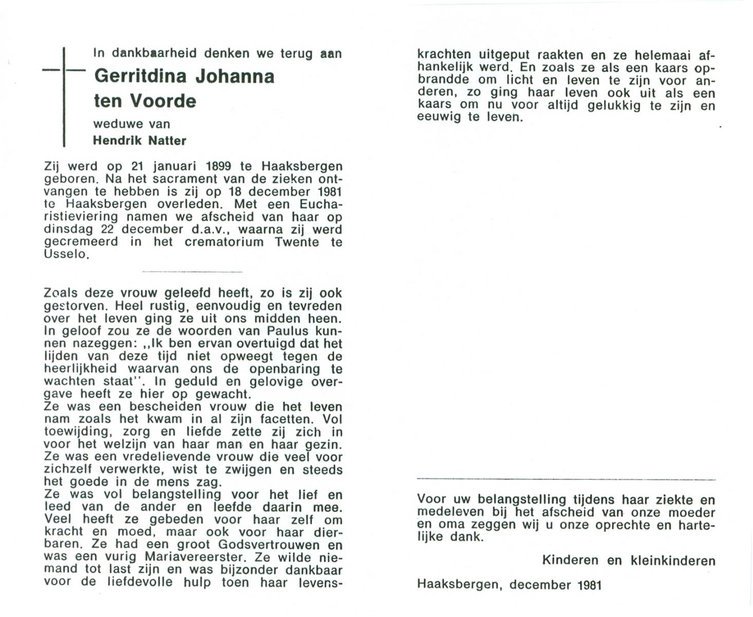 VRIES, de, Geertruida Christina, geboren op 1-3-1920 te Heerlen, overleden op 17-7-1986 te Hengelo (Ov.) op 66-jarige leeftijd, gecremeerd op 21-7-1986 te Usselo.
