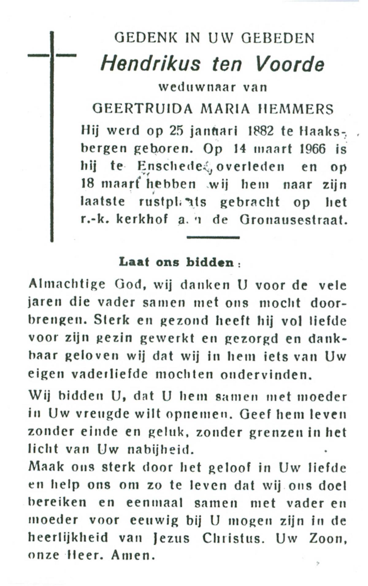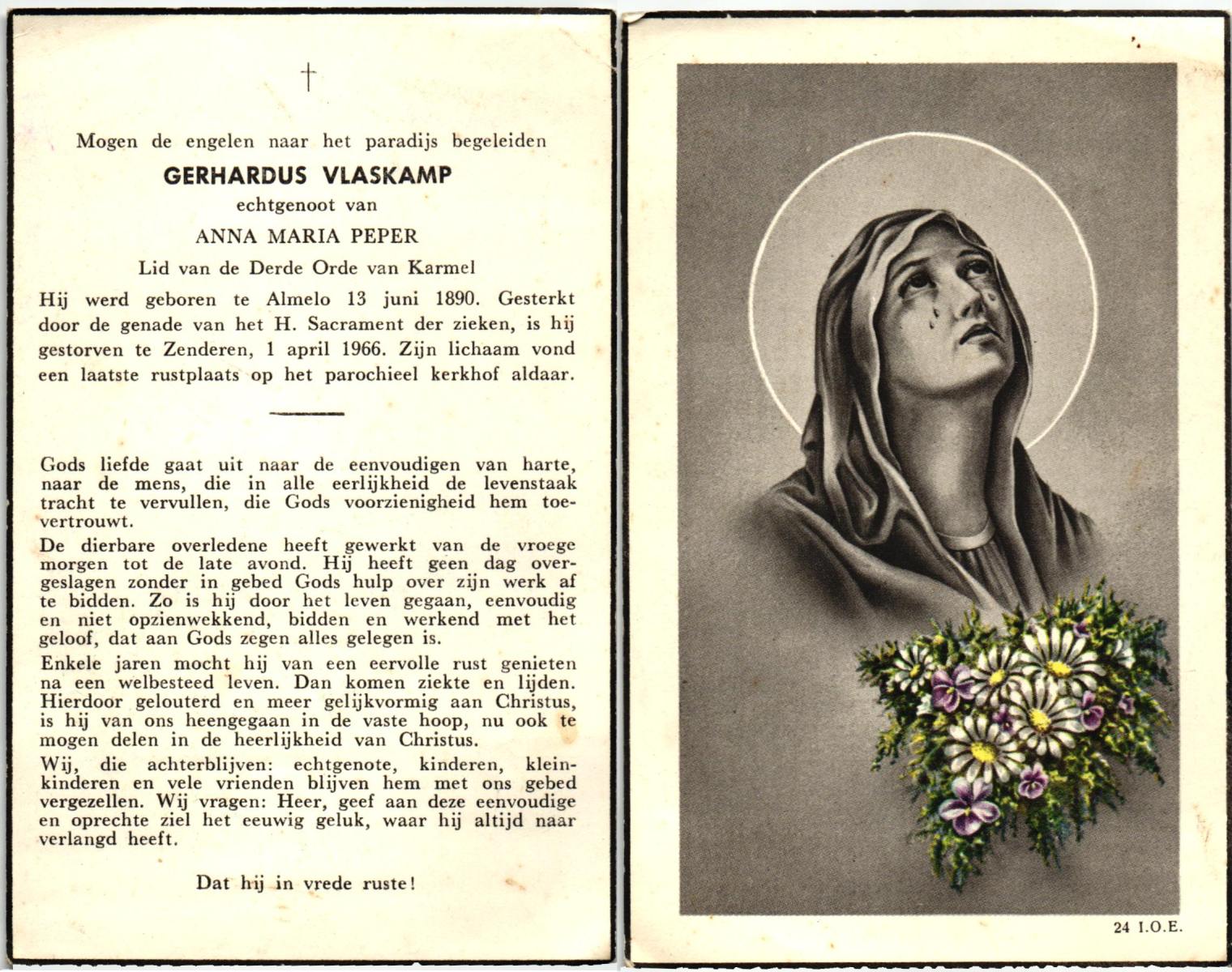 VLASKAMP, Gerhardus, geboren op 13-06-1890 te Almelo, overleden op 1-4-1966 te Zenderen op 75-jarige leeftijd, begraven te Zenderen.