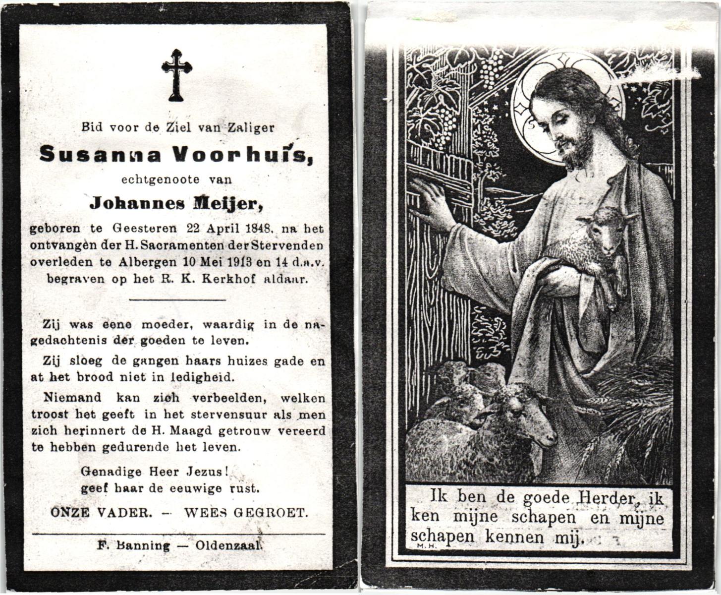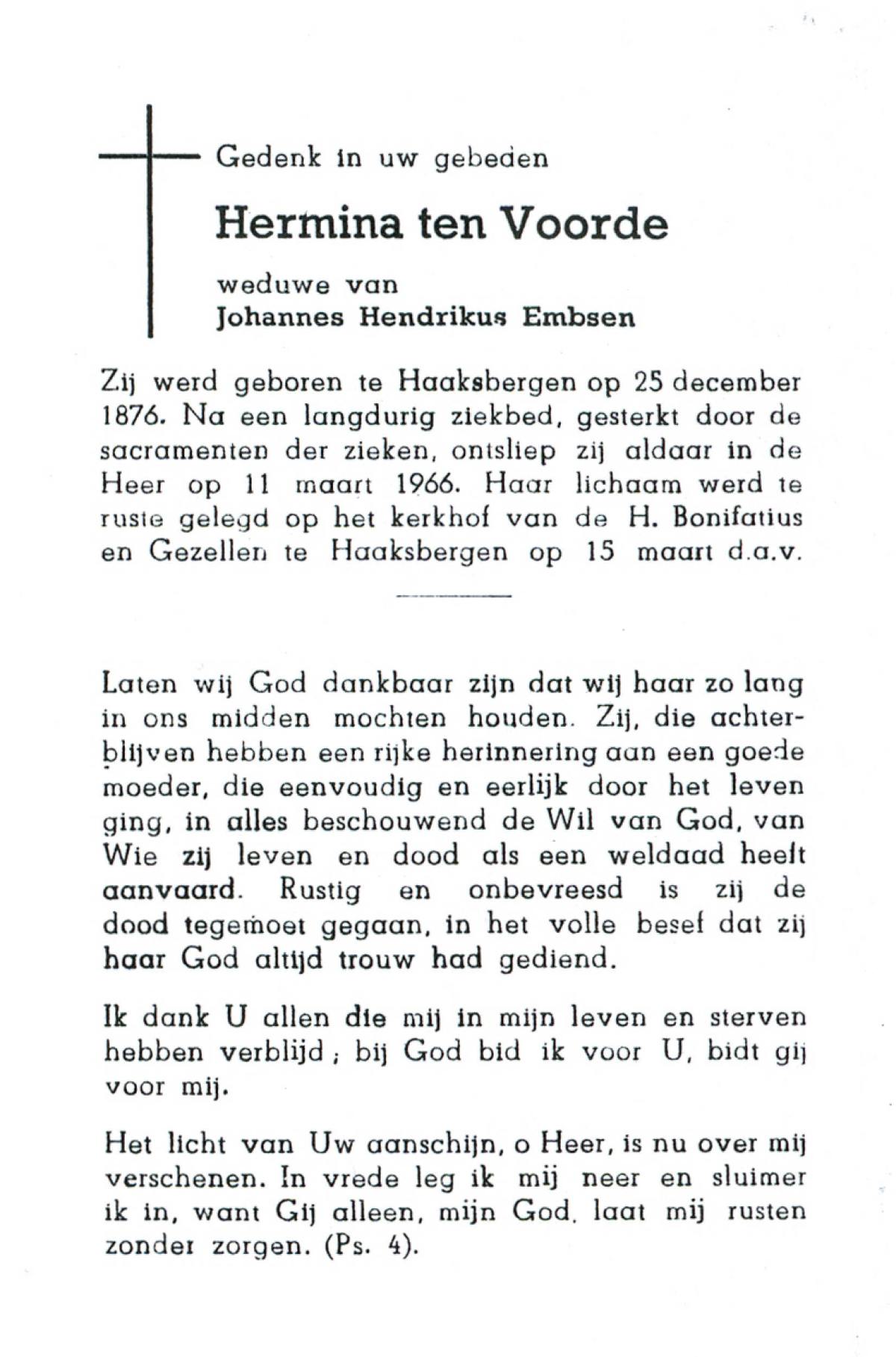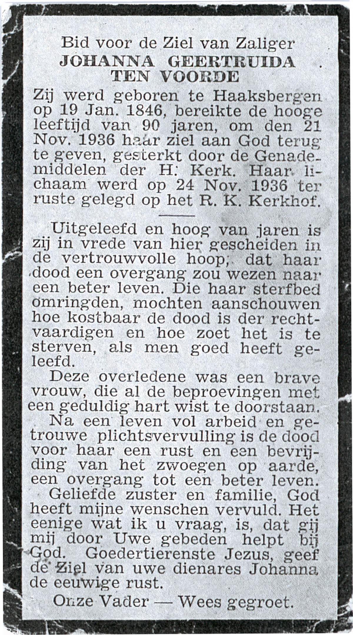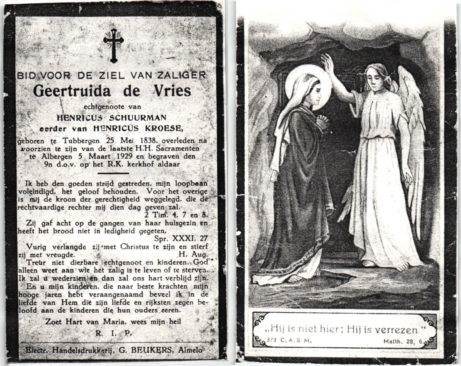 VRIES, de, Geertruida, geboren op 25-05-1838 te Tubbergen, overleden op 5-3-1929 te Albergen op 90-jarige leeftijd, begraven op 9-3-1929 te Albergen.