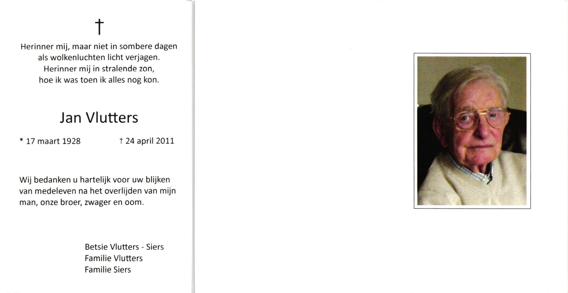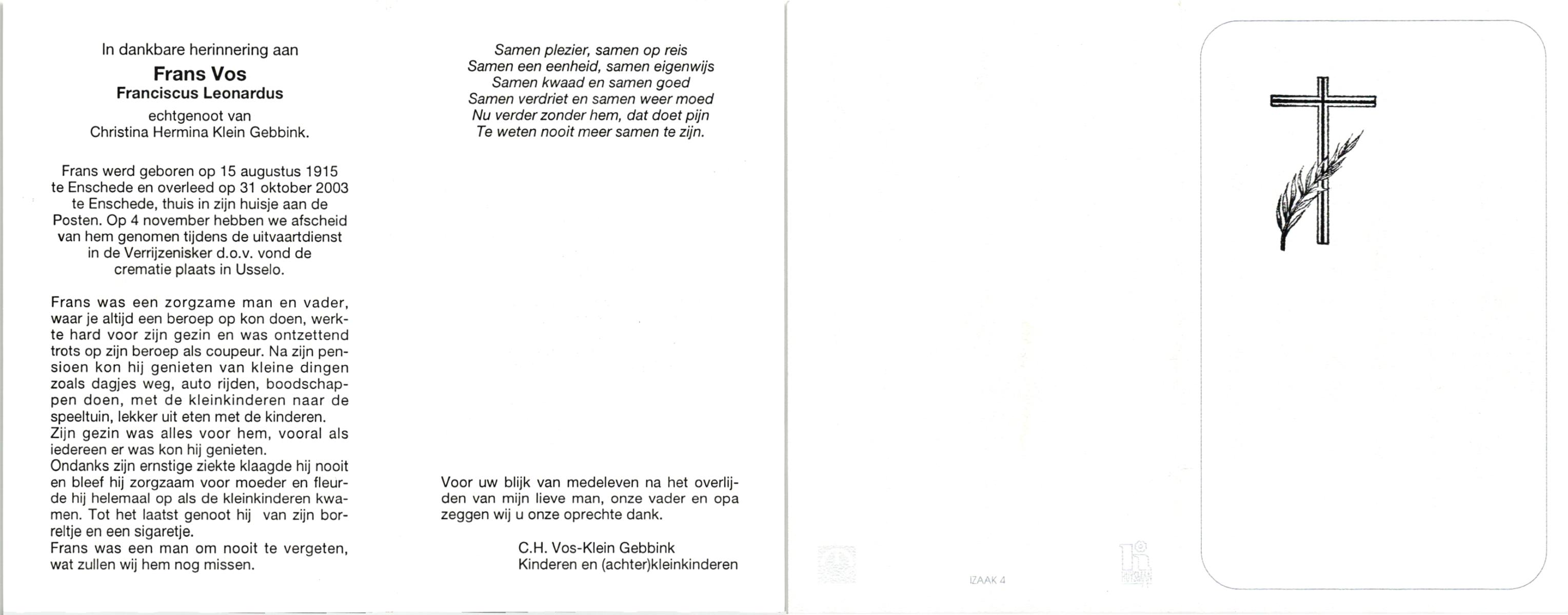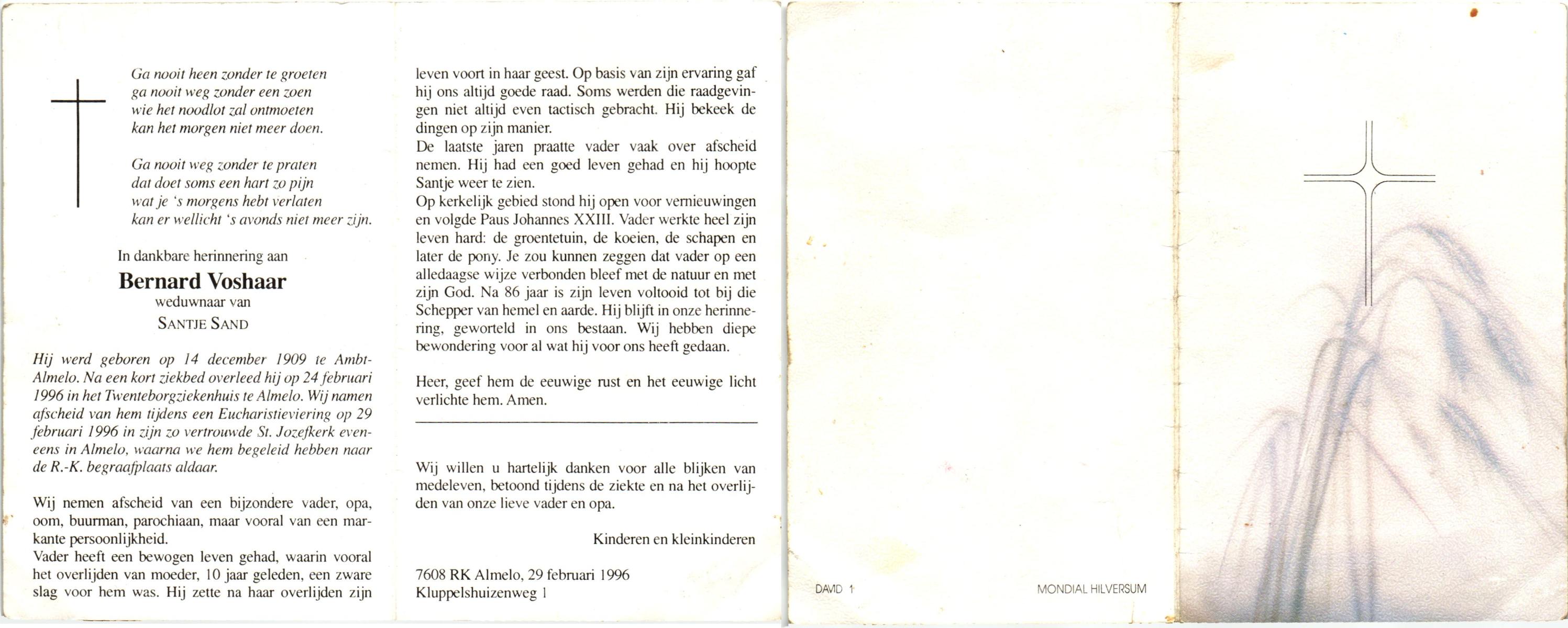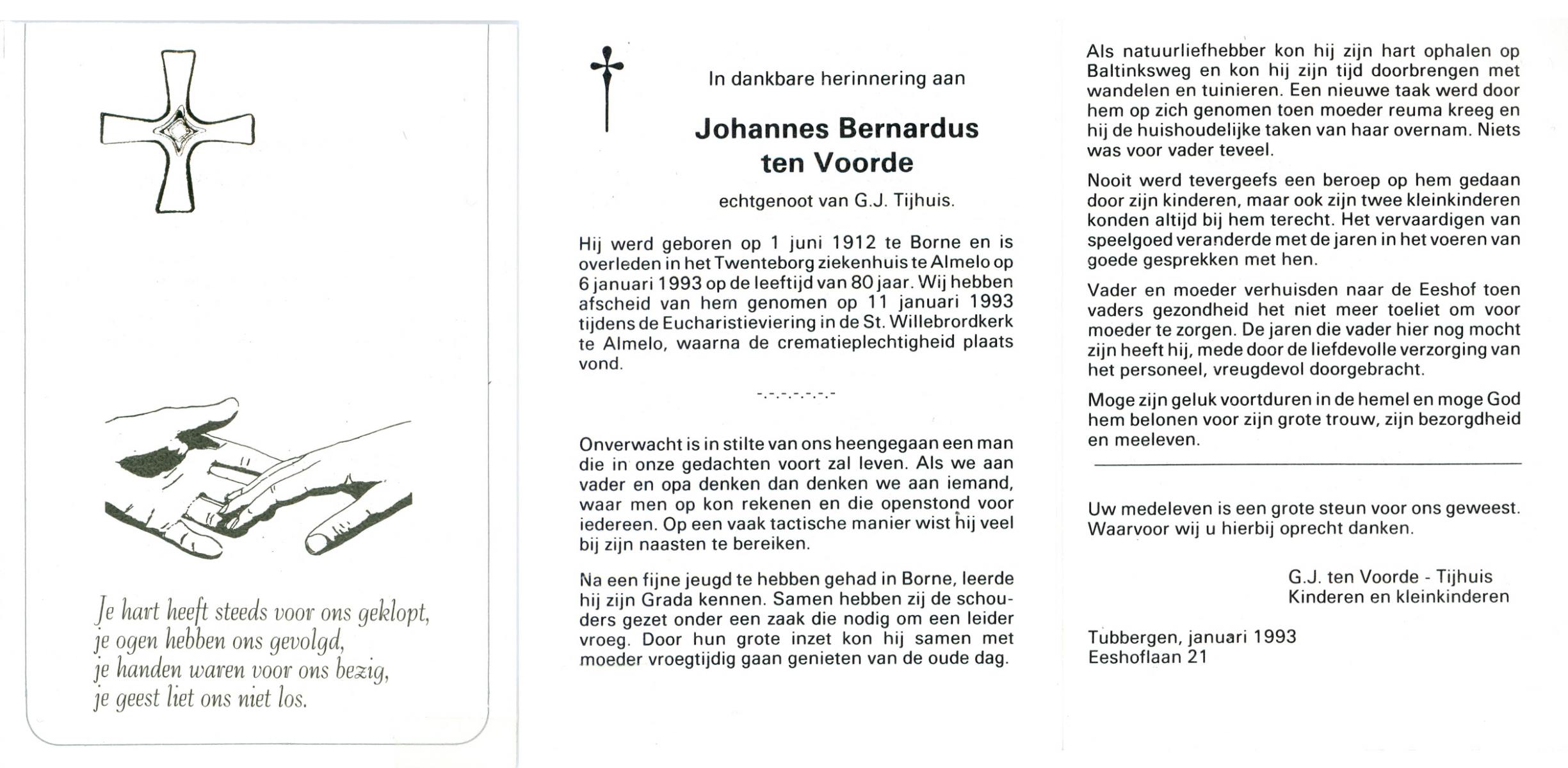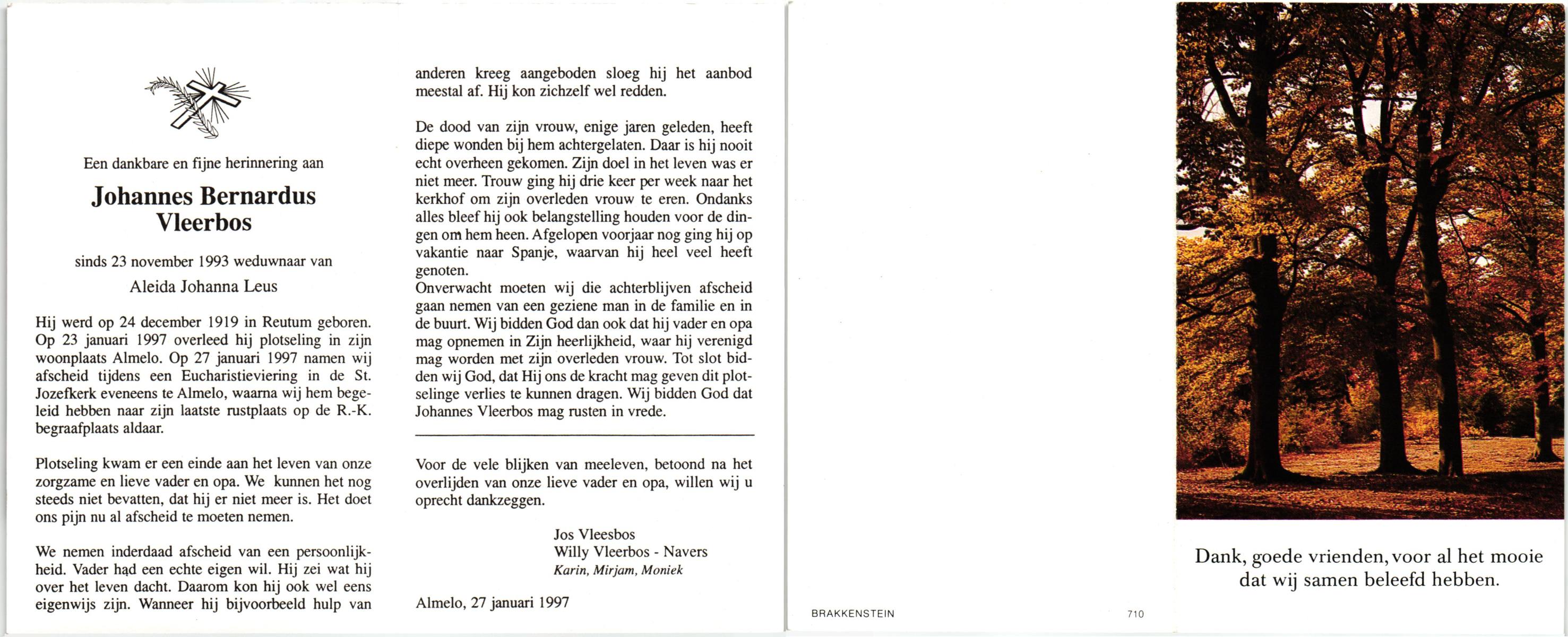 VLEERBOS, Johannes Bernardus, geboren op 24-12-1919 te Reutum, overleden op 23-1-1997 te Almelo op 77-jarige leeftijd, begraven op 27-1-1997 te Amelo.