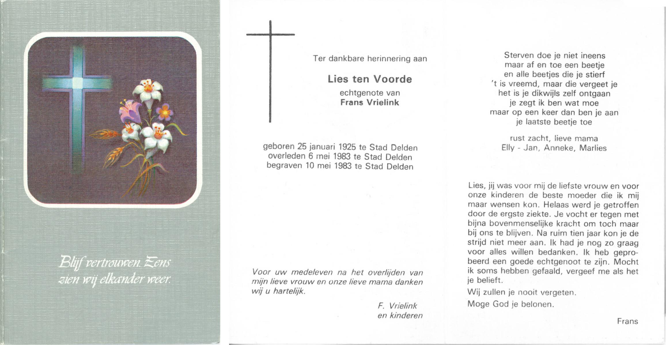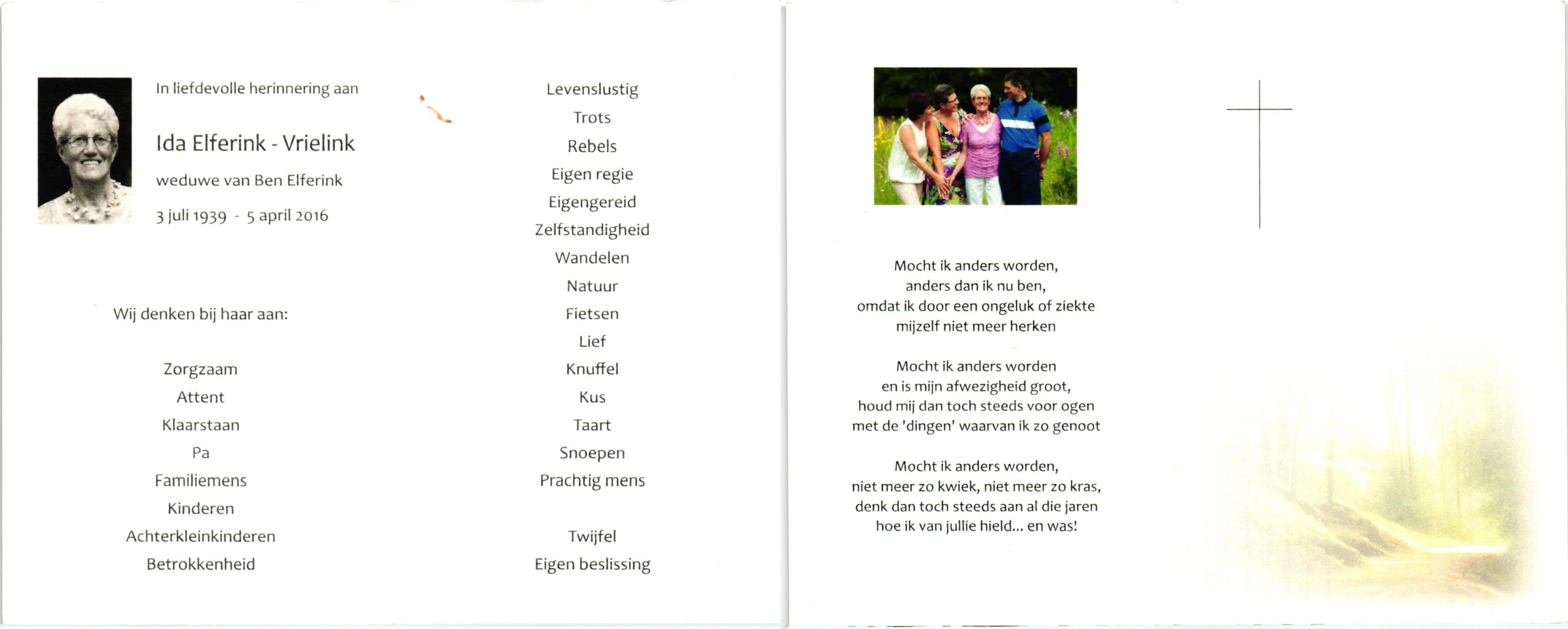 VRIELINK, Ida, geboren op 3-7-1939, overleden op 5-4-2016 op 76-jarige leeftijd.