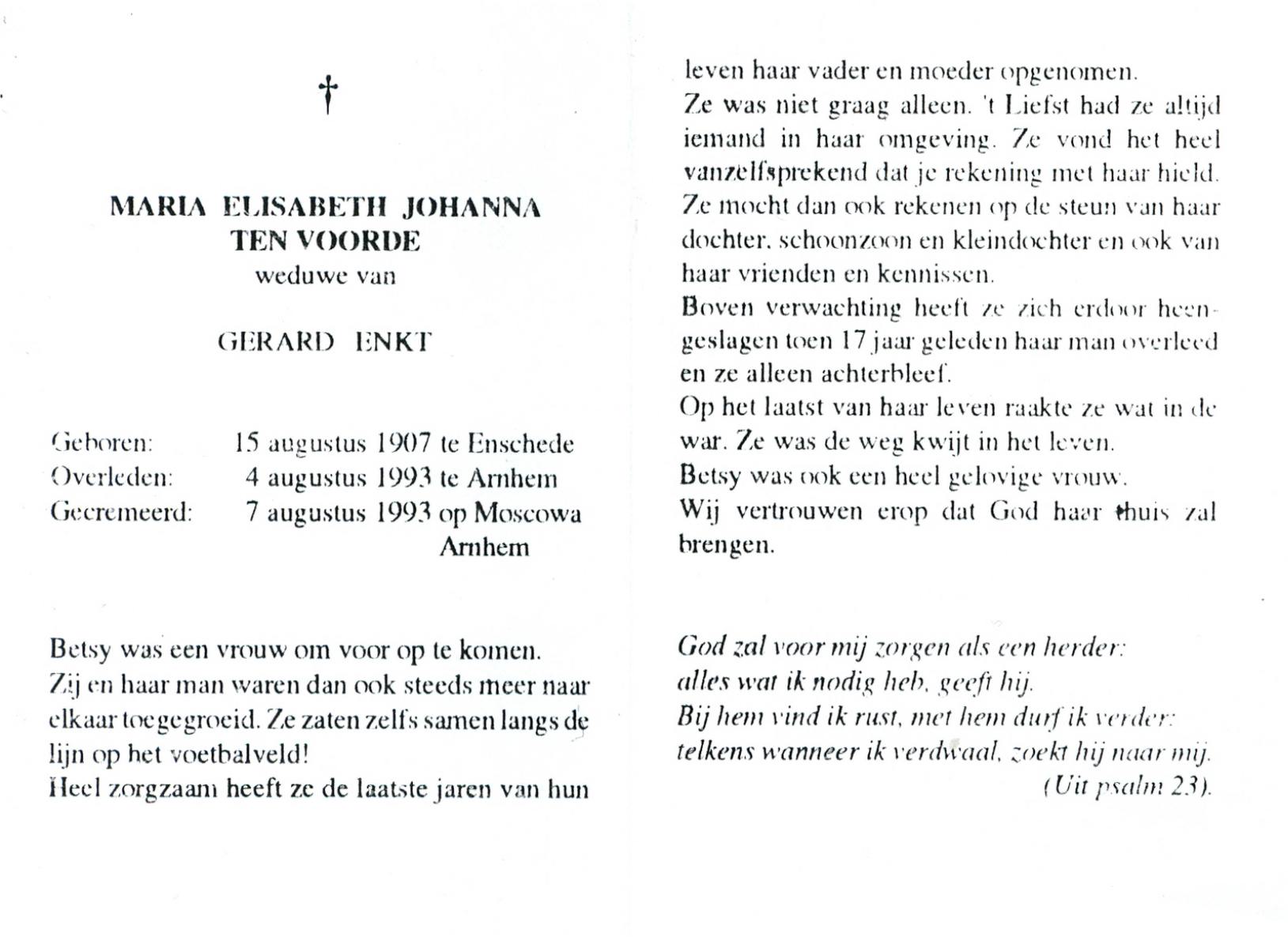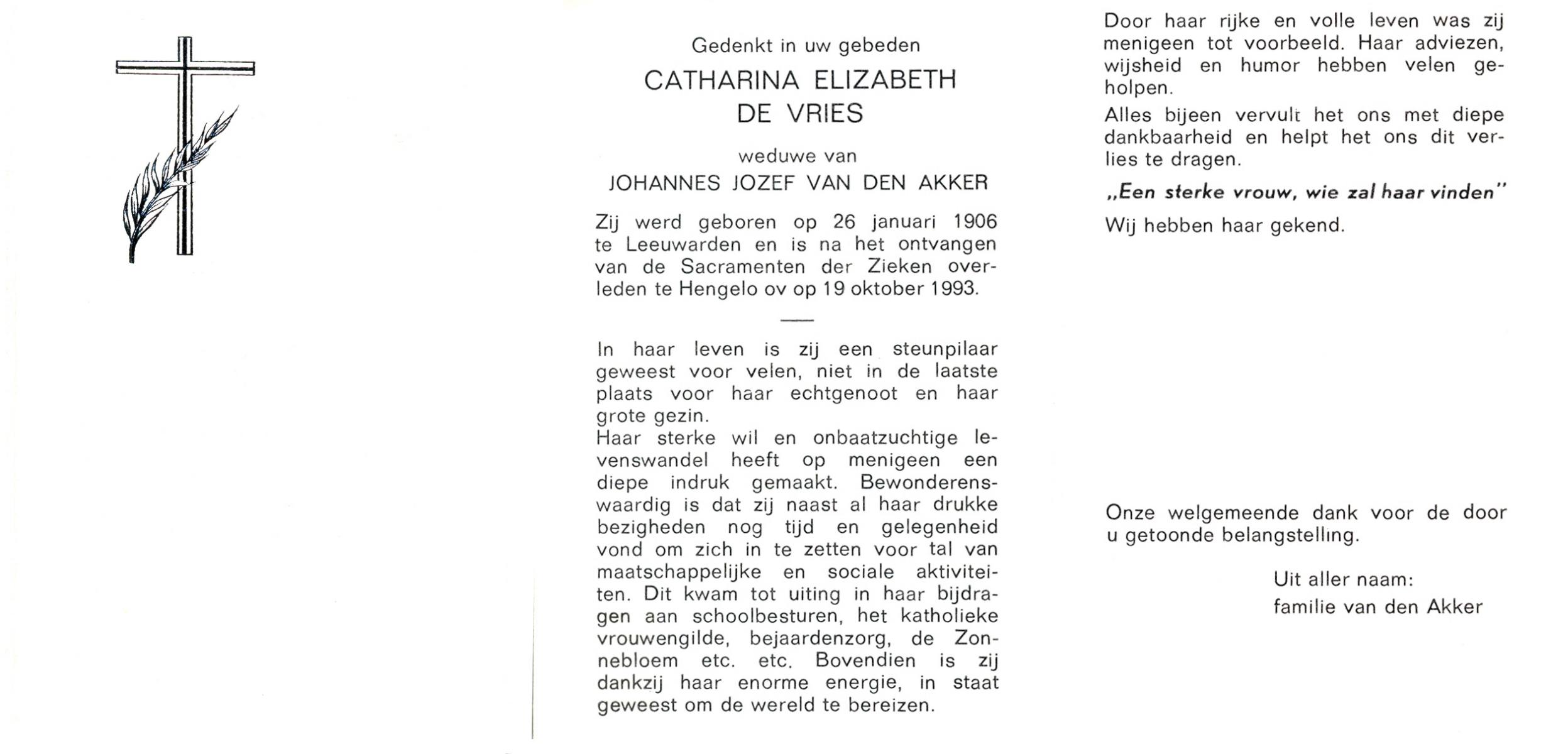 VRIES, de, Catharina Elizabeth, geboren op 26-1-1906 te Leeuwarden, overleden op 19-10-1993 te Hengelo (Ov.) op 87-jarige leeftijd.