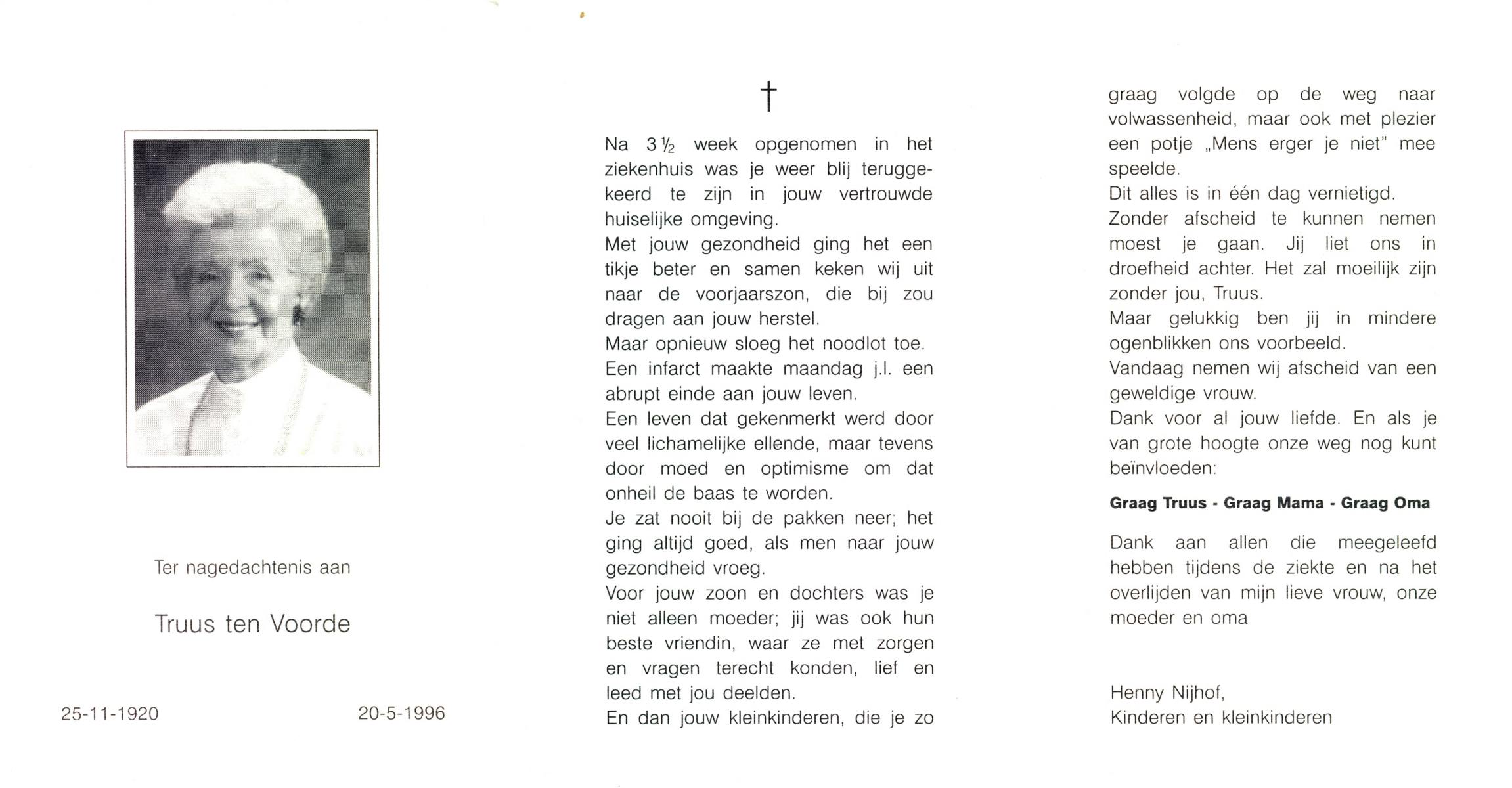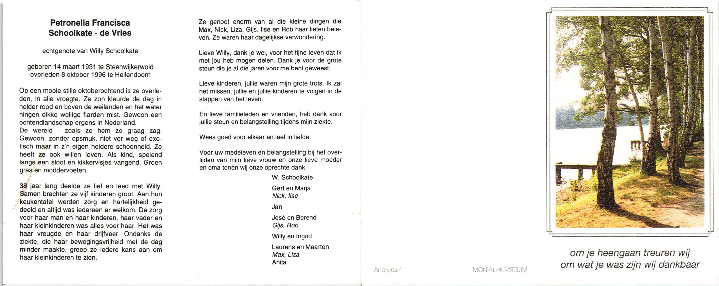VRIES, de, Petronella Francisca, geboren op 14-3-1931 te Steenwijkerwold, overleden op 8-10-1996 te Hellendoorn op 65-jarige leeftijd.