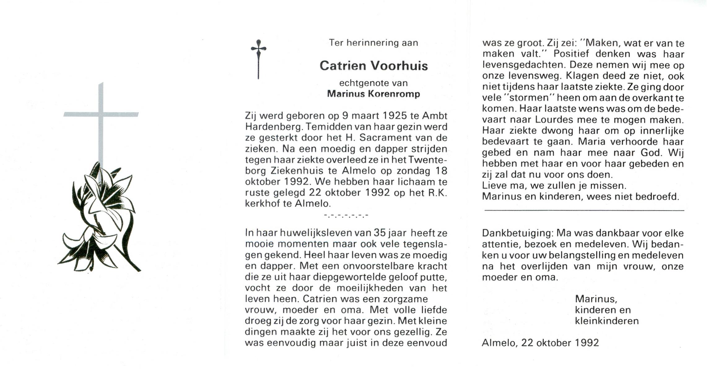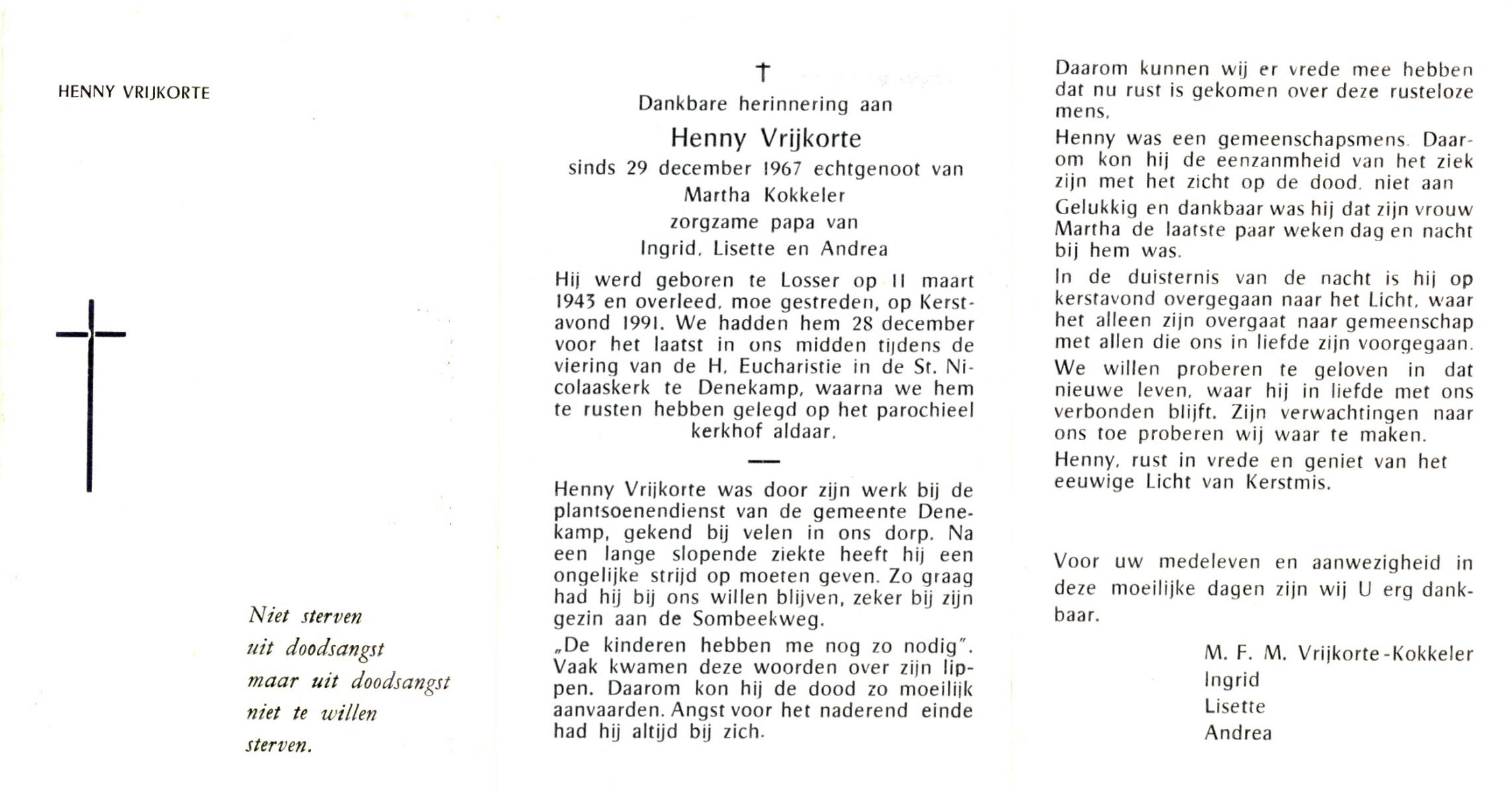 VRIJKORTE, Henny, geboren op 11-3-1943 te Losser, overleden op 24-12-1991 op 48-jarige leeftijd, begraven op 28-12-1991 te Denekamp R.K.kerkhof.