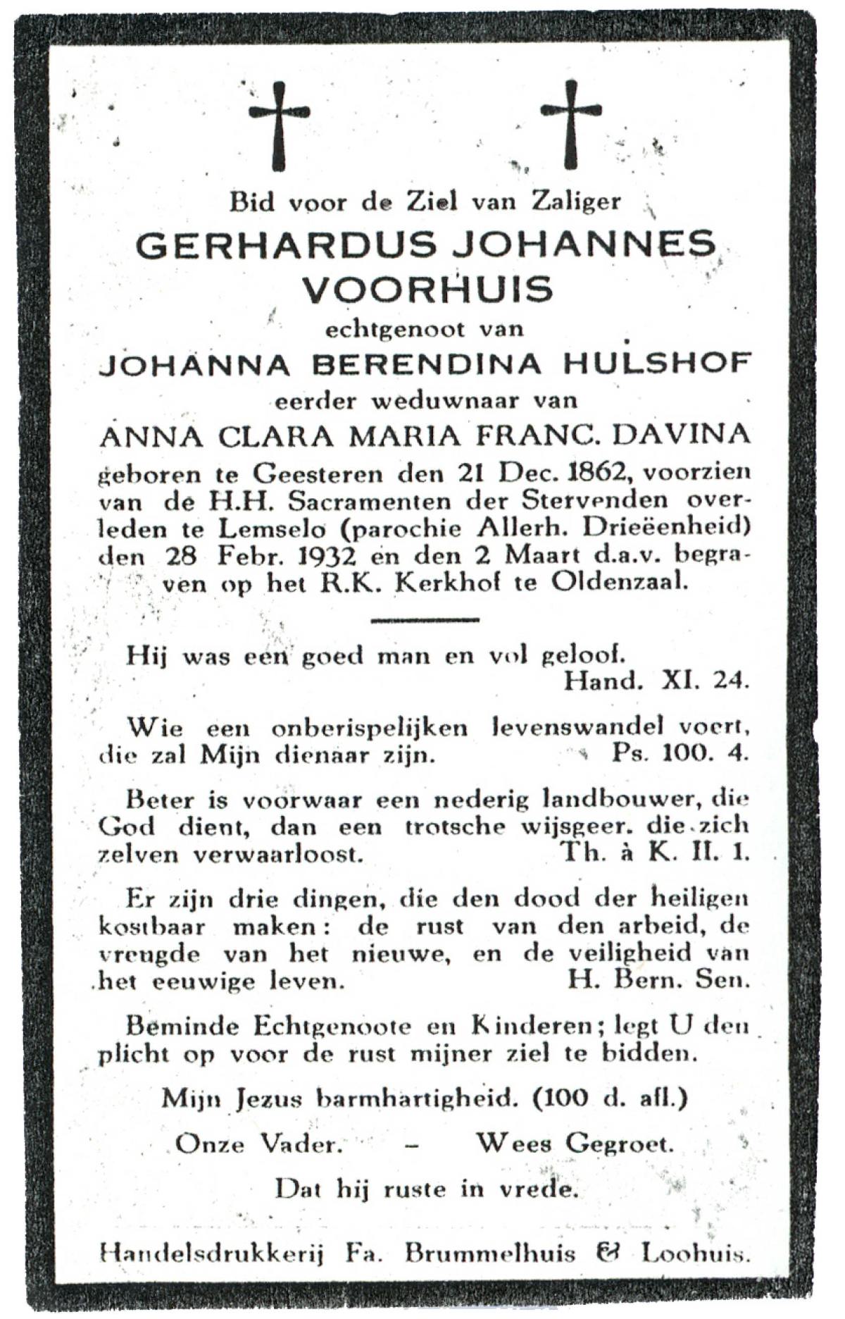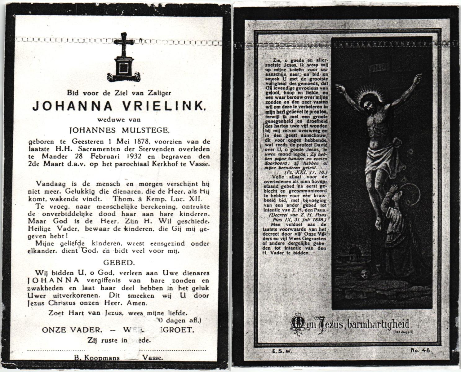 VRIELINK, Johanna, geboren op 01-05-1878 te Geesteren, overleden op 28-2-1932 te Mander op 53-jarige leeftijd, begraven op 2-3-1932 te Vasse.
