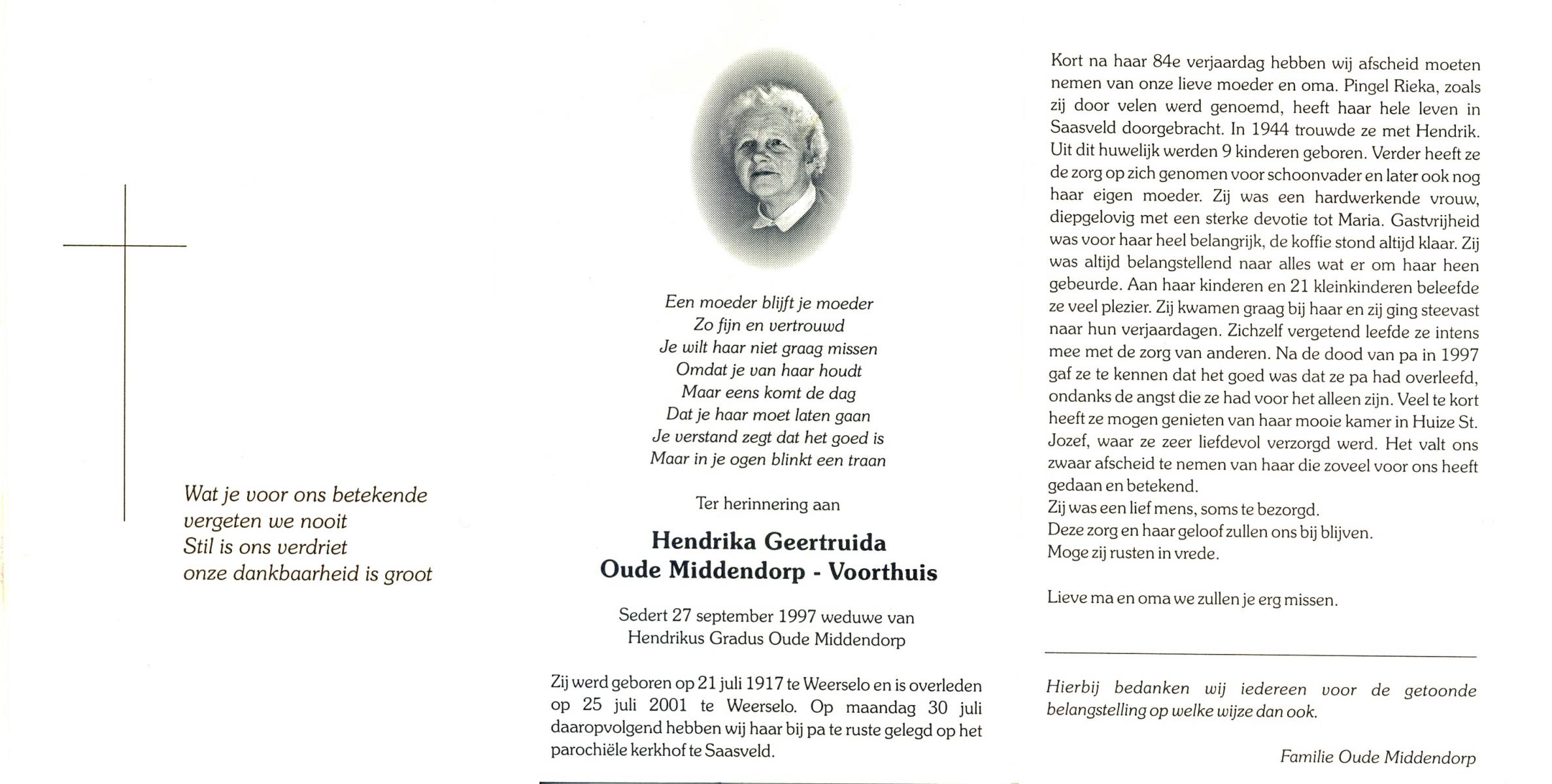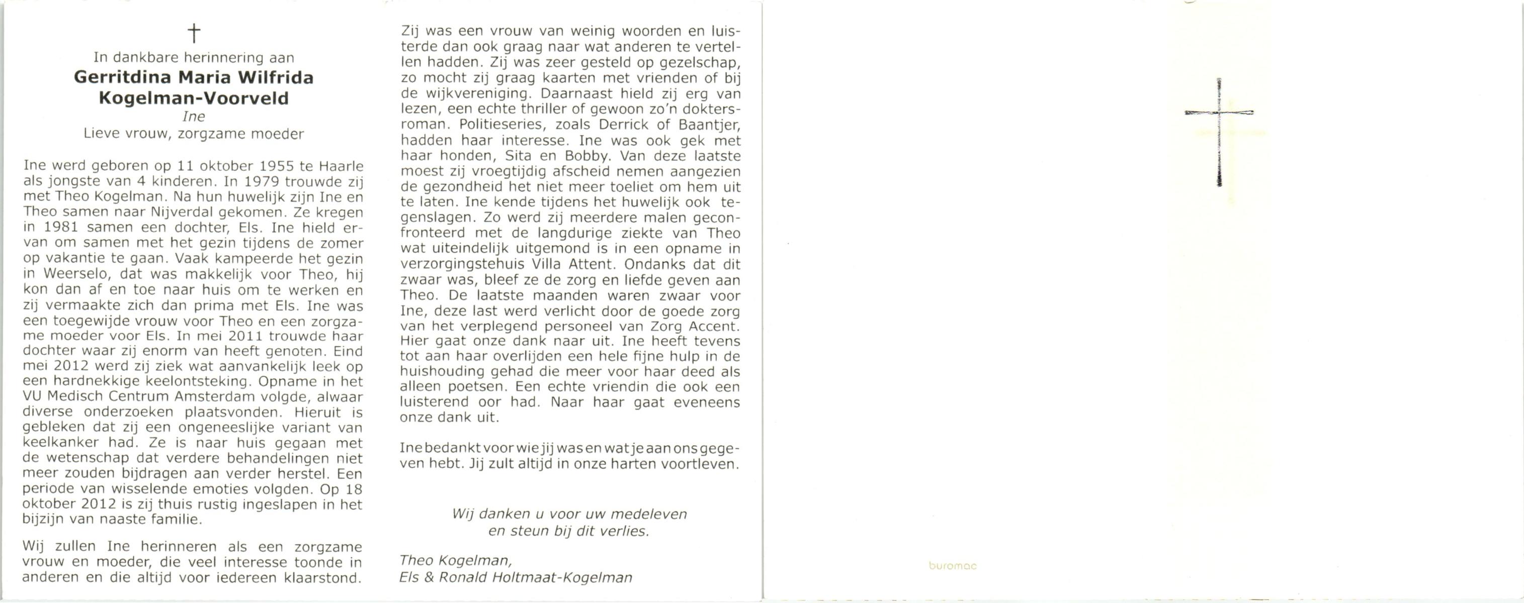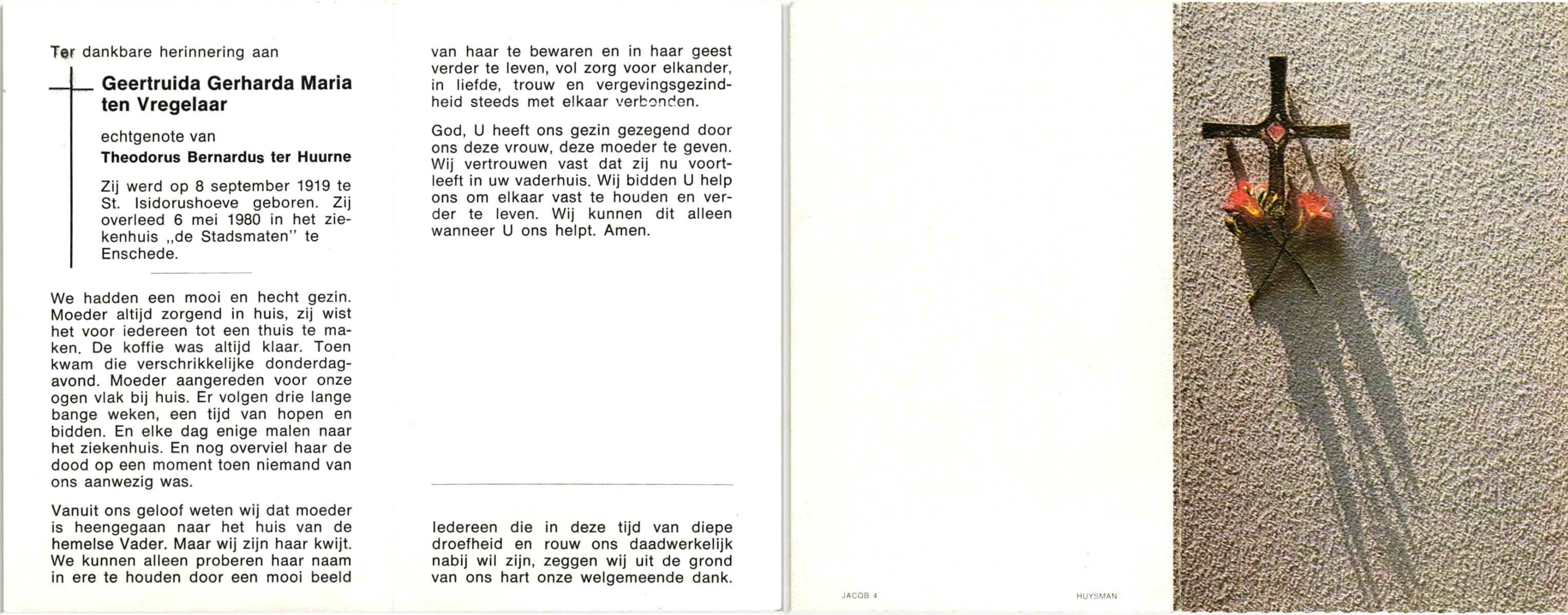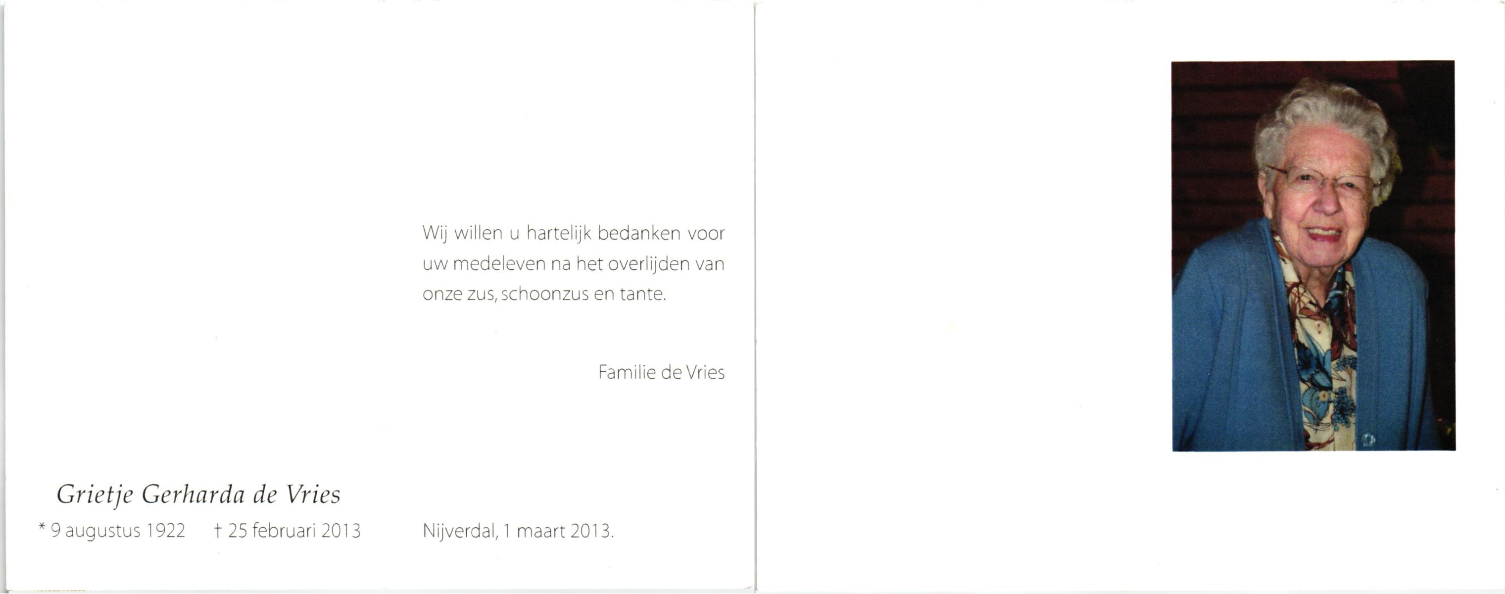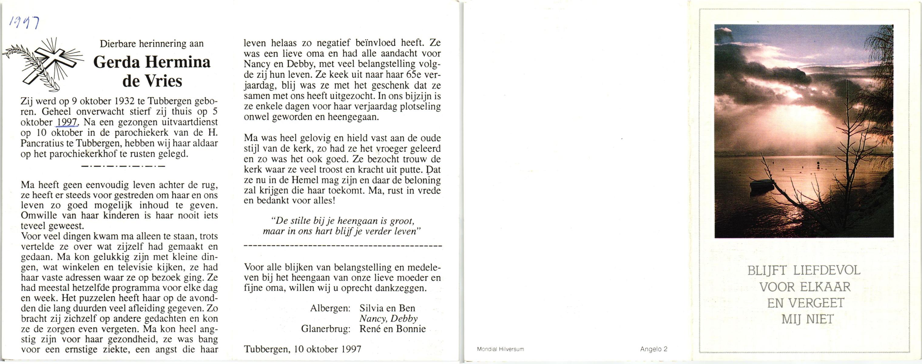 VRIES, de, Gerda Hermina, geboren op 9-10-1932 te Tubbergen, overleden op 5-10-1997 te Tubbergen op 64-jarige leeftijd, begraven op 10-10-1997 te Tubbergen.