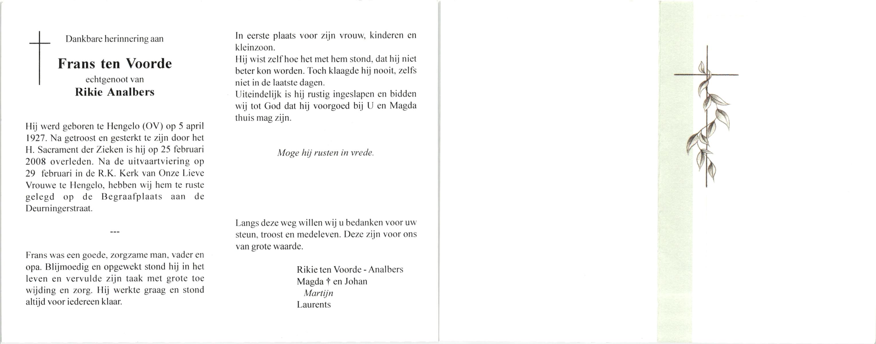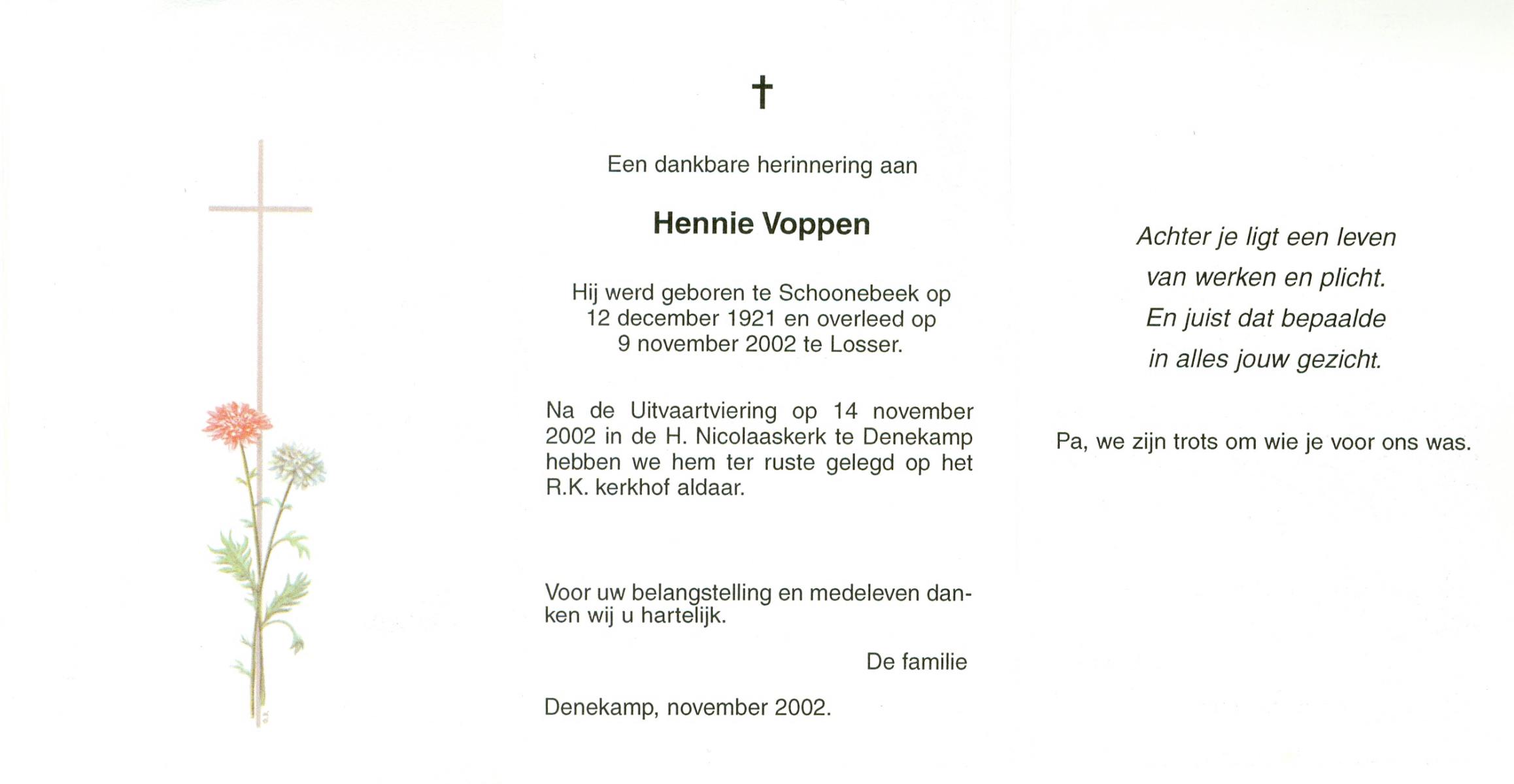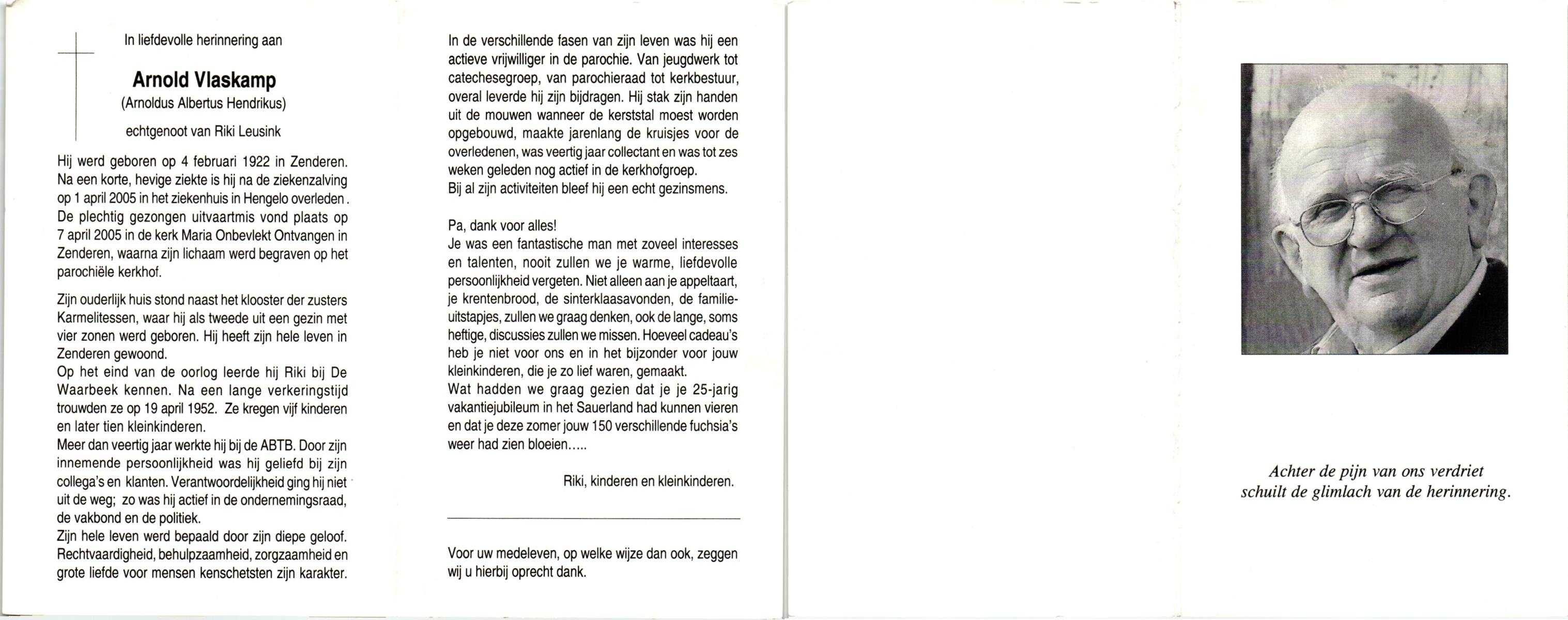 VLASKAMP, Arnold, geboren op 4-2-1922 te Zenderen, overleden op 1-4-2005 te Hengelo op 83-jarige leeftijd, begraven op 7-4-2005 te Zenderen.