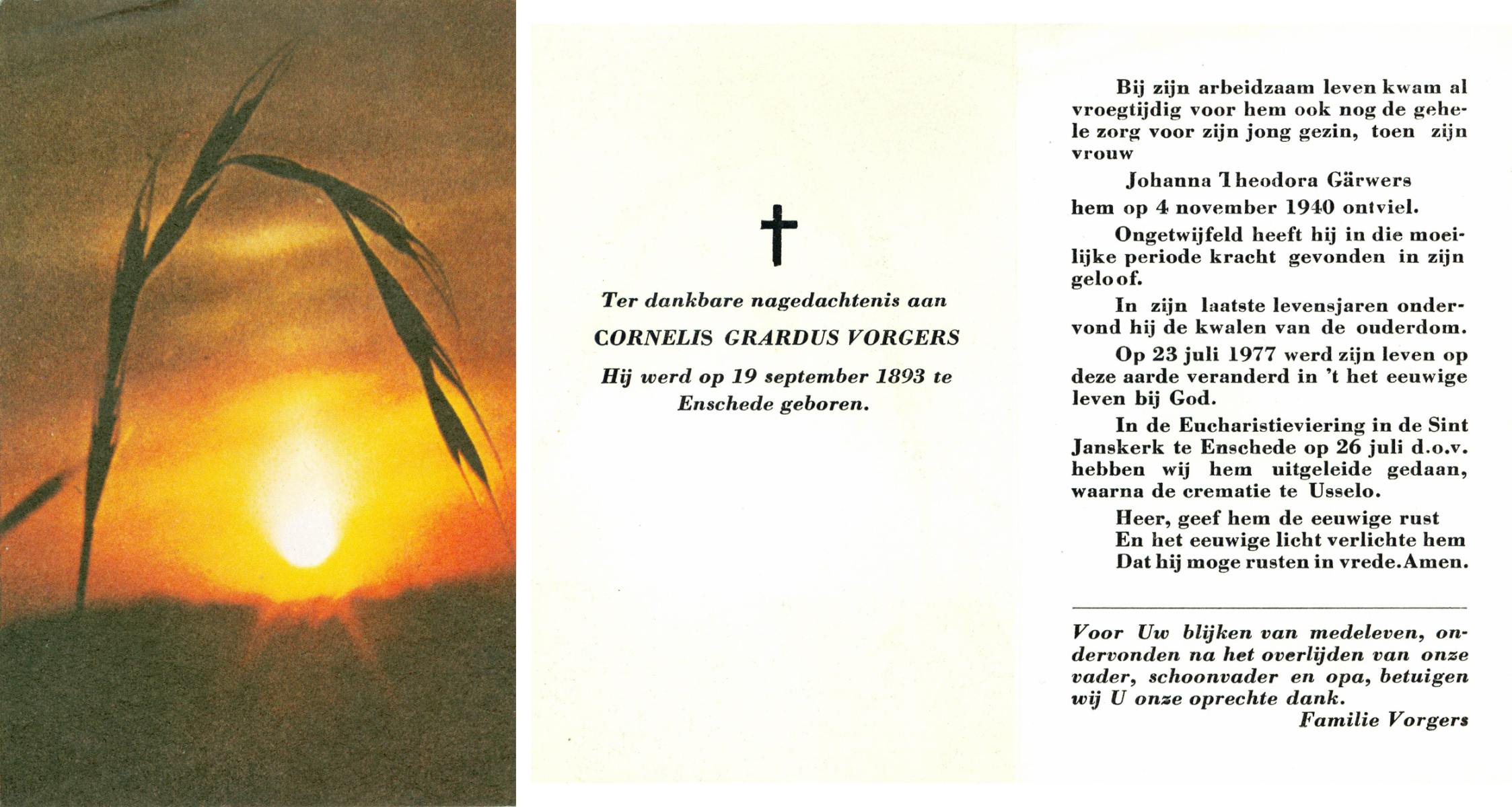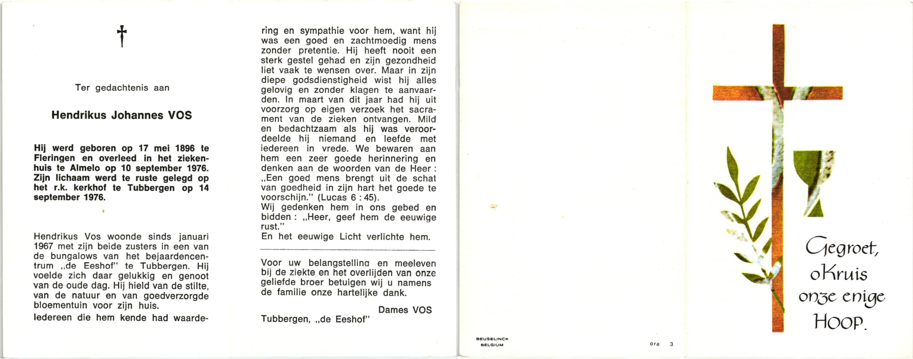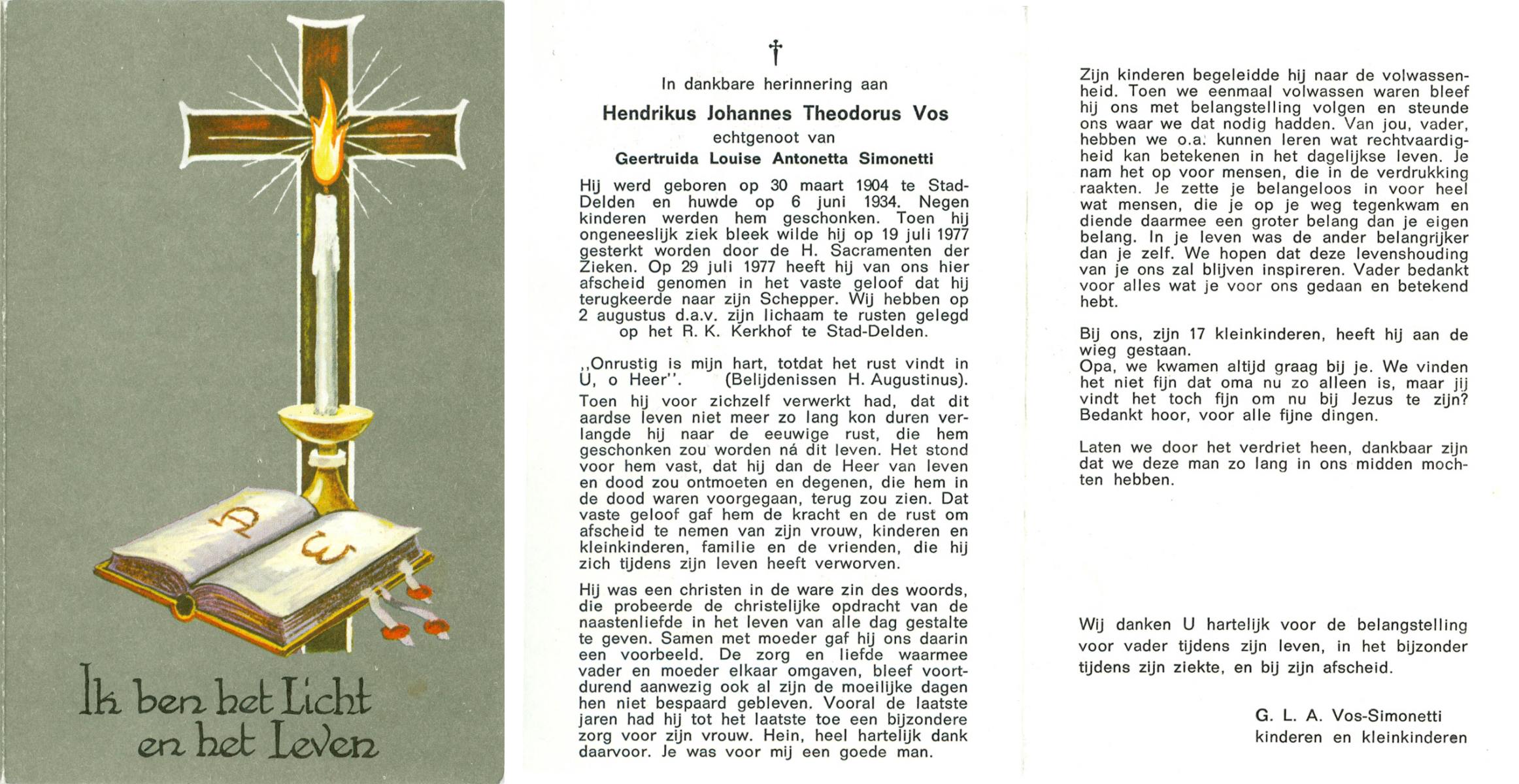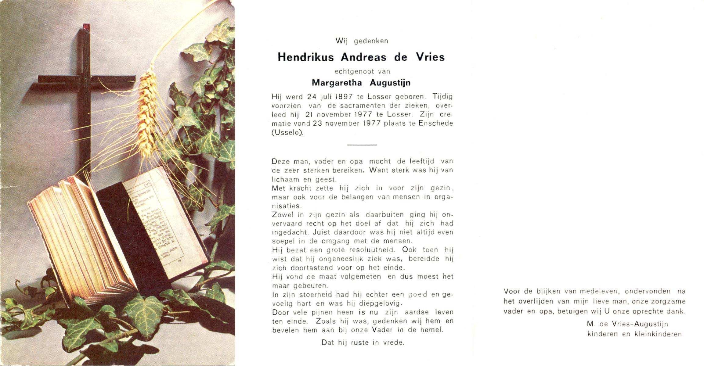 VRIES, de, Hendrikus Andreas, geboren op 24-07-1897 te Losser, overleden op 21-11-1977 te Losser op 80-jarige leeftijd, gecremeerd op 23-11-1977 te Usselo.