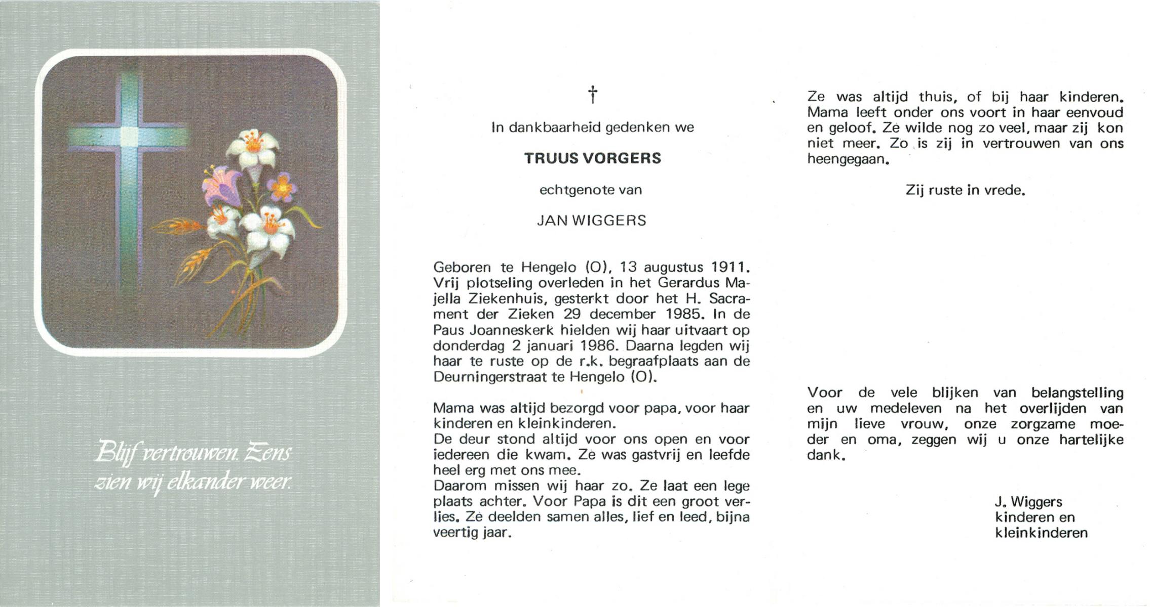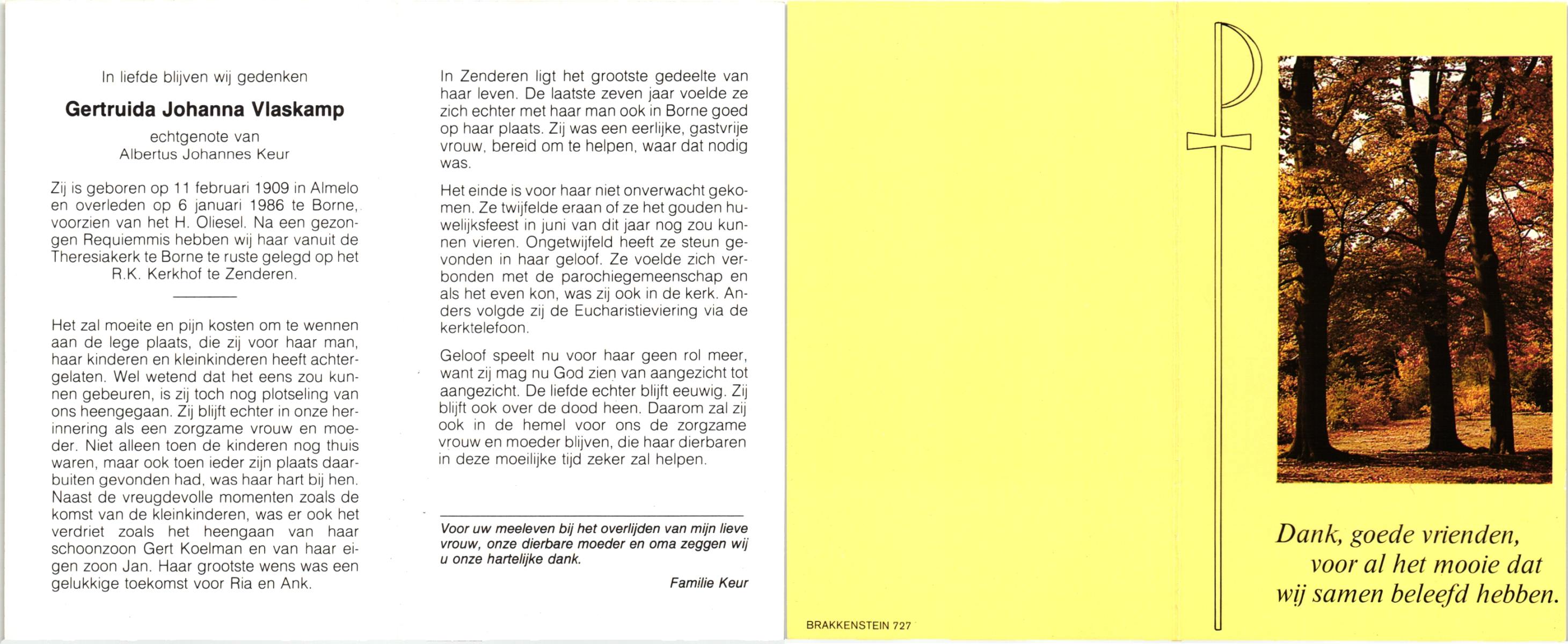 VLASKAMP, , Gertruida Johanna, geboren op 11-2-1909 te Almelo, overleden op 6-1-1986 te Borne op 76-jarige leeftijd, begraven te Zenderen.