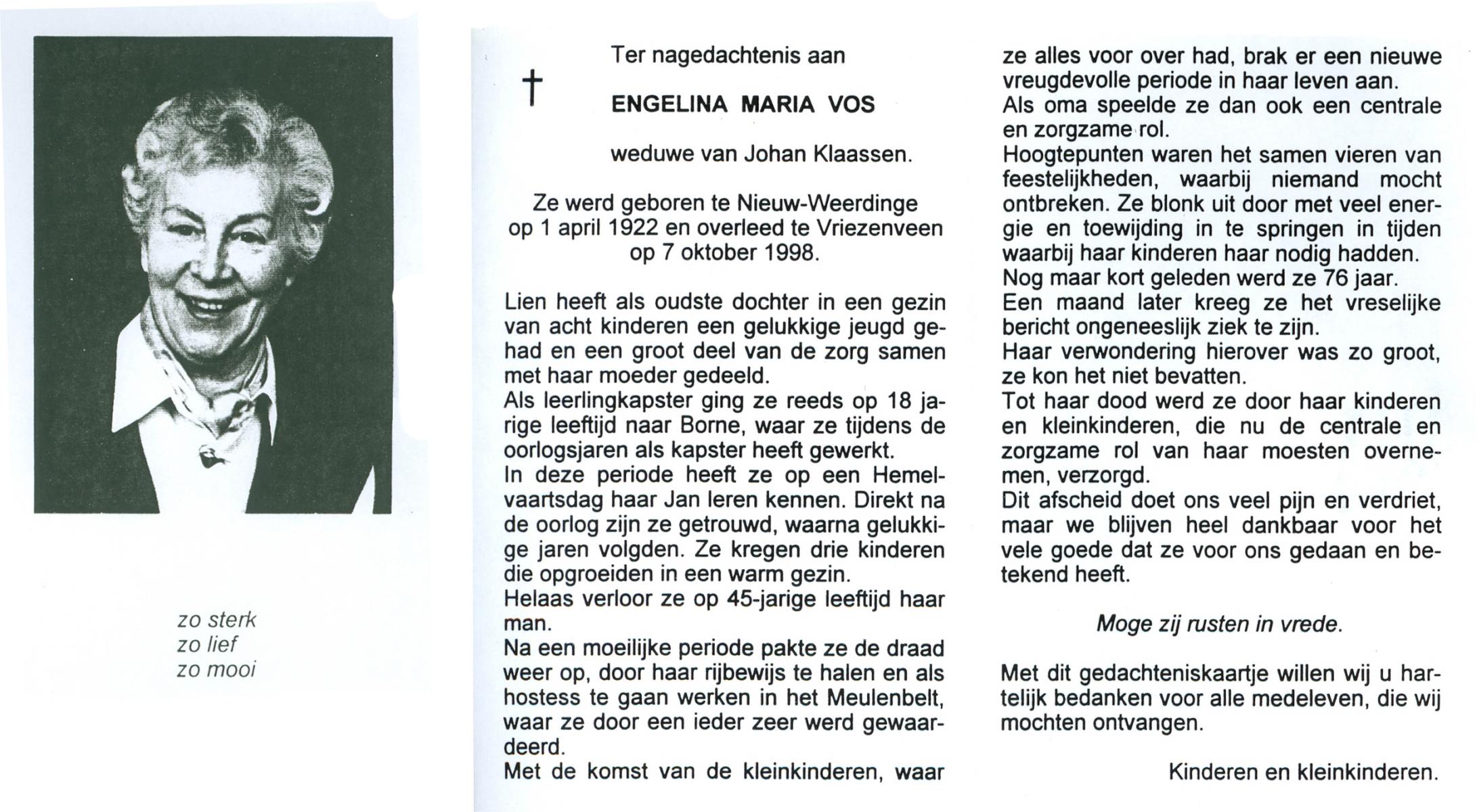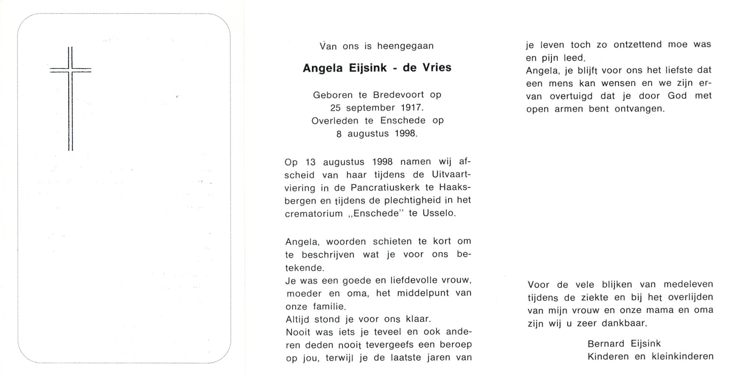 VRIES, de, Angela, geboren op 25-9-1917 te Bredevoort, overleden op 8-8-1998 te Enschede op 80-jarige leeftijd, gecremeerd op 13-8-1998 te Usselo.