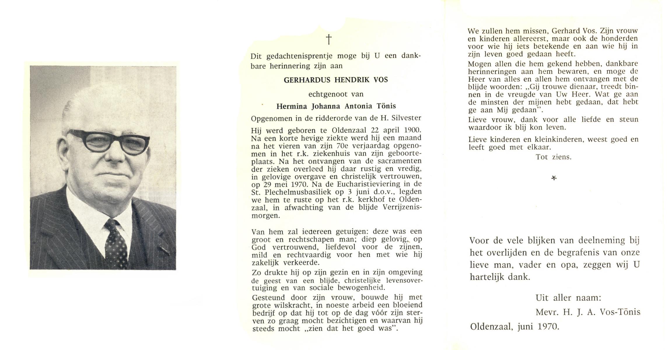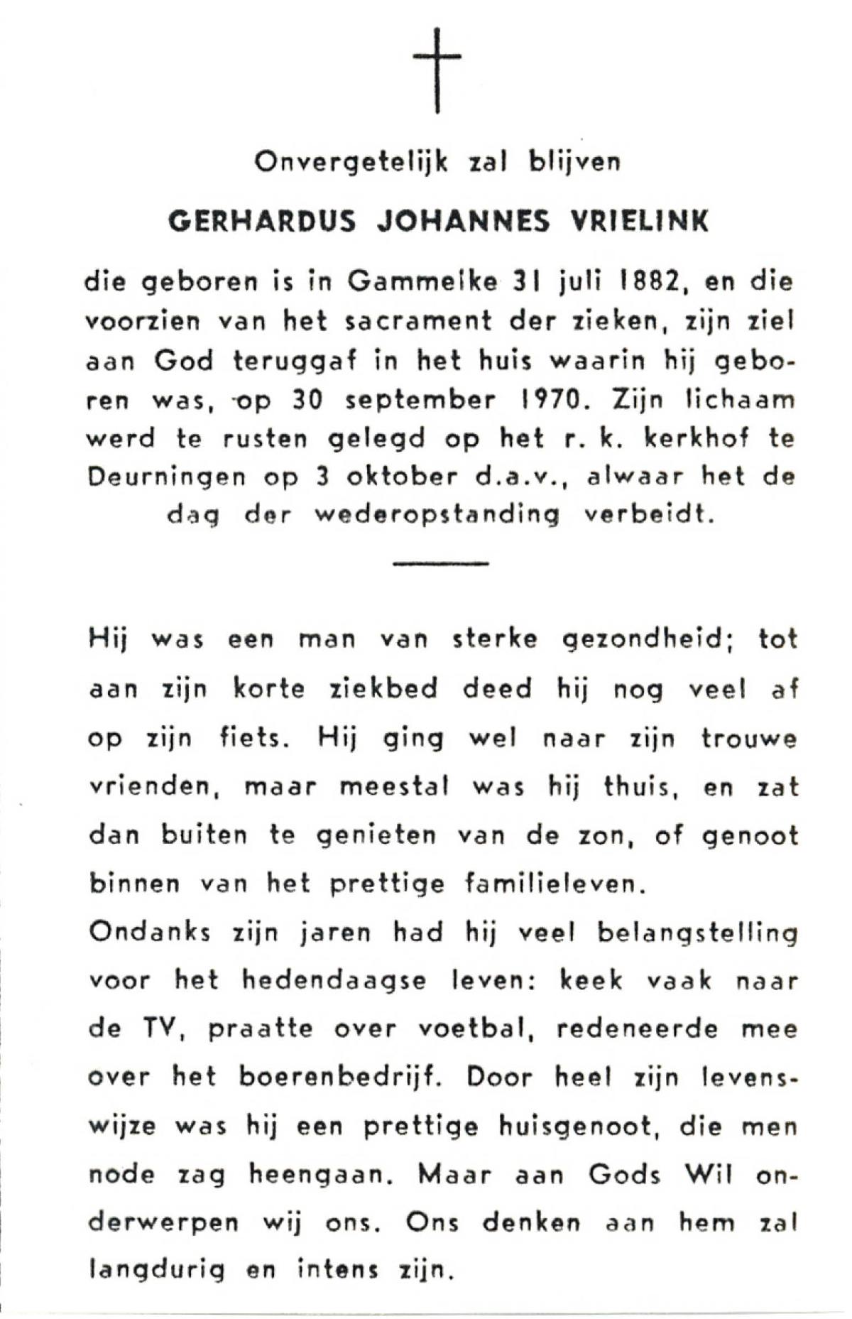 VRIELINK, Gerhardus Johannes, geboren op 31-07-1882 te Gammelke, overleden op 30-9-1970 op 88-jarige leeftijd, begraven op 3-10-1970 te Deurningen.