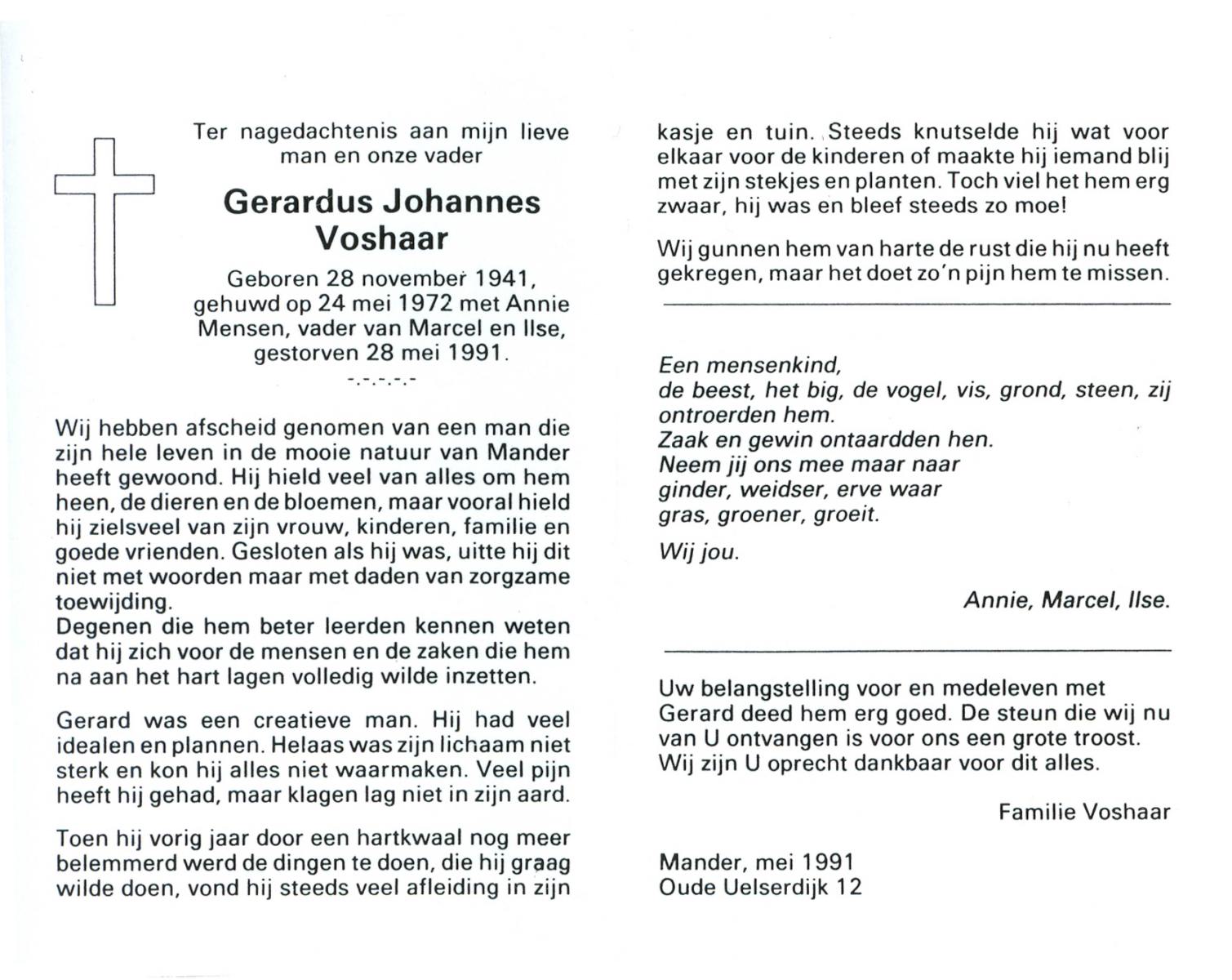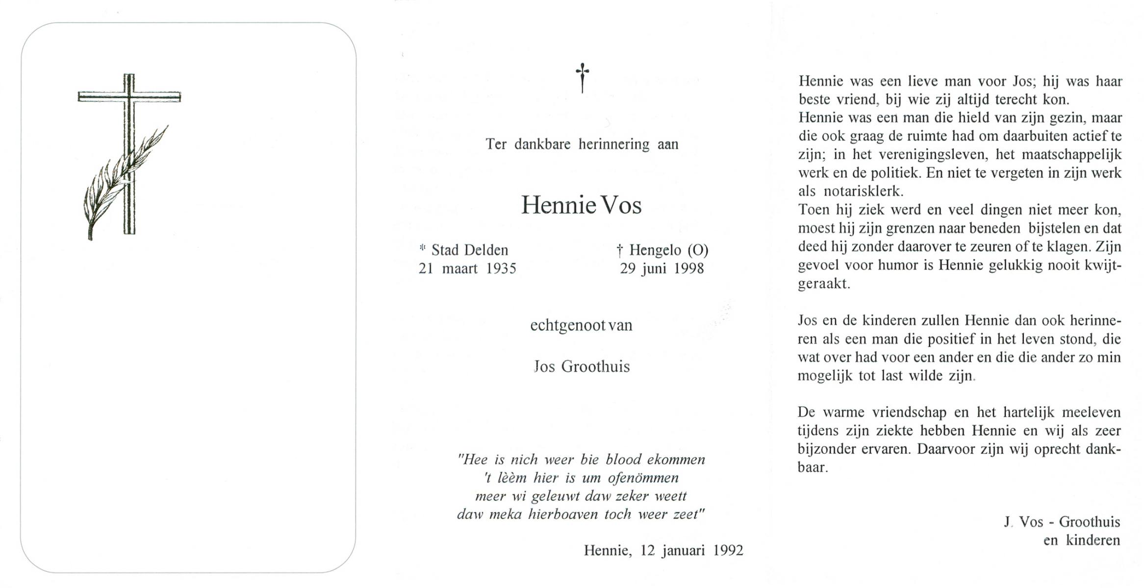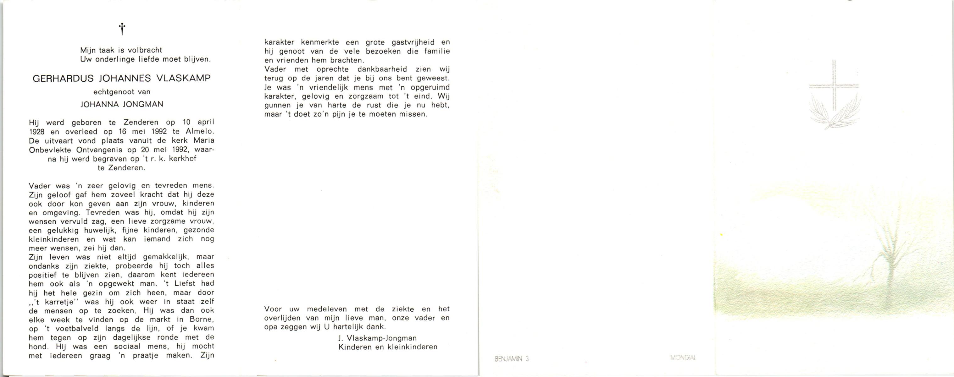 VLASKAMP, Gerhardus Johannes, geboren op 10-4-1928 te Zenderen, overleden op 16-5-1992 te Almelo op 64-jarige leeftijd, begraven op 20-5-1992 te Zenderen.