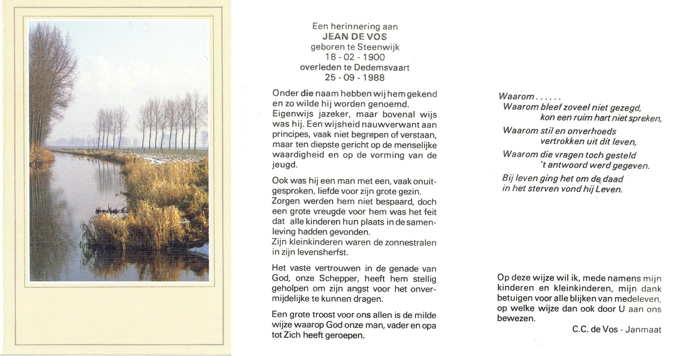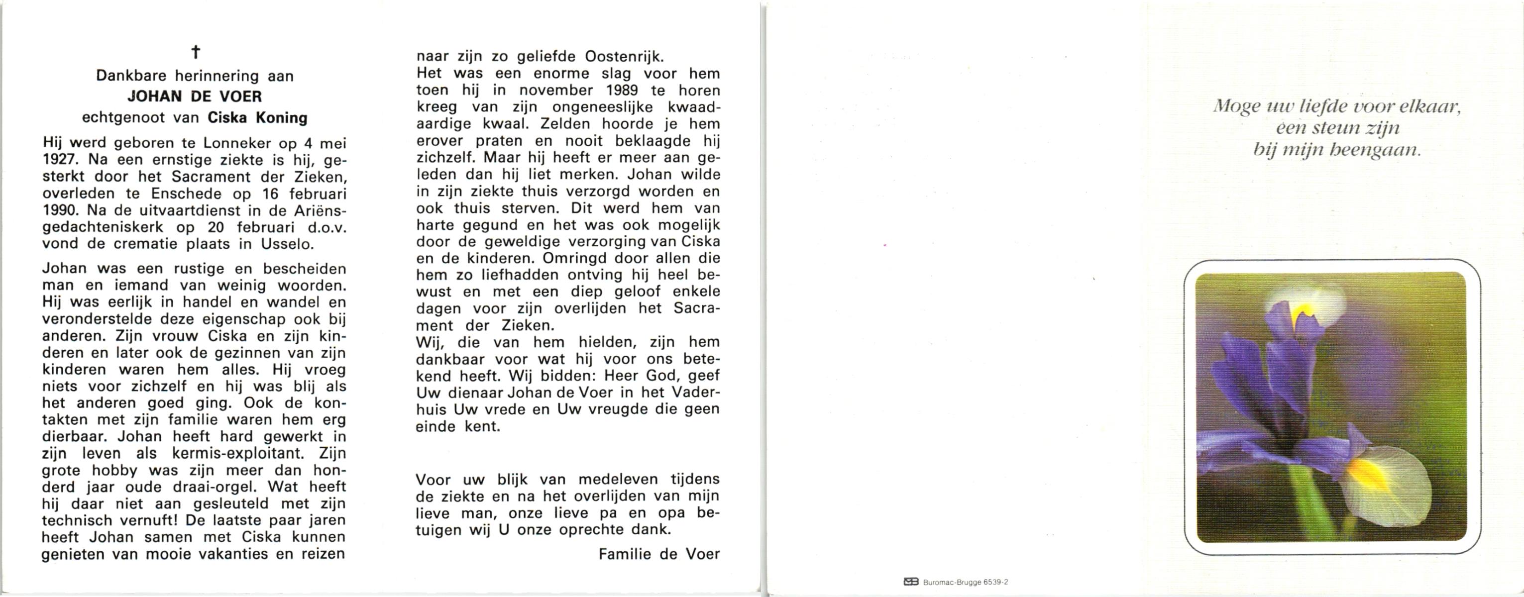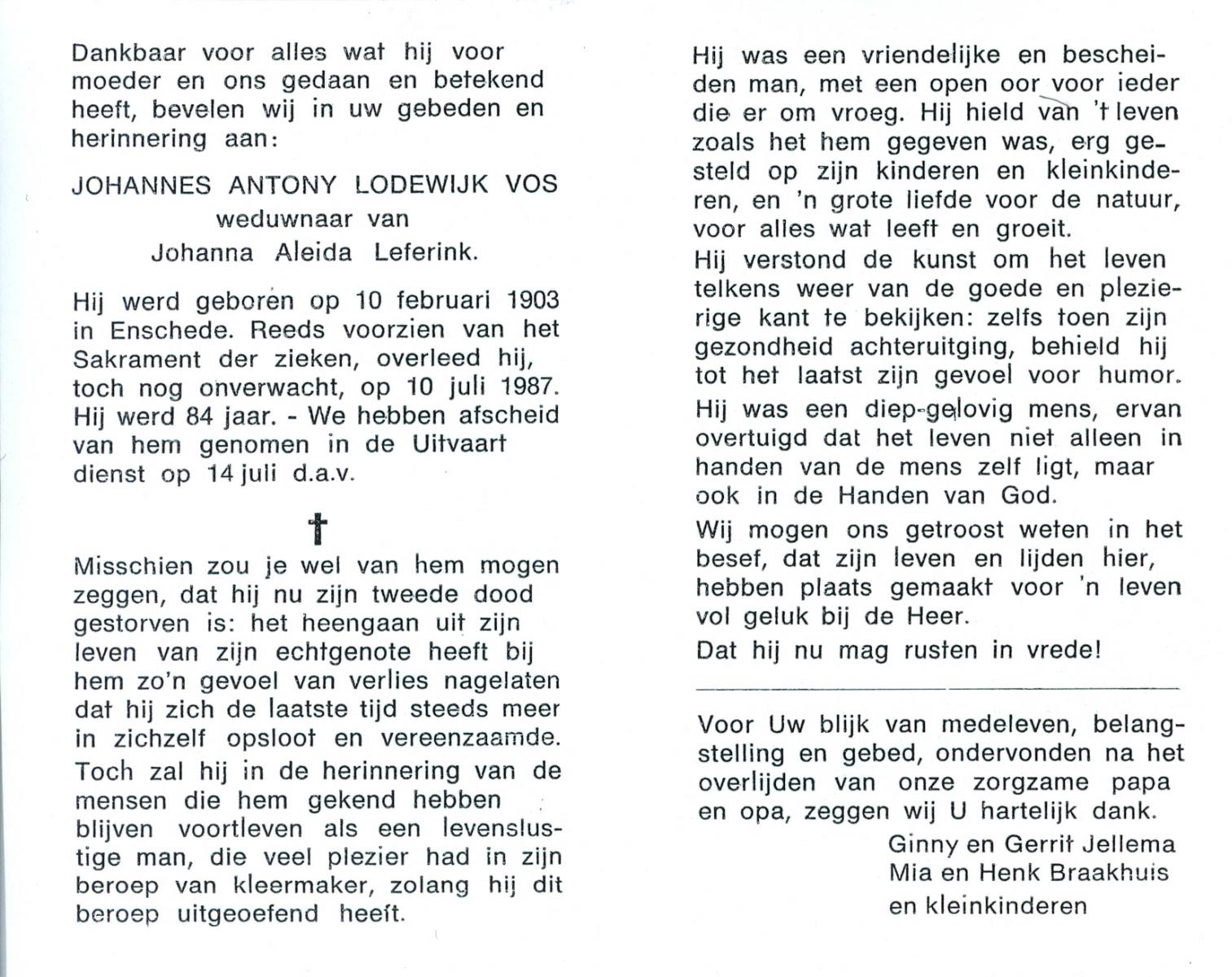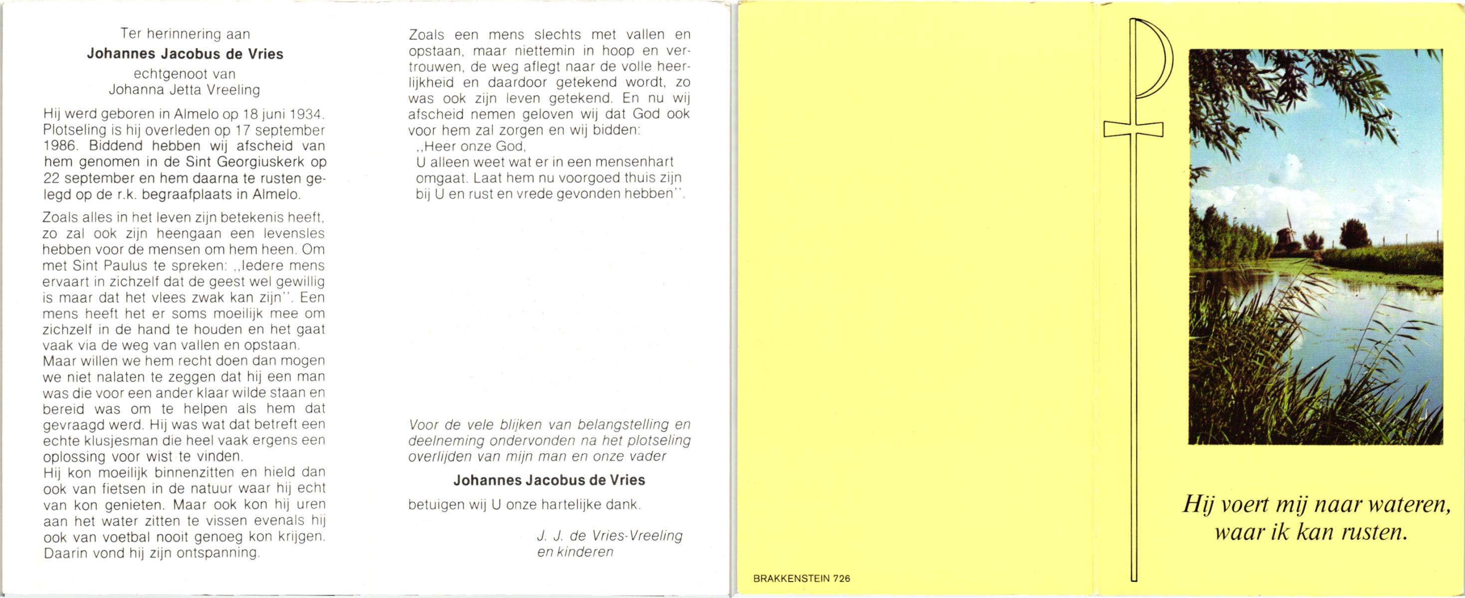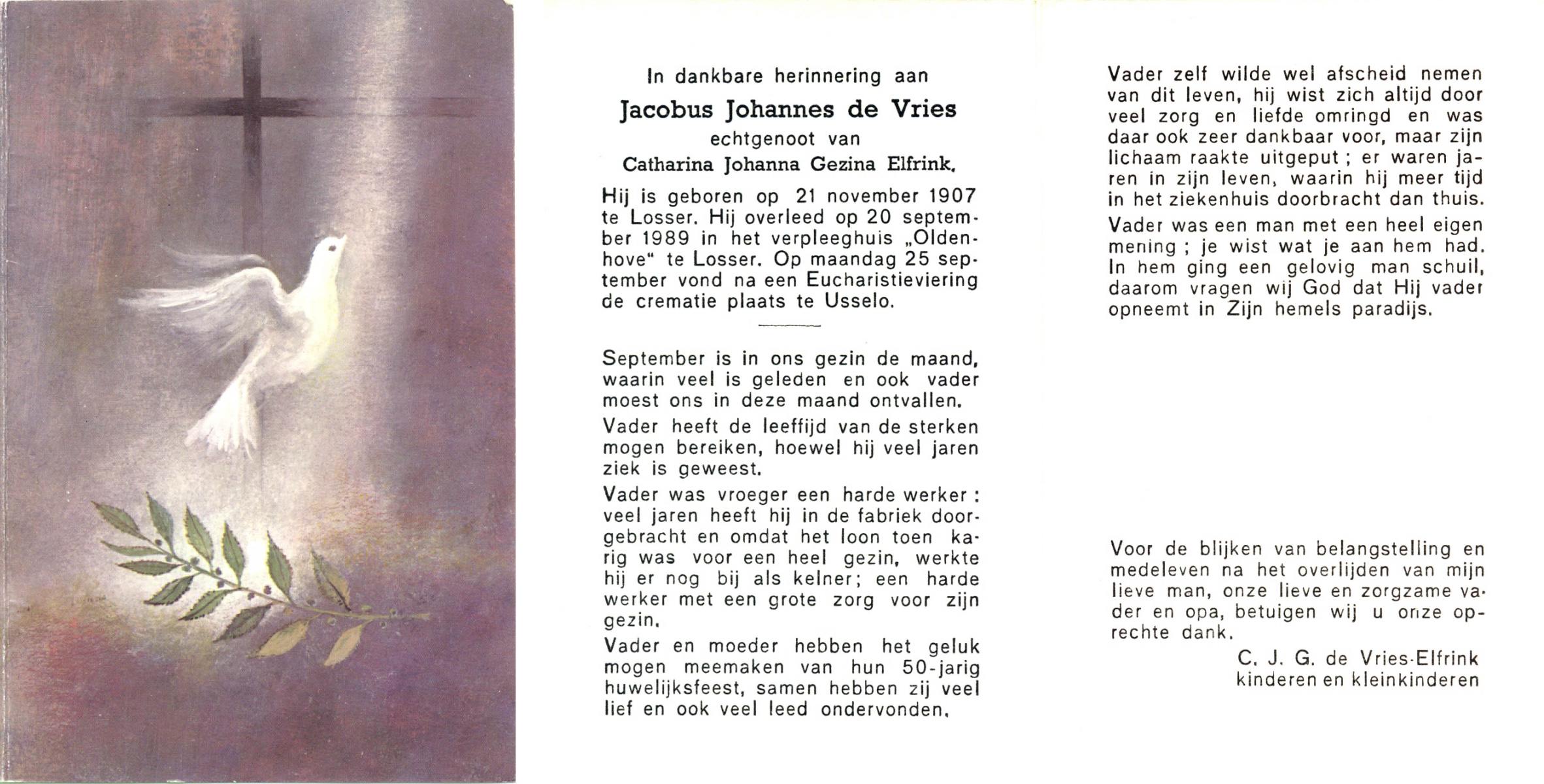 VRIES, de, Jacobus Johannes, geboren op 21-11-1907 te Losser, overleden op 20-9-1989 te Losser op 71-jarige leeftijd, gecremeerd op 25-9-1989 te Usselo.