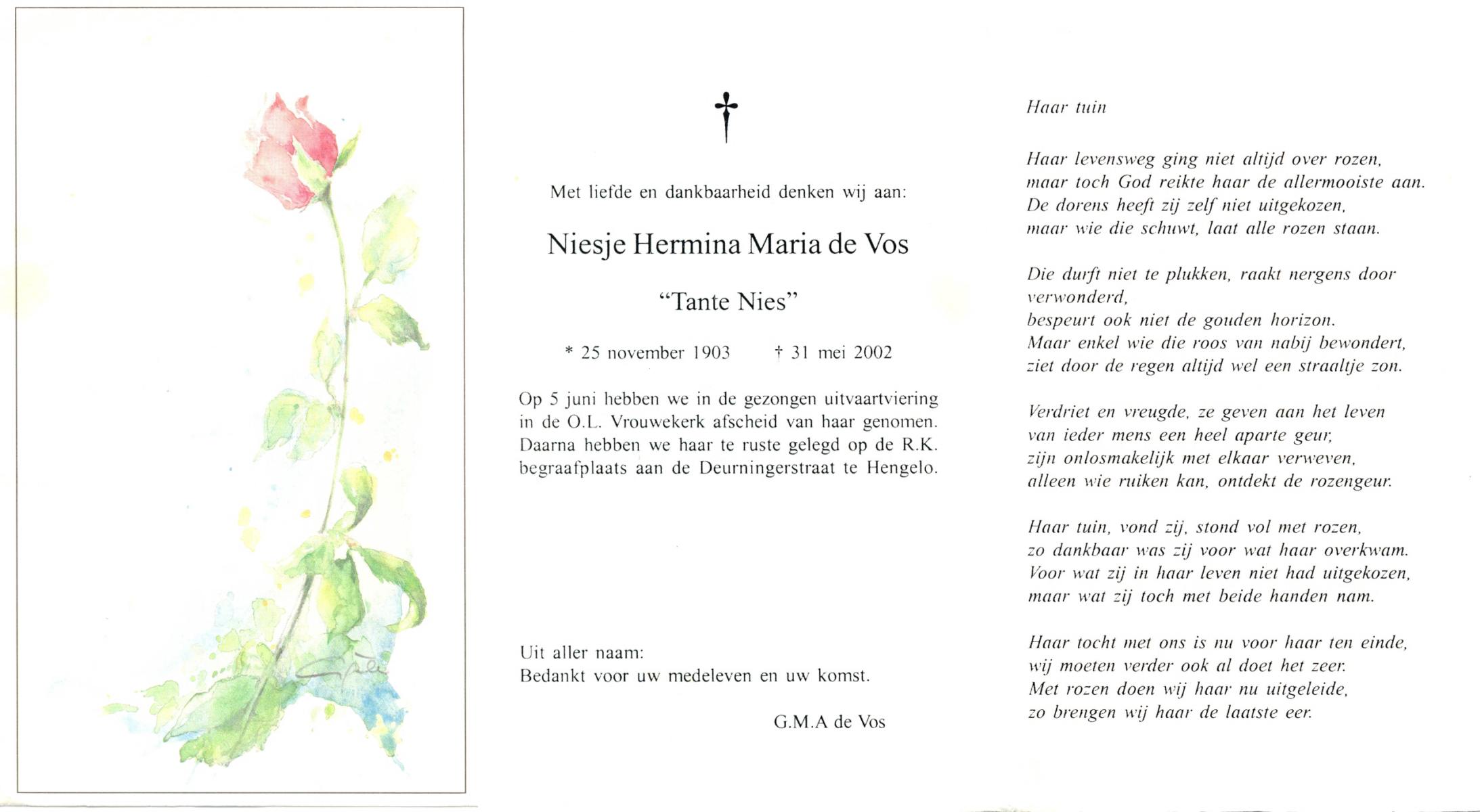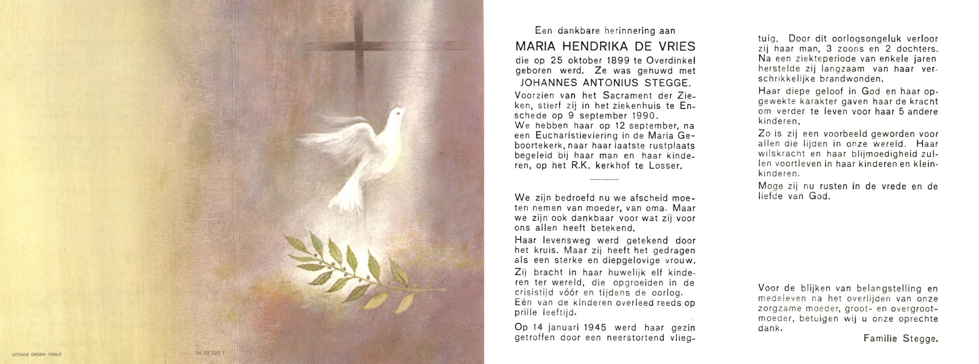 VRIES, de, Maria Hendrika, geboren op 25-10-1899 te Overdinkel, overleden op 9-9-1990 te Enschede op 90-jarige leeftijd, begraven op 12-9-1990 te Losser.