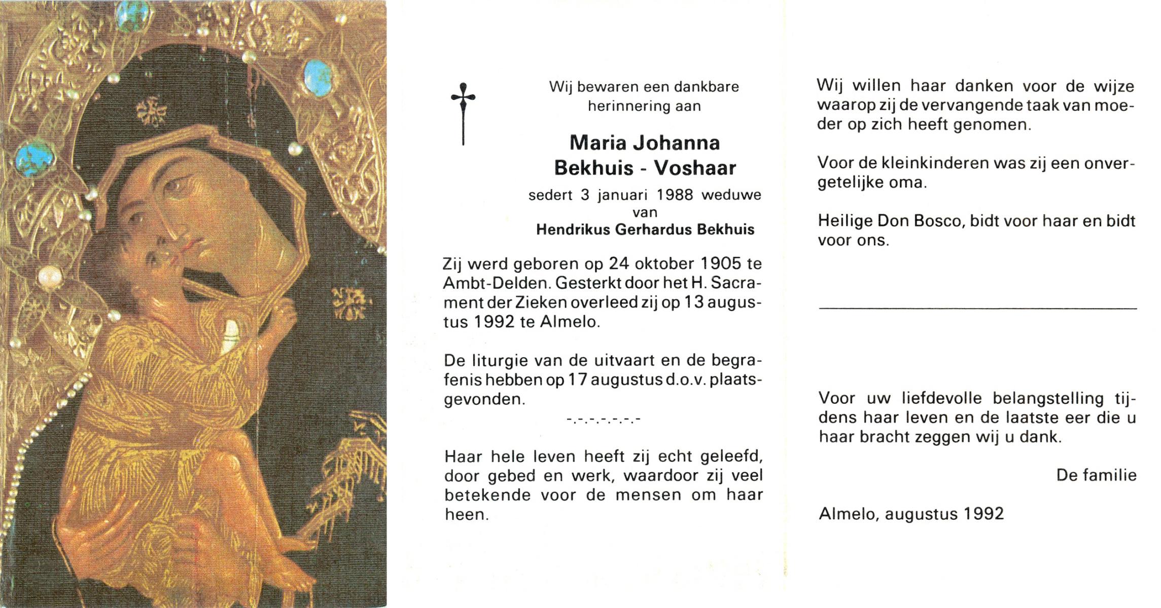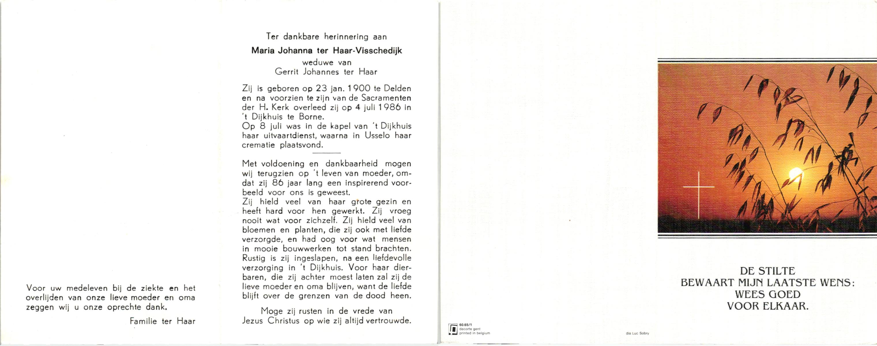 VISSCHEDIJK, , Maria Johanna, geboren op 23-1-1900 te Delden, overleden op 4-7-1986 te Borne op 86-jarige leeftijd, gecremeerd op 8-7-1986 te Usselo.