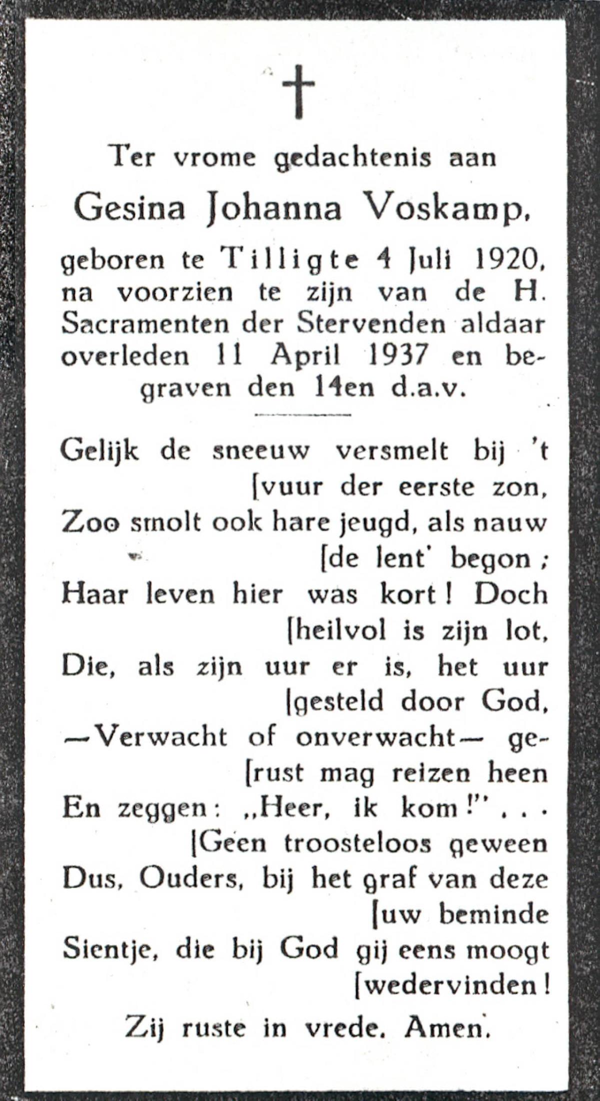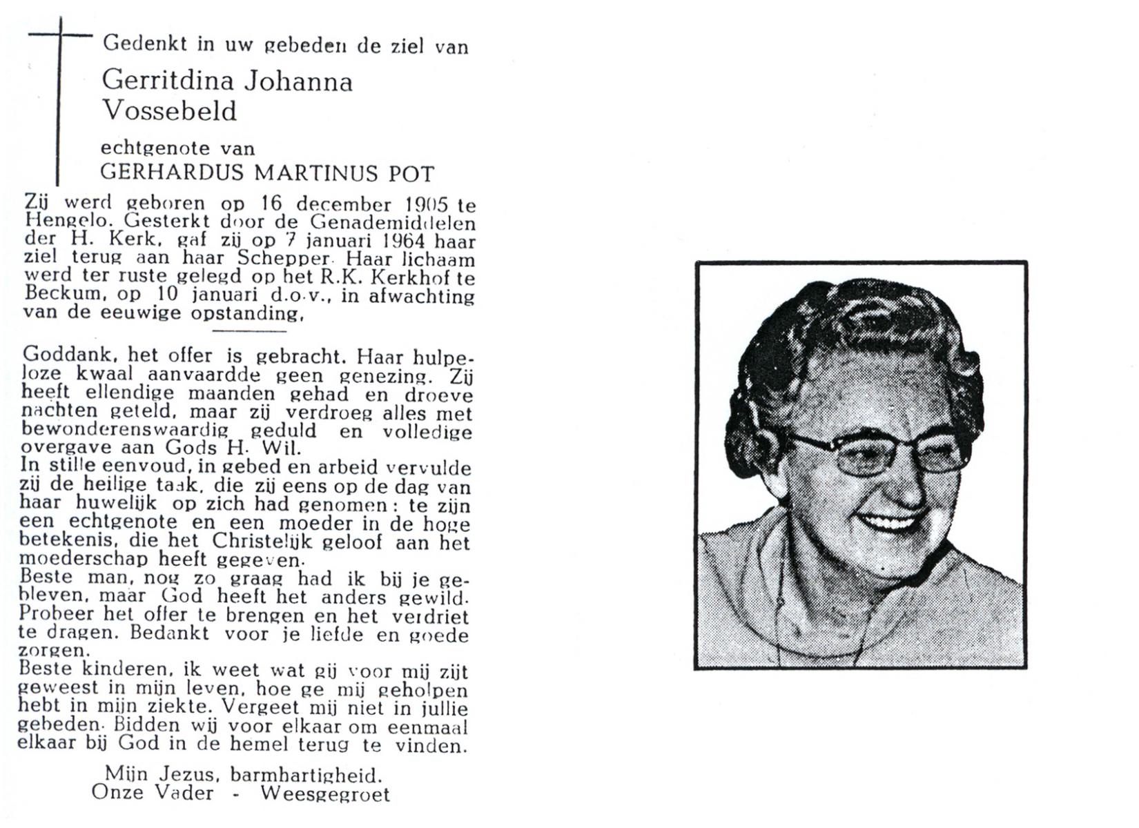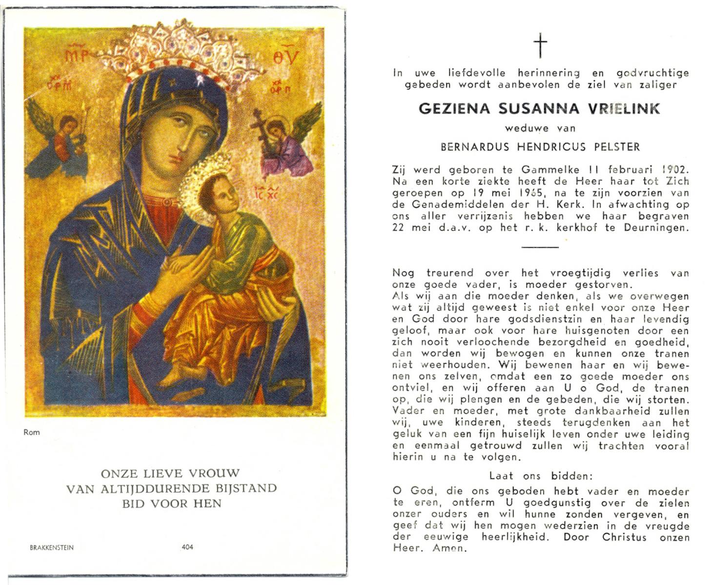 VRIELINK, Geziena Susanna, geboren op 11-2-1902 te Gammelke, overleden op 19-5-1965 op 63-jarige leeftijd, begraven op 22-5-1965 te Deurningen.