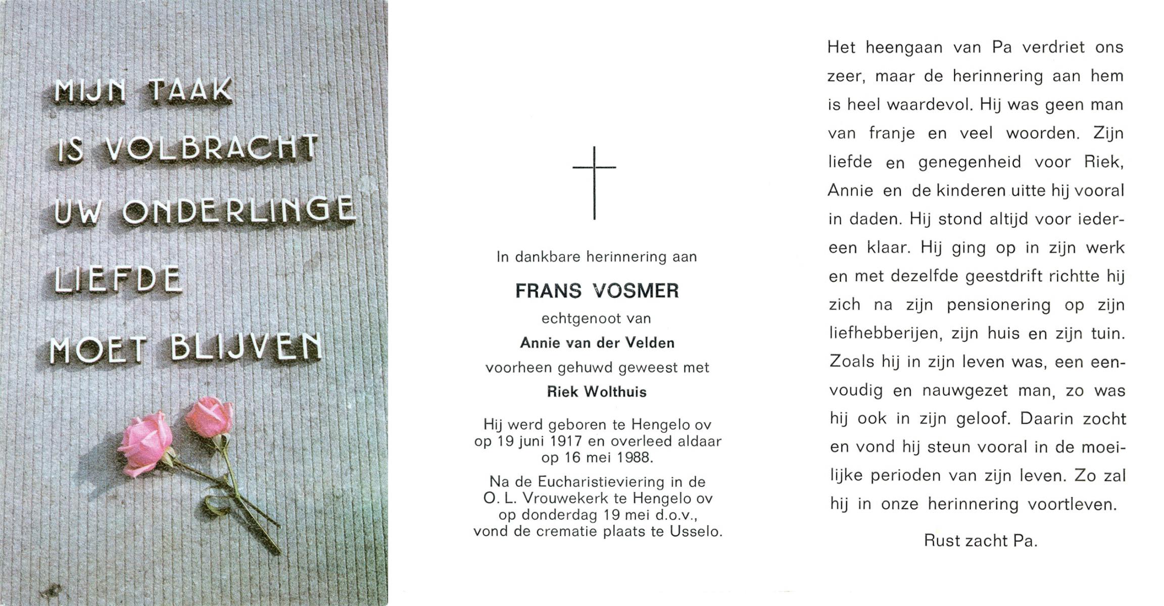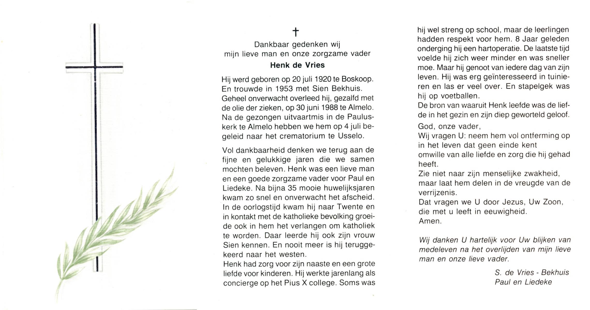 VRIES, de, Henk, geboren op 20-7-1920 te Boskoop, overleden op 30-6-1988 te Almelo op 67-jarige leeftijd, gecremeerd op 4-7-1988 te Usselo.