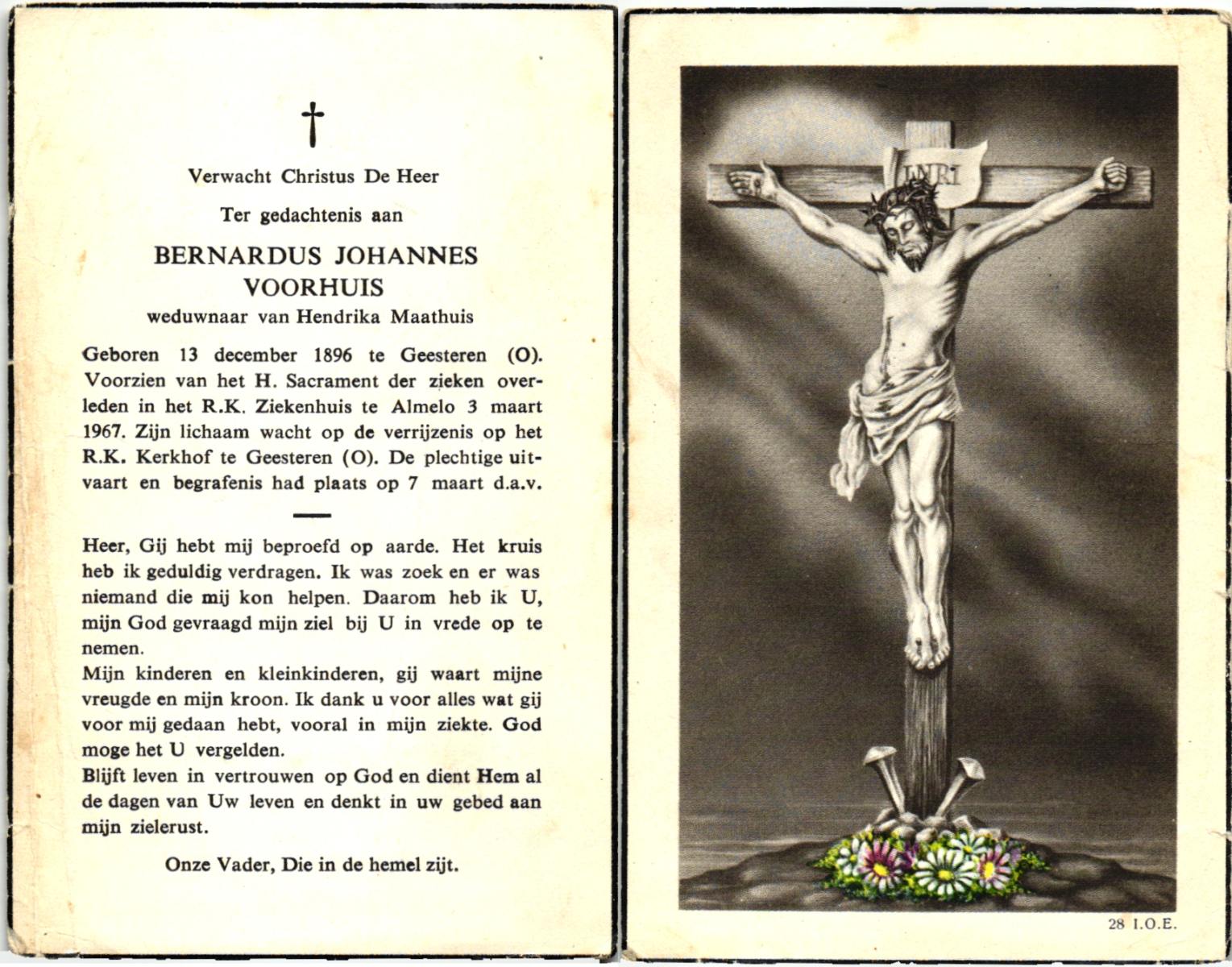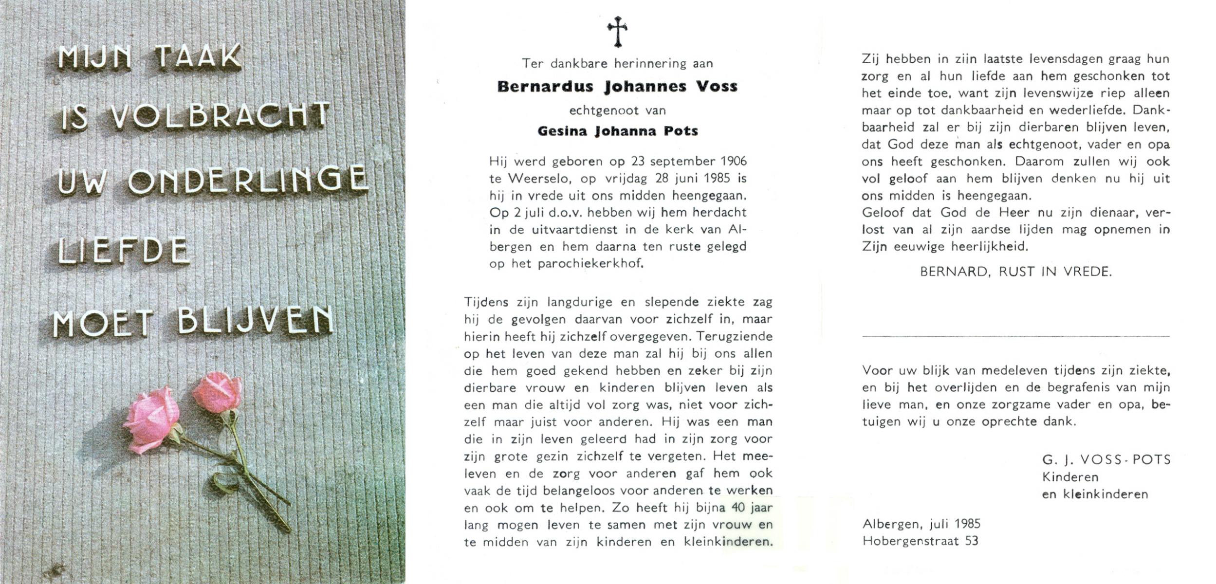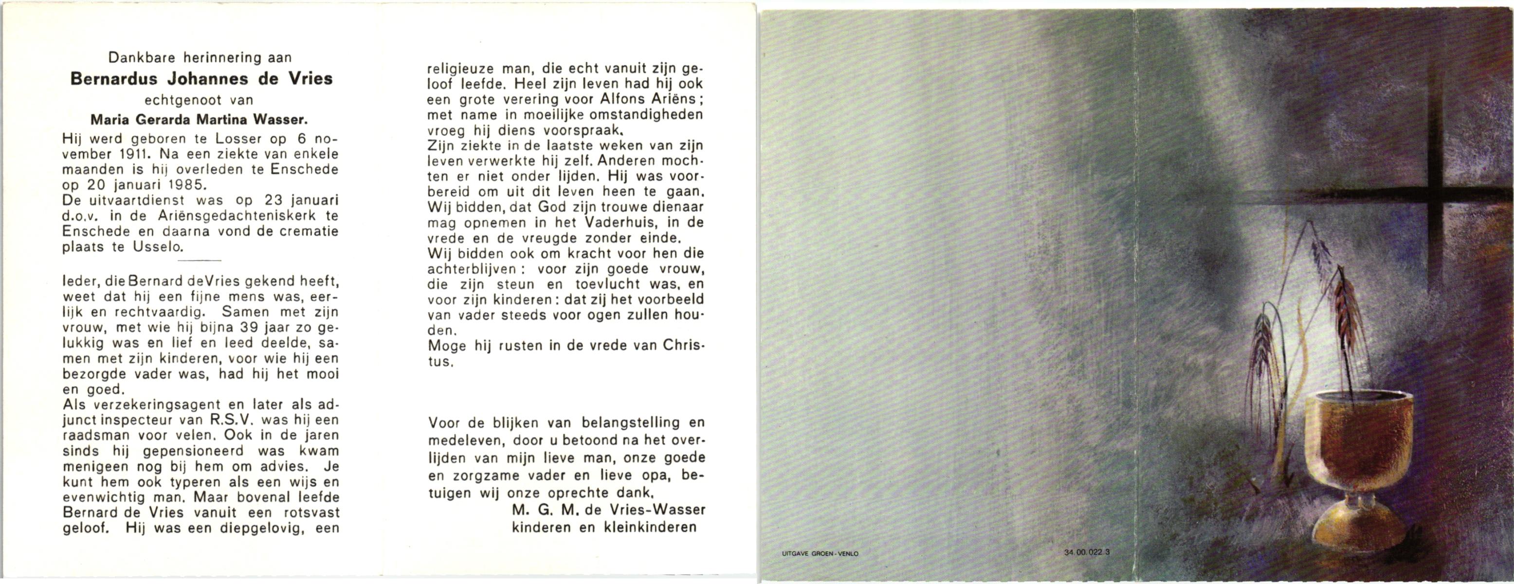 VRIES, de, Bernardus Johannes, geboren op 6-11-1911 te Losser, overleden op 20-1-1985 te Enschede op 73-jarige leeftijd, gecremeerd op 23-1-1985 te Usselo.