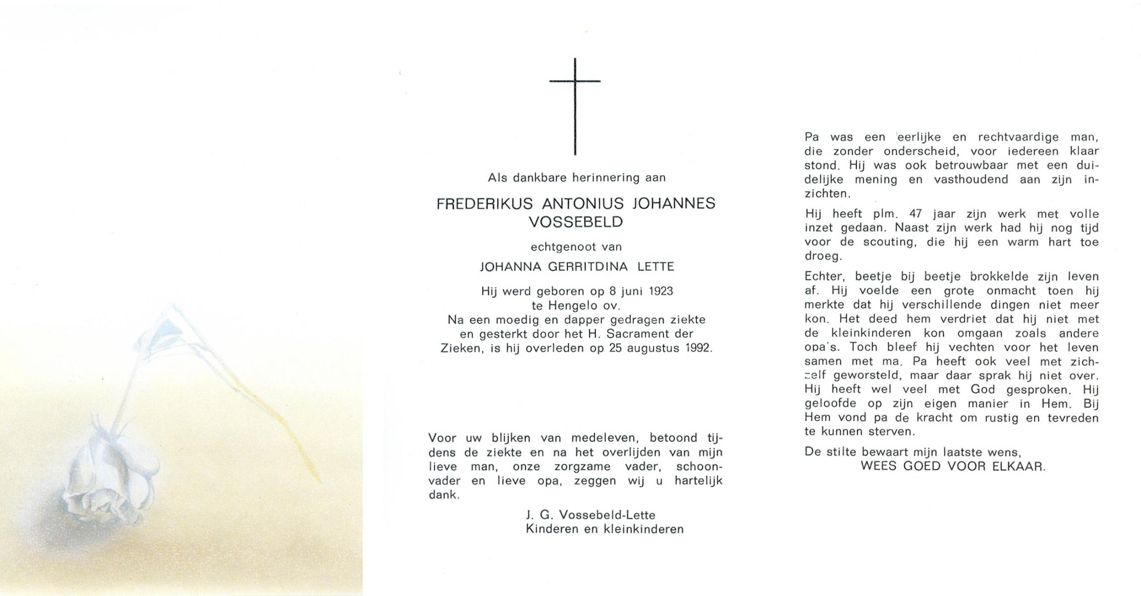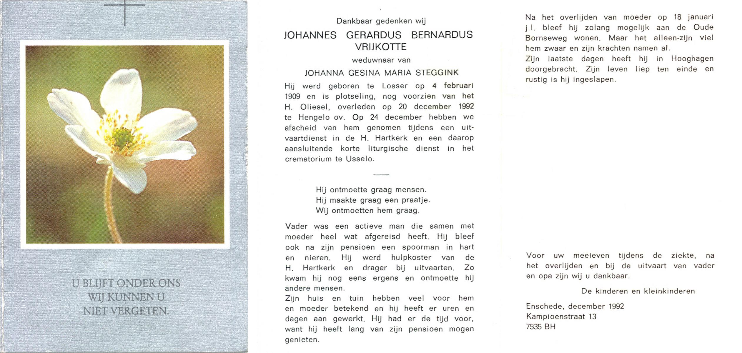 VRIJKOTTE, Johannes Gerardus Bernardus, geboren op 4-2-1909 te Losser, overleden op 20-12-1992 te Hengelo (Ov.) op 83-jarige leeftijd, gecremeerd op 24-12-1992 te Usselo.