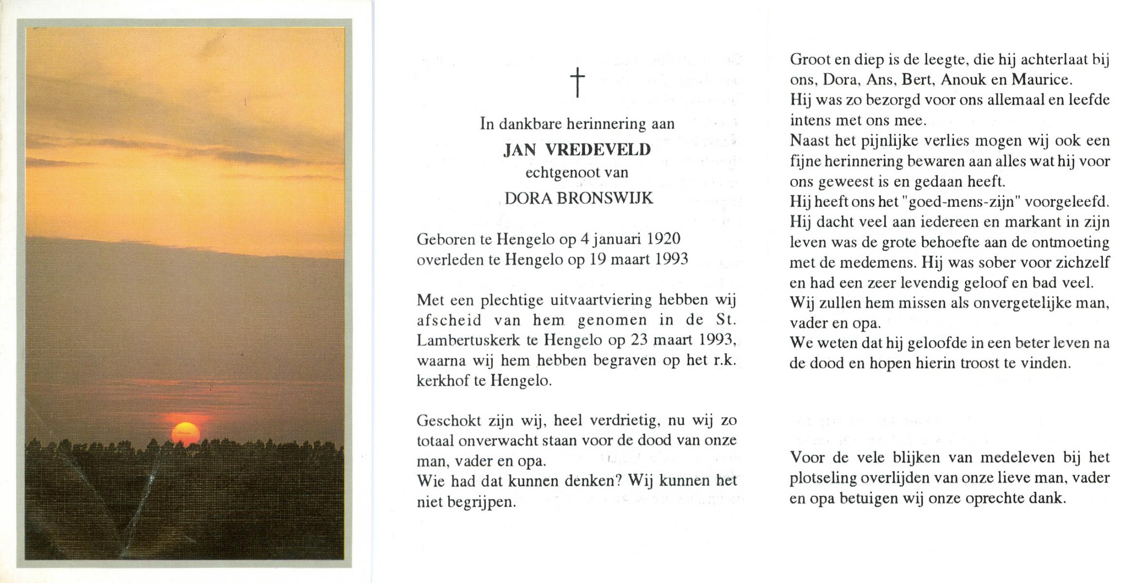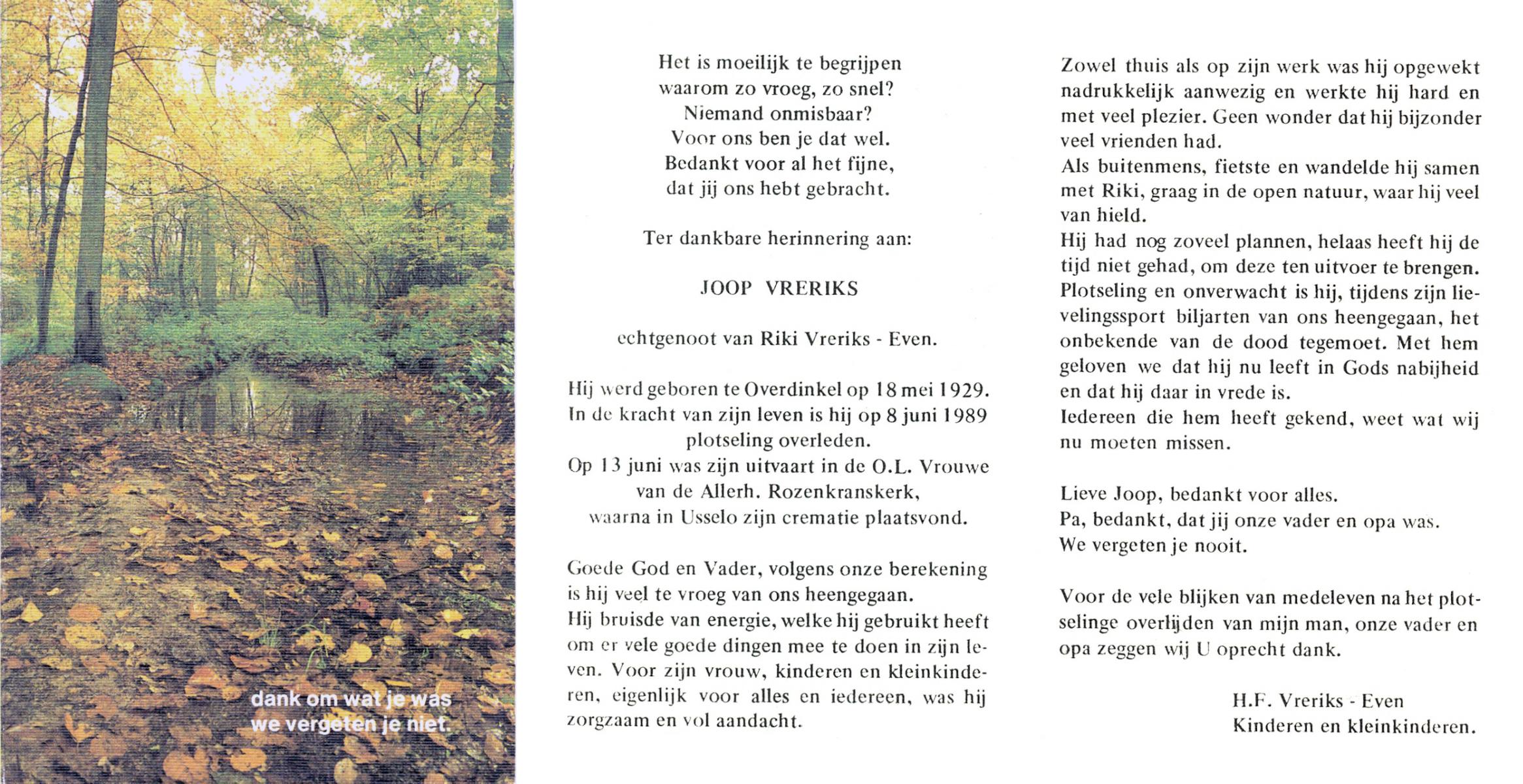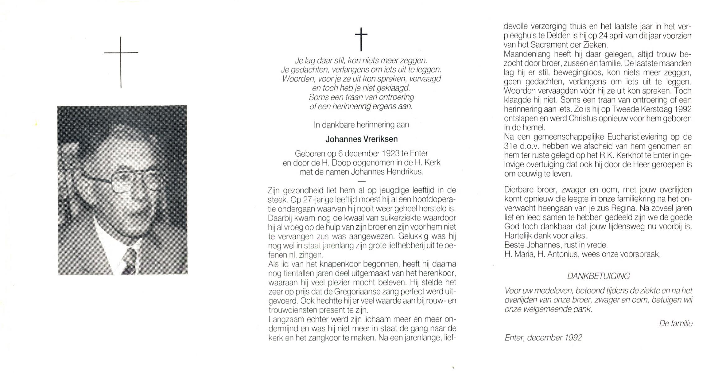 VRERIKSEN, Johannes, geboren op 6-12-1923 te Wierden, Enter, overleden op 26-12-1992 te Delden op 69-jarige leeftijd, begraven op 31-12-1992 te Wierden, Enter.