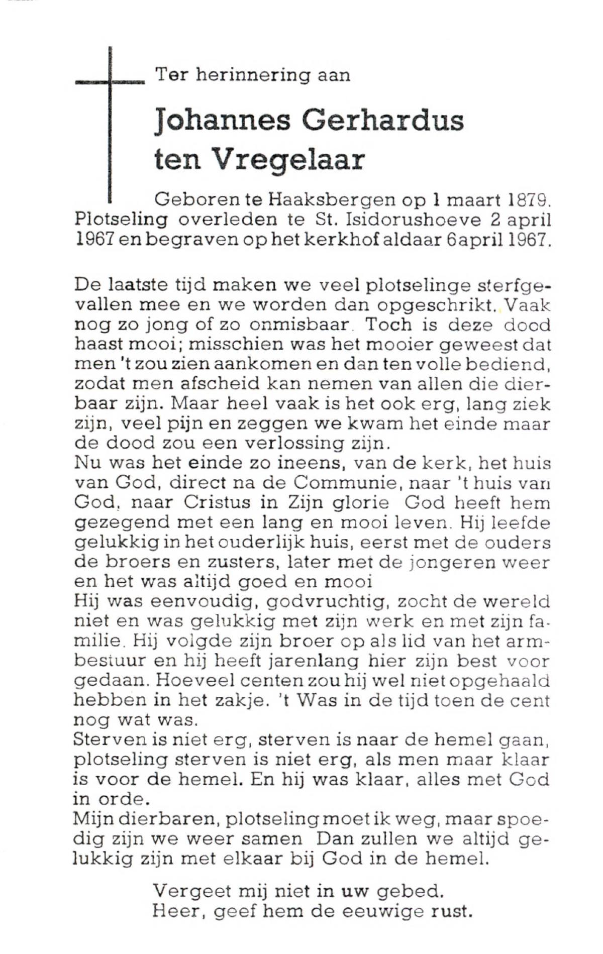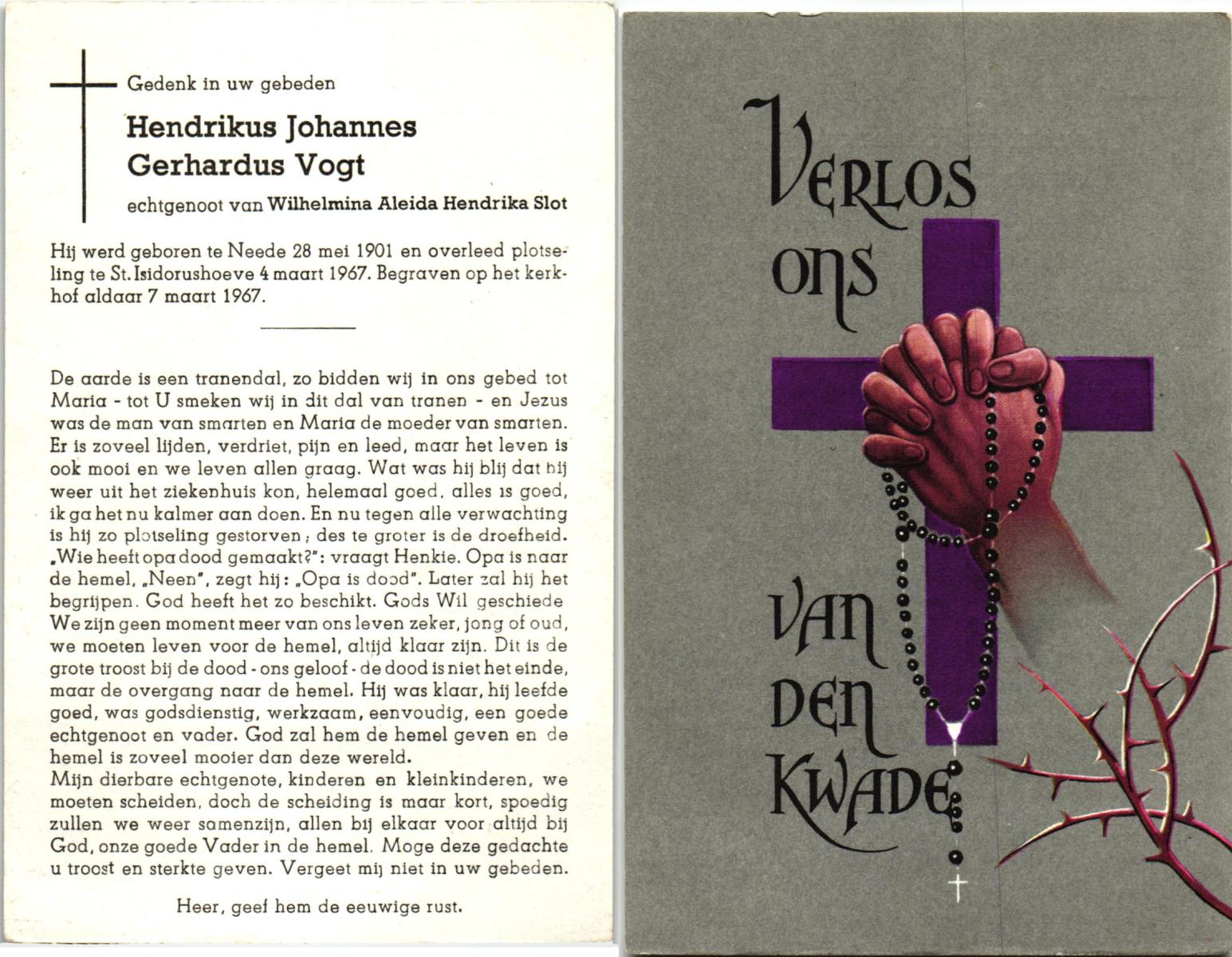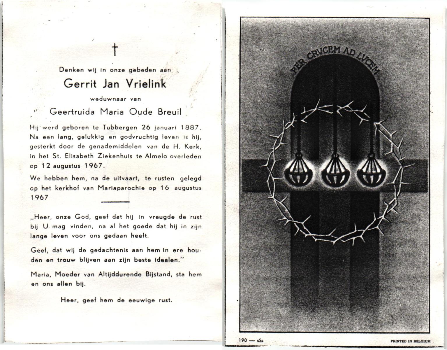 VRIELINK, Gerrit Jan, geboren op 26-01-1887 te Tubbergen, overleden op 12-8-1967 te Almelo, ziekenhuis op 80-jarige leeftijd, begraven op 16-8-1967 te Mariaparochie.