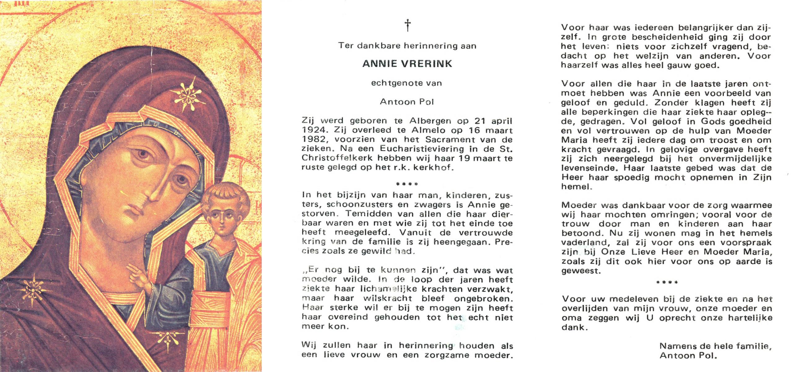 VRERINK, Annie, geboren op 21-4-1924 te Albergen, overleden op 16-3-1982 te Almelo op 57-jarige leeftijd, begraven op 19-3-1982 te Almelo.