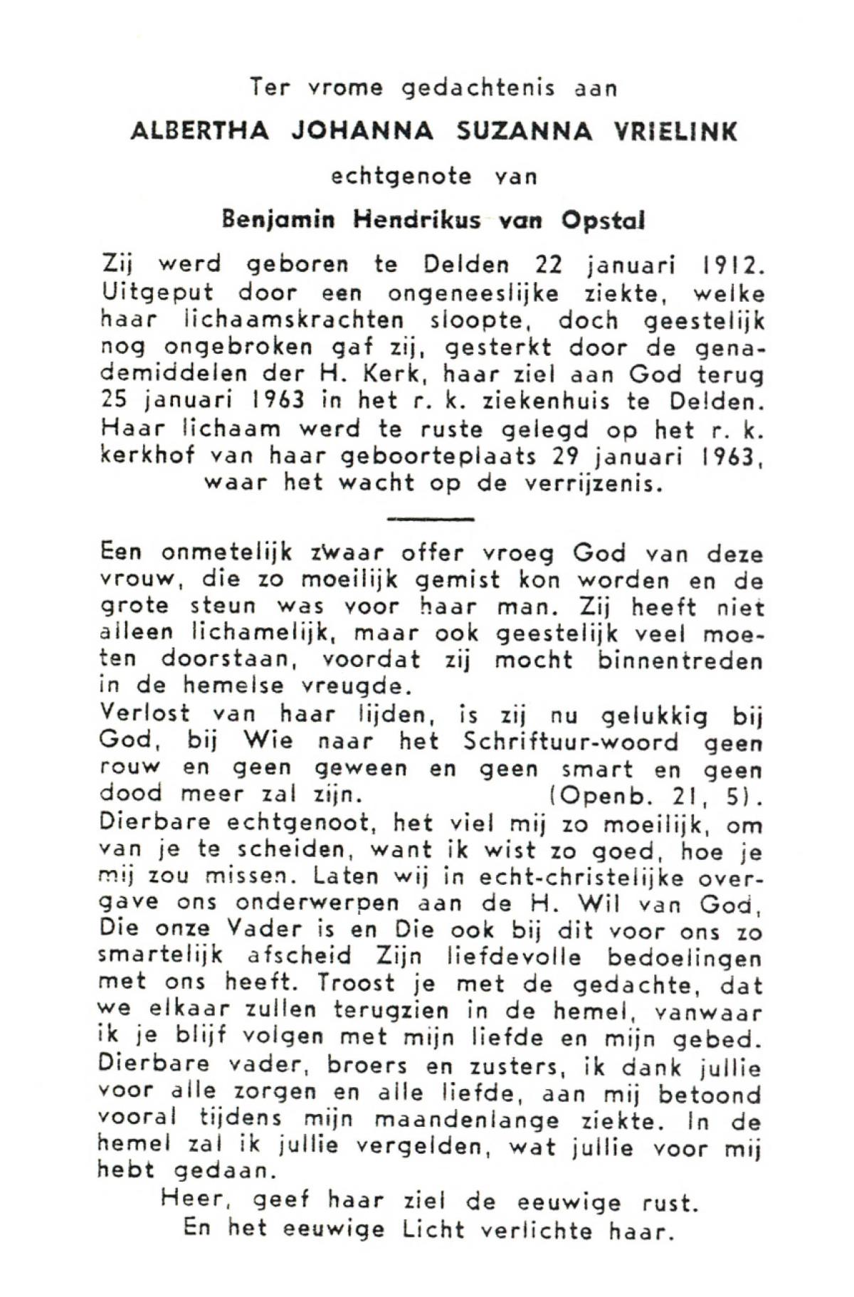 VRIELINK, Albertha Johanna Suzanna, geboren op 22-1-1912 te Delden, overleden op 25-1-1963 te Delden op 51-jarige leeftijd, begraven op 29-1-1963 te Delden.
