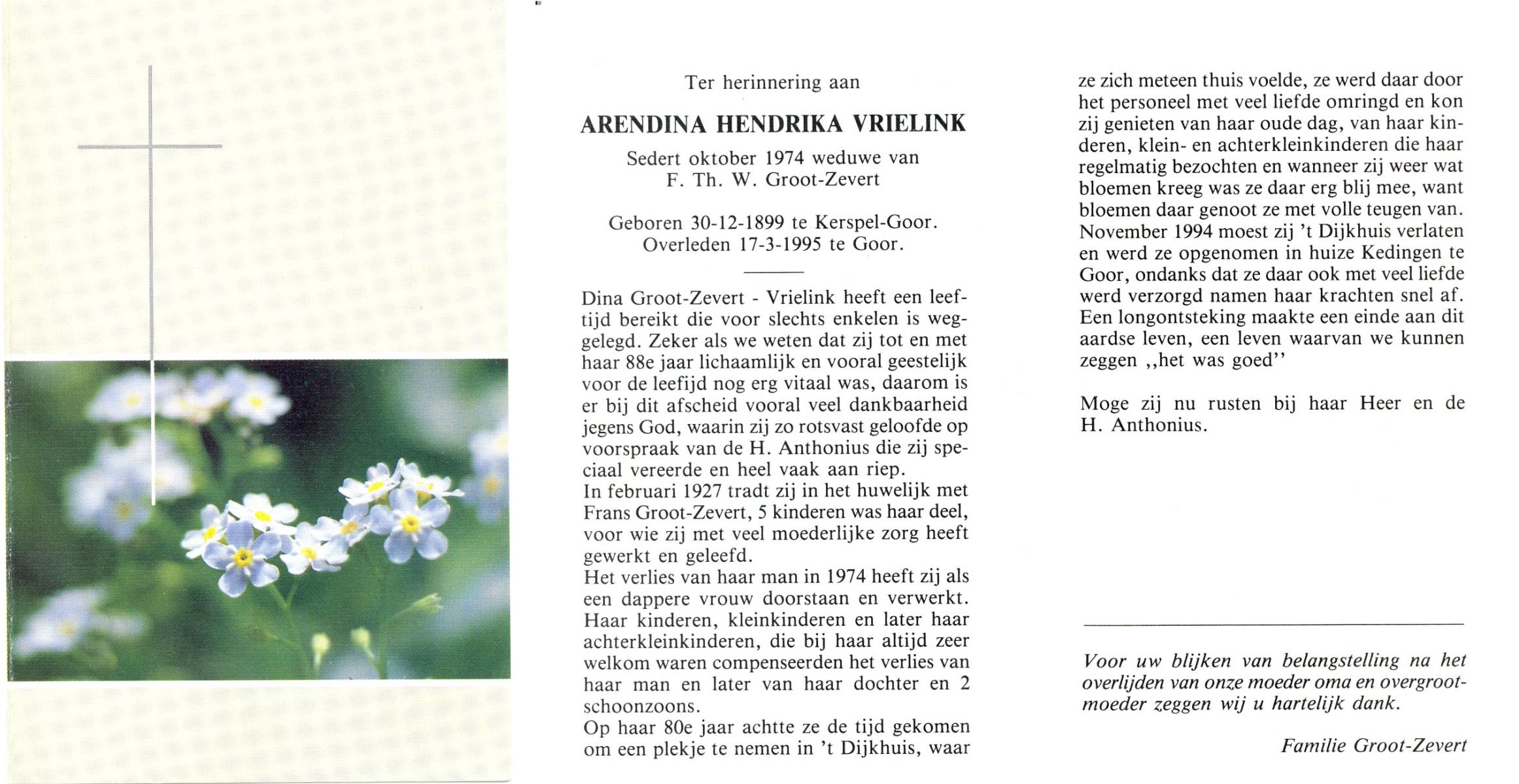 VRIELINK, Arendina Hendrika, geboren op 30-12-1899 te Kerspel Goor, overleden op 17-3-1995 te Goor op 95-jarige leeftijd.