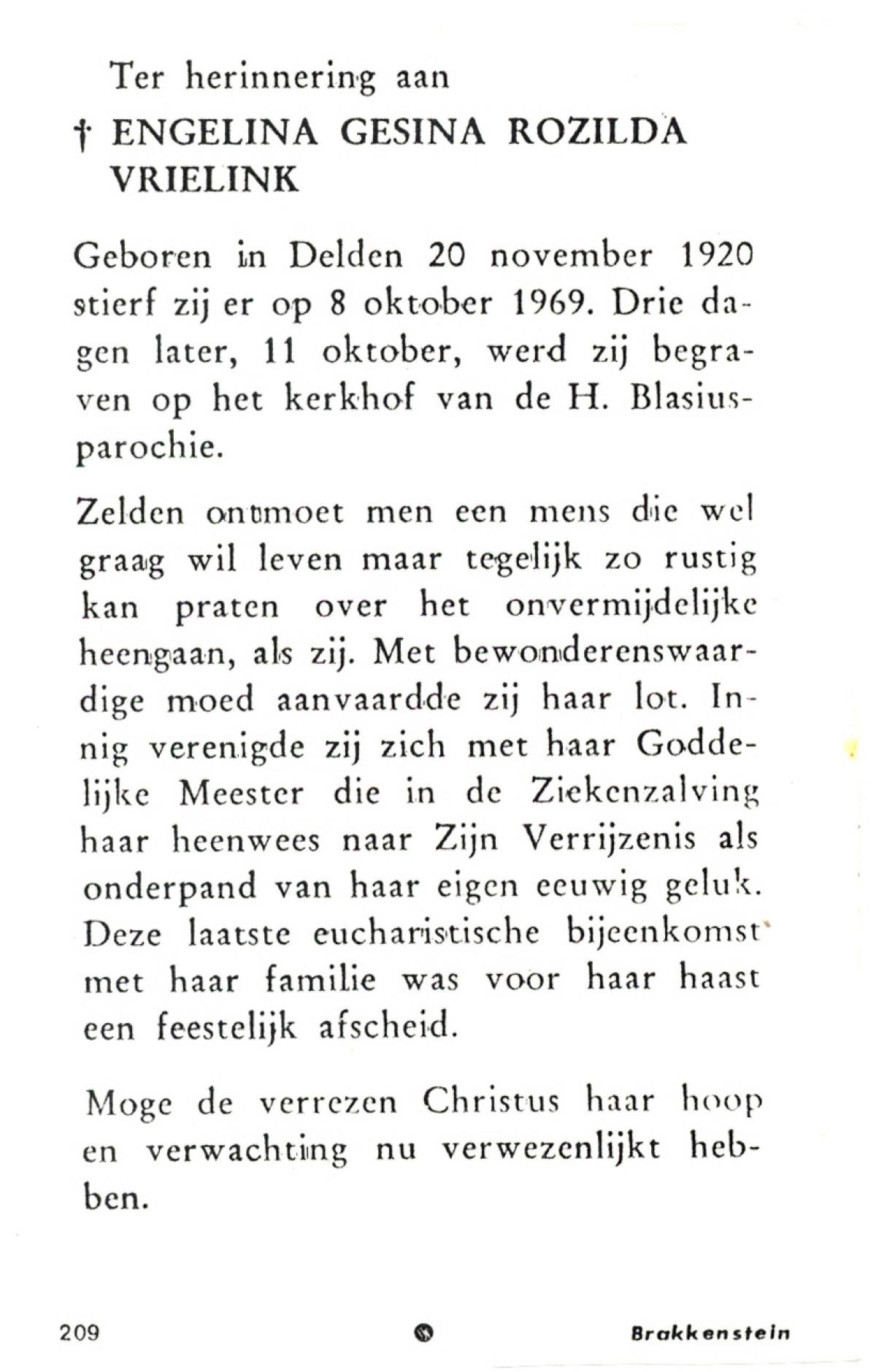 VRIELINK, Engelina Gesina Rozilda, geboren op 20-11-1920 te Delden, overleden op 8-10-1969 te Delden op 48-jarige leeftijd, begraven op 11-10-1969 te Delden.
