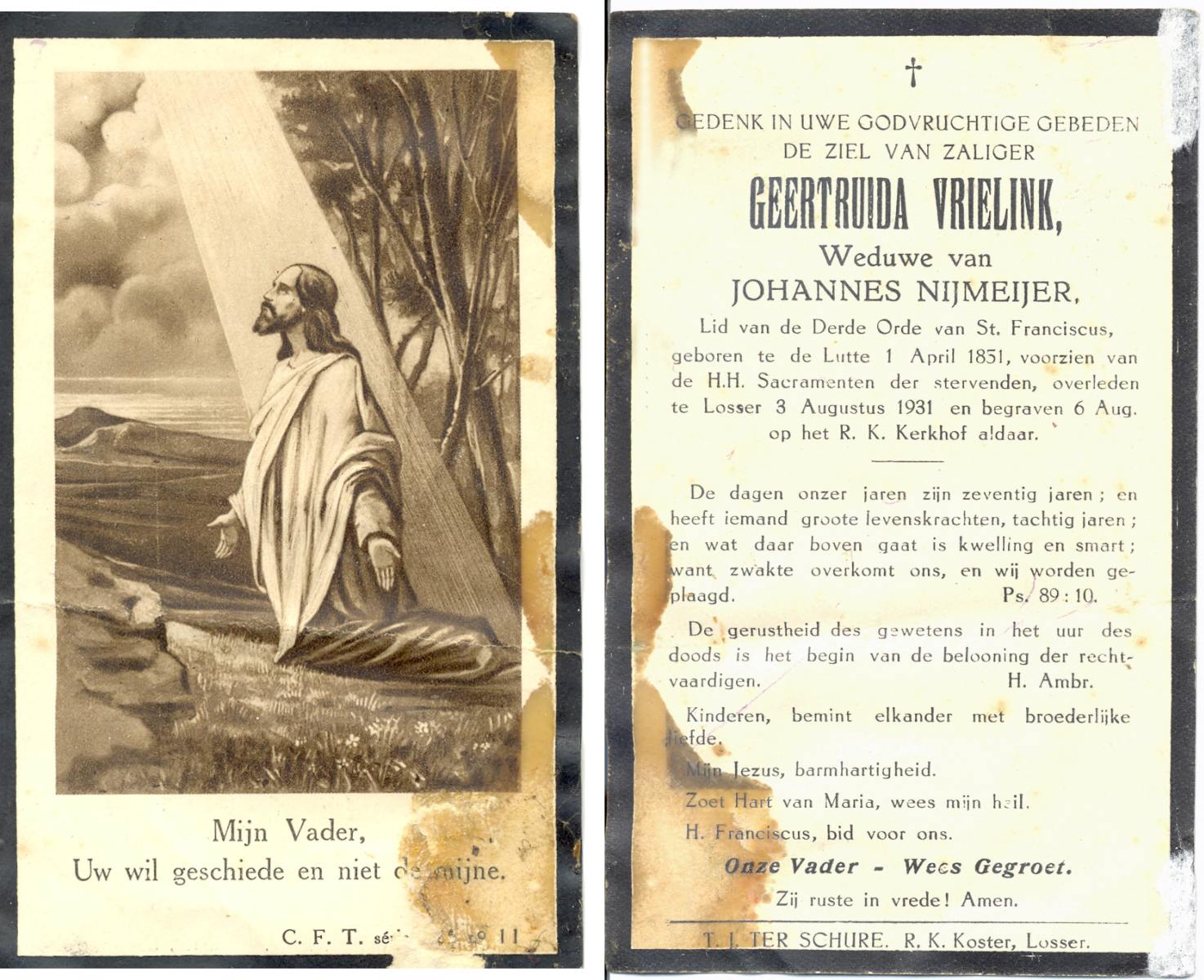 VRIELINK, Geertruida, geboren op 01-04-1851 te De Lutte, overleden op 3-8-1931 te Losser op 80-jarige leeftijd, begraven op 6-8-1931 te LOsser.