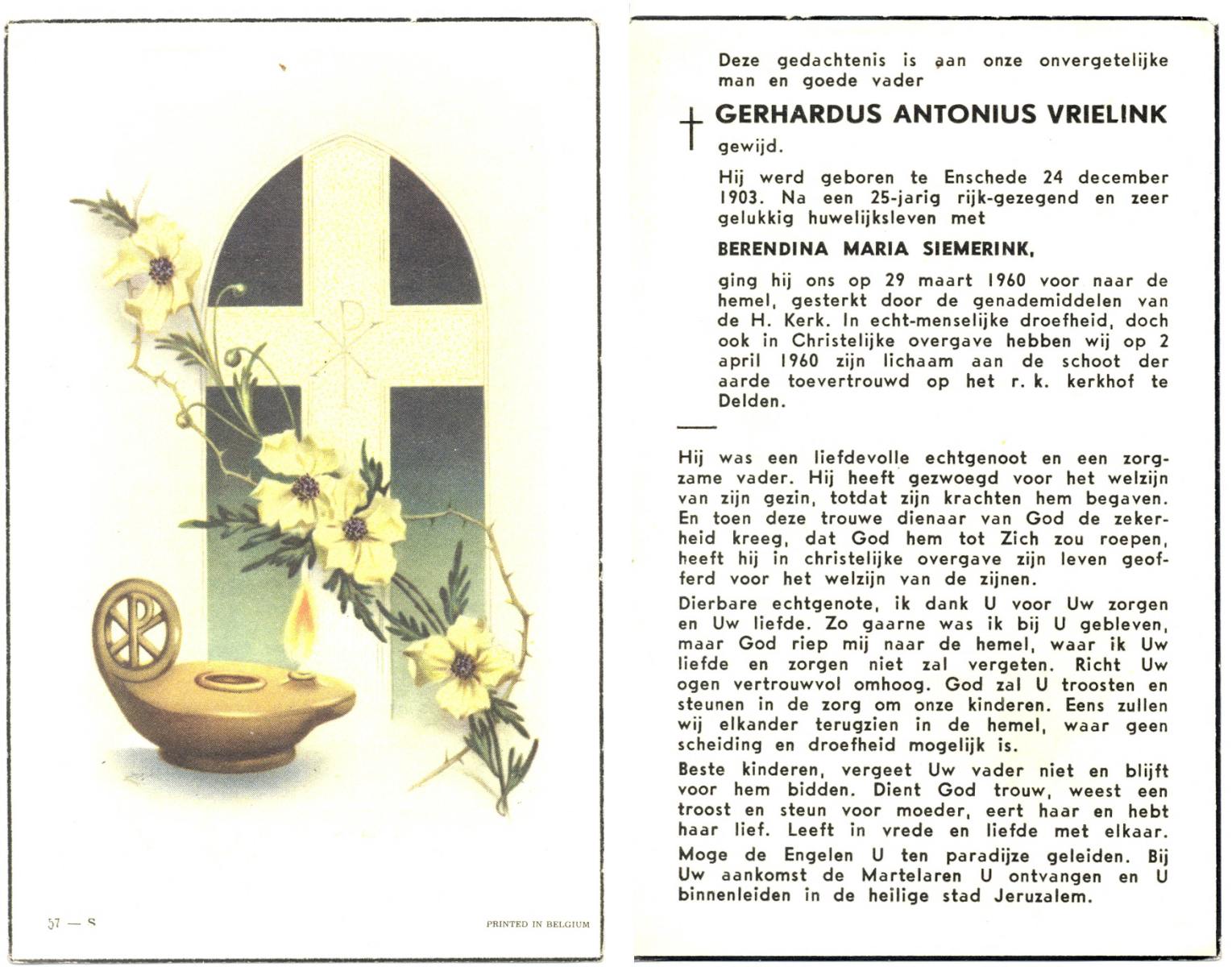 VRIELINK, Gerhardus Antonius, geboren op 24-12-1903 te Enschede, overleden op 29-3-1960 op 56-jarige leeftijd, begraven op 2-4-1960 te Delden parochie-kerkhof H.Blasius.
