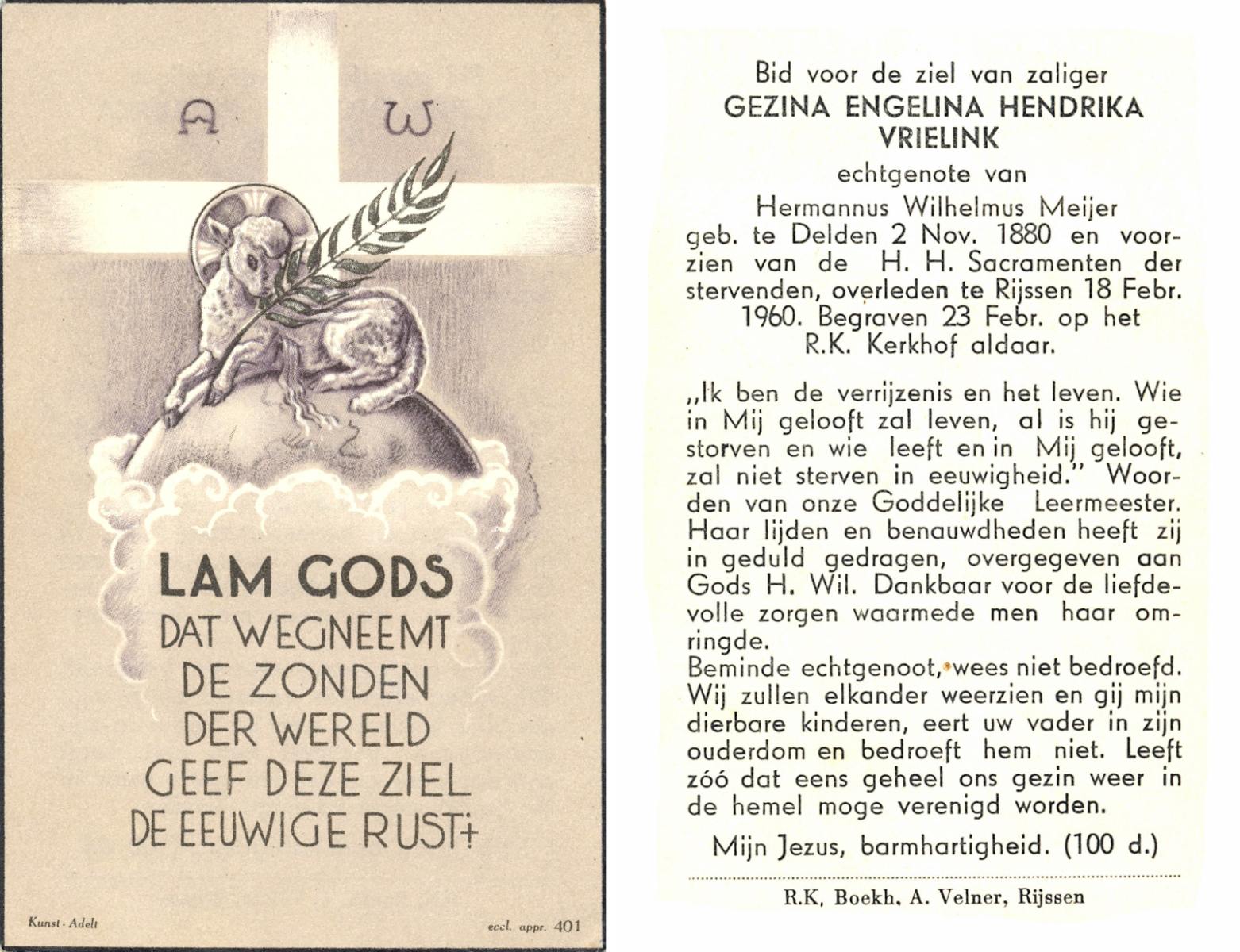 VRIELINK, Gezina Engelina Hendrika, geboren op 02-11-1880 te Delden, overleden op 18-2-1960 te Rijssen op 79-jarige leeftijd, begraven op 23-2-1960 te Rijssen.