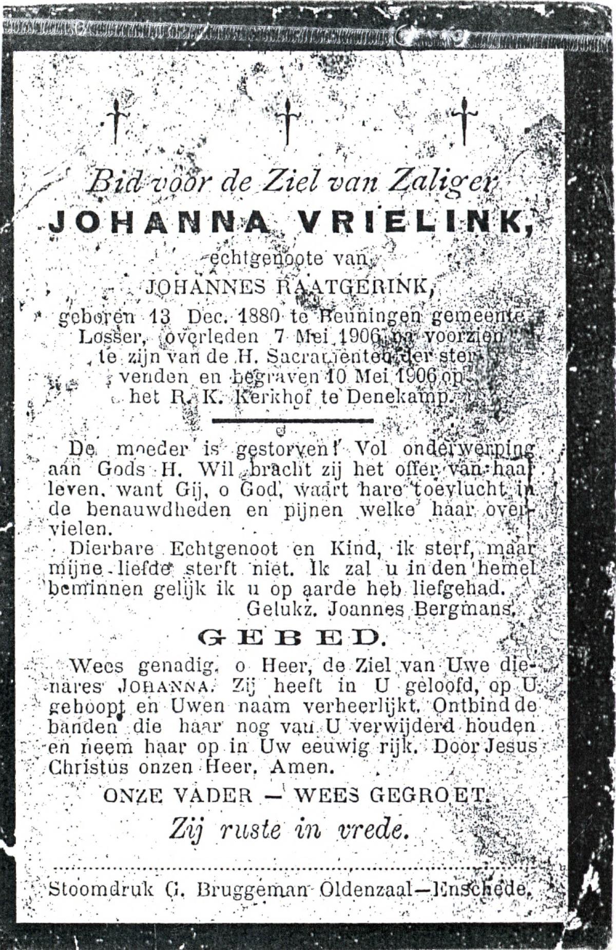 VRIELINK, Johanna, geboren op 13-12-1880 te Beuningen (Ov.), overleden op 7-5-1906 te Beuningen op 25-jarige leeftijd, begraven op 10-5-1906 te Denekamp.