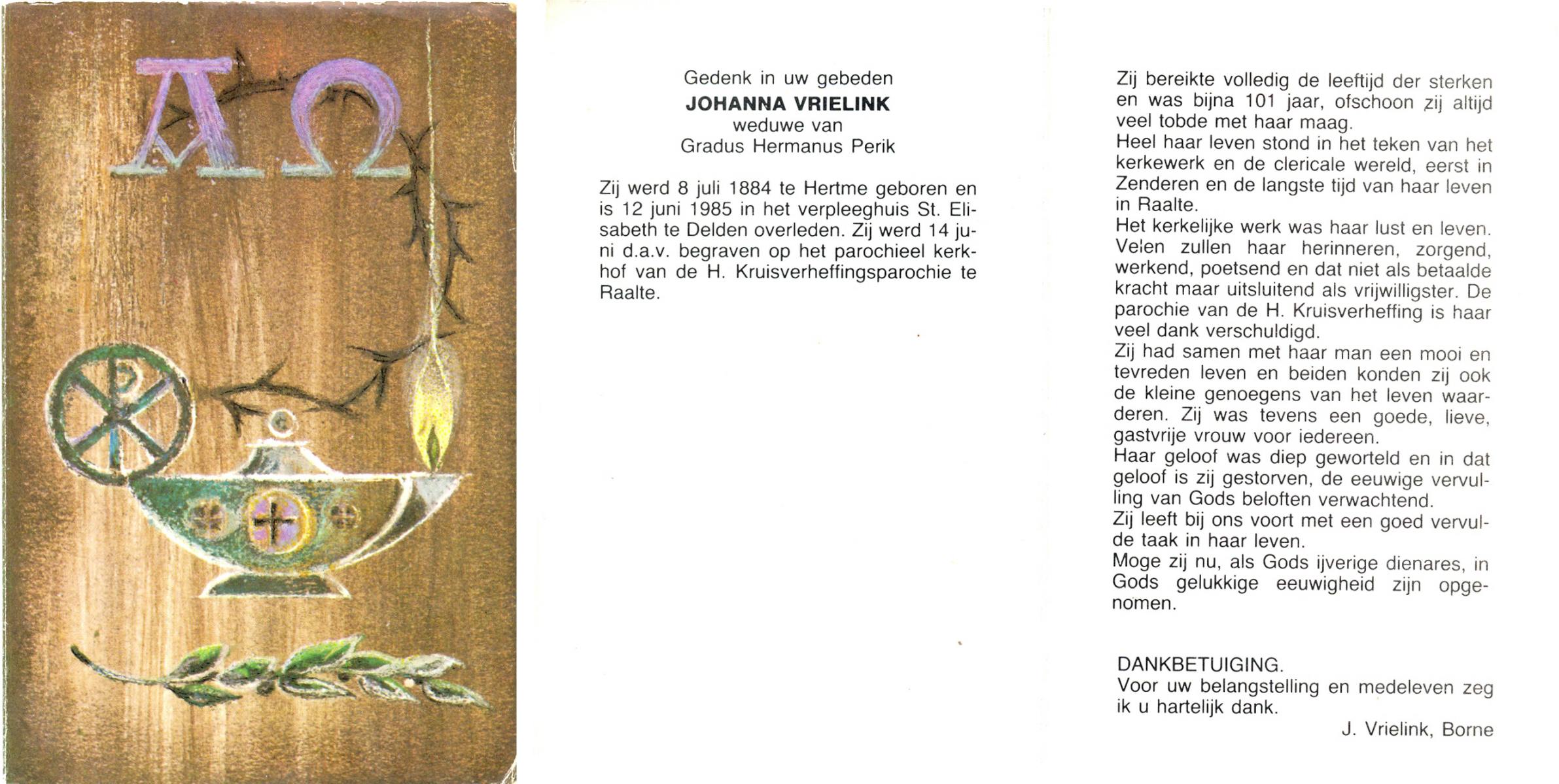 VRIELINK, Johanna, geboren op 08-07-1884 te Hertme, overleden op 12-6-1985 te Delden op 100-jarige leeftijd, begraven te Raalte.