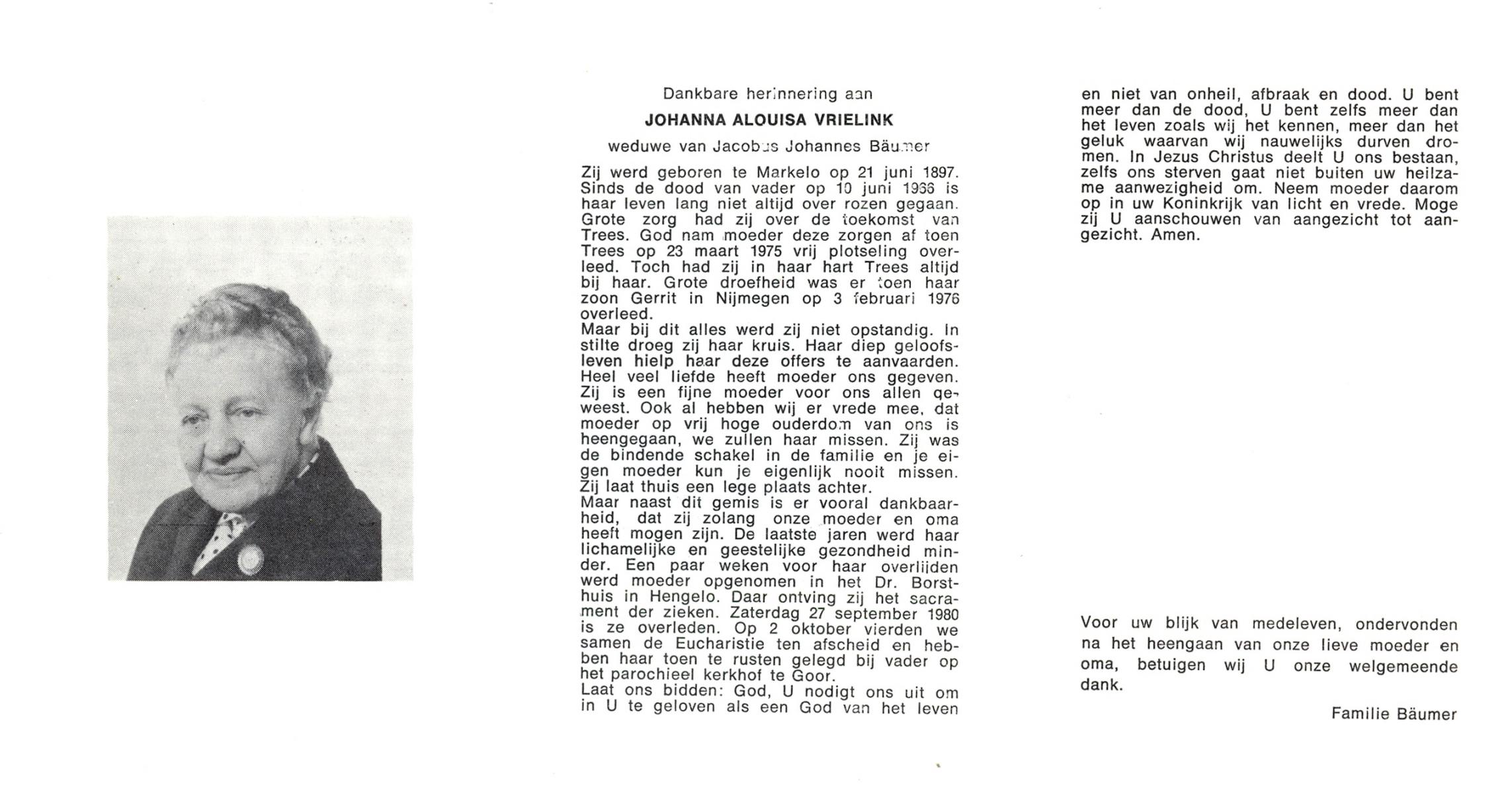VRIELINK, Johanna Alouisa, geboren op 21-06-1887 te Markelo, overleden op 27-9-1980 op 93-jarige leeftijd, begraven op 2-10-1980 te Goor.
