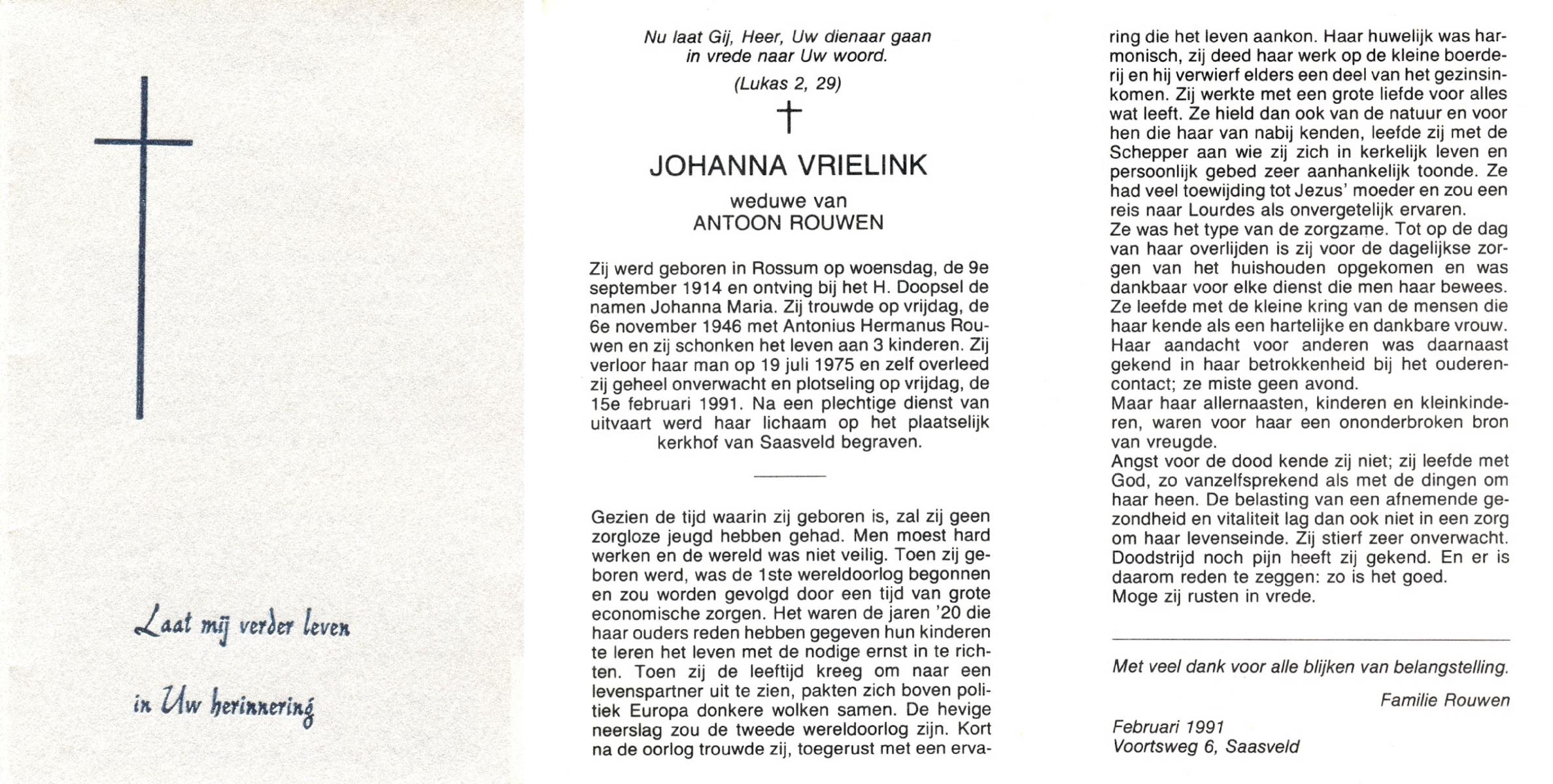 VRIELINK, Johanna (Johanna Maria), geboren op 9-9-1914 te Rossum, overleden op 15-2-1991 op 76-jarige leeftijd, begraven te Saasveld.