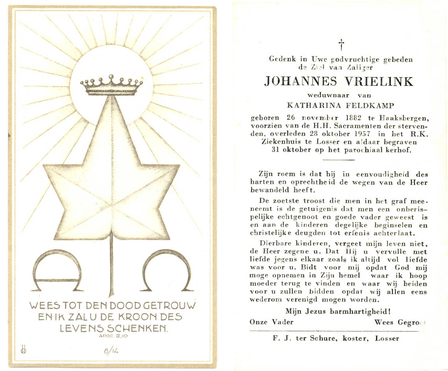VRIELINK, Johannes, geboren op 26-11-1882 te Haaksbergen, overleden op 28-10-1957 te Losser op 74-jarige leeftijd, begraven op 31-10-1957 te Losser.
