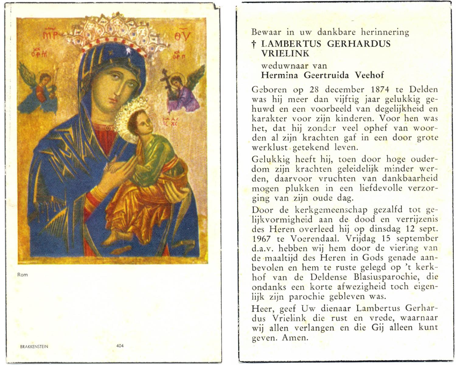 VRIELINK, Lambertus Gerhardus, geboren op 28-12-1874 te Delden, overleden op 12-9-1967 te Voerendaal op 92-jarige leeftijd, begraven op 15-9-1967 te Delden parochie-kerkhof H.Blasius.
