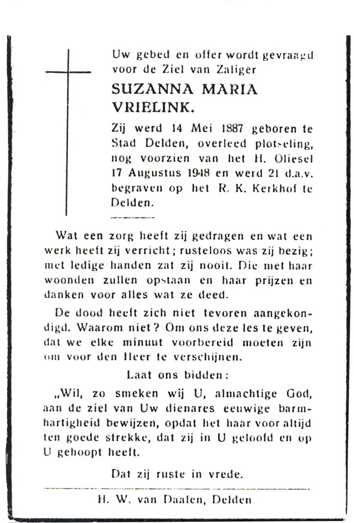 VRIELINK, Suzanna Maria, geboren op 14-05-1887 te Delden, Stad, overleden op 17-8-1948 op 61-jarige leeftijd, begraven op 21-8-1948 te Delden.