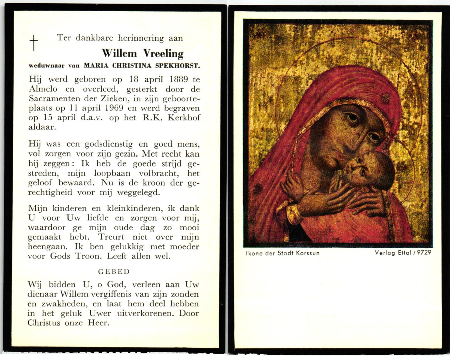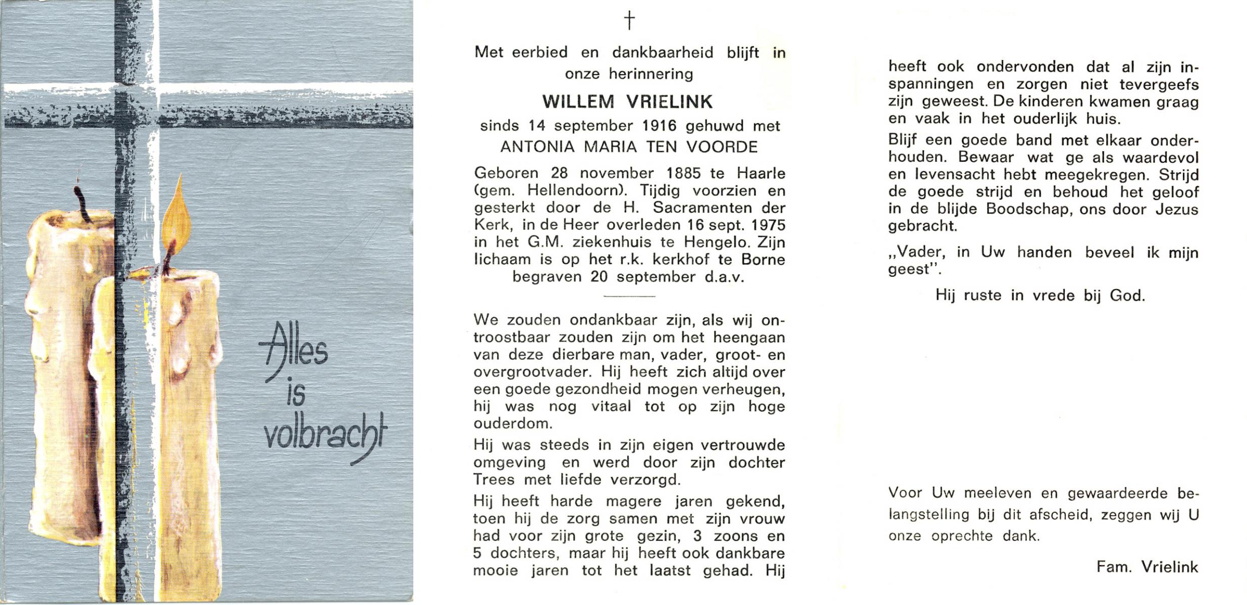 VRIELINK, Willem, geboren op 28-11-1885 te Haarle, overleden op 16-9-1975 te Hengelo (Ov.) op 89-jarige leeftijd, begraven op 20-9-1975 te Borne.