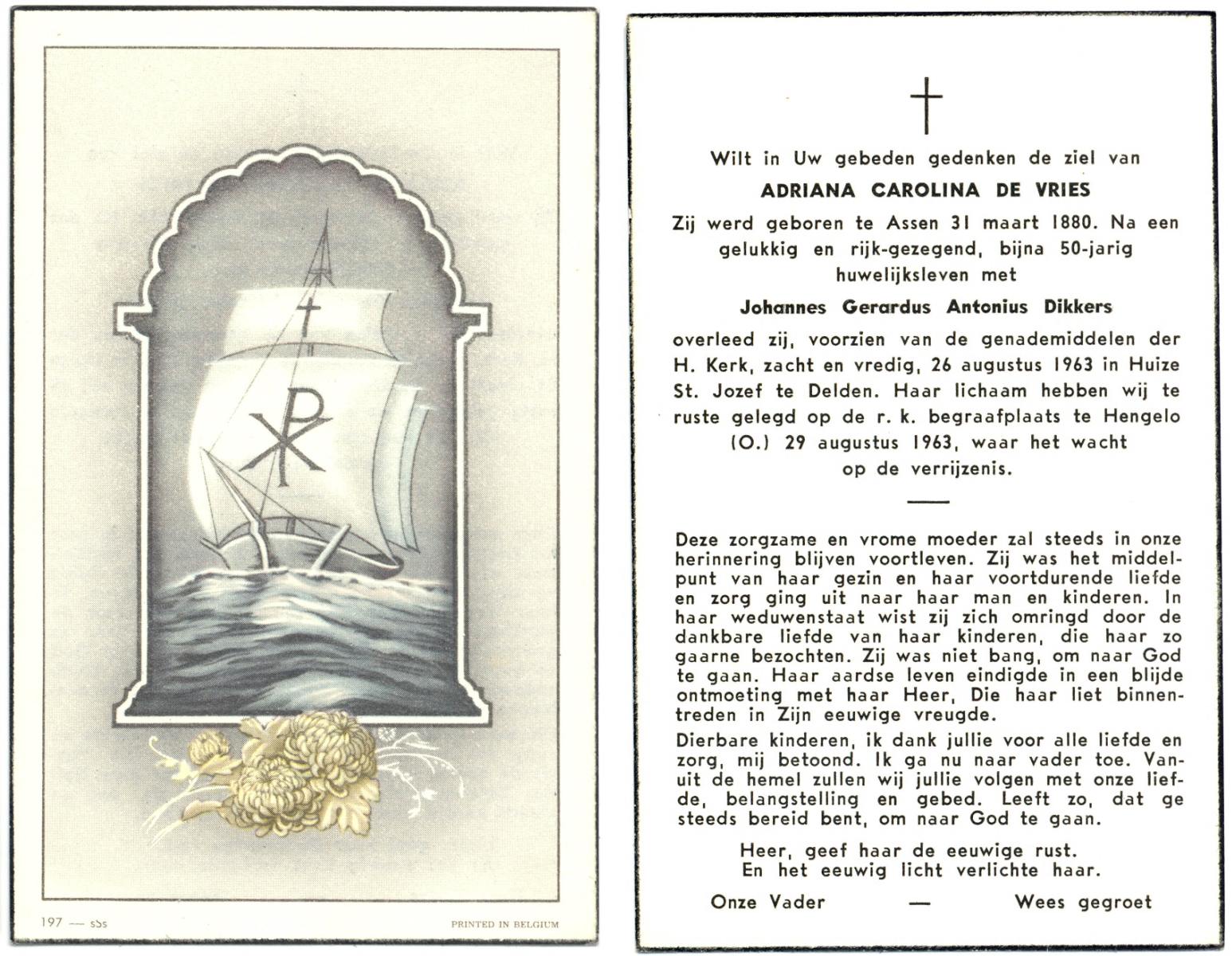 VRIES, de, Adriana Cornelia, geboren op 31-03-1880 te Assen, overleden op 26-8-1963 te Delden op 83-jarige leeftijd, begraven op 29-8-1963 te Hengelo (O) r.k.kerkhof.