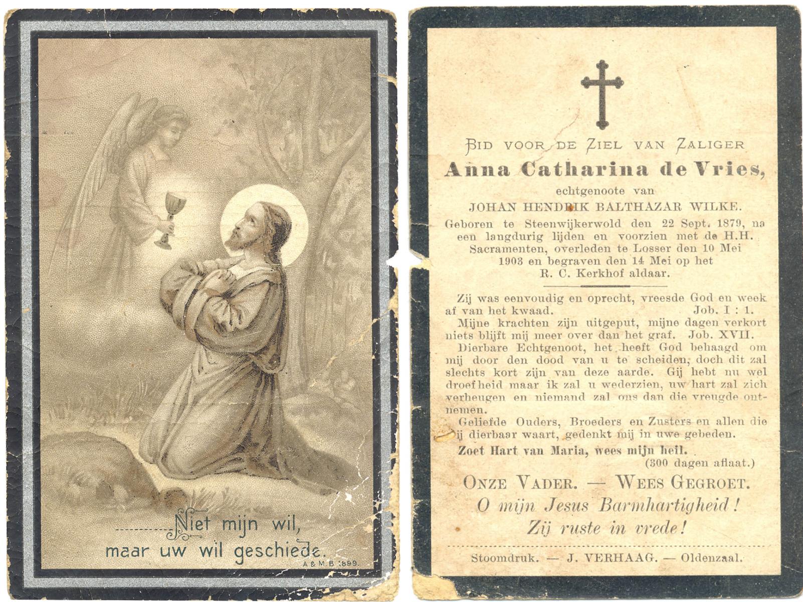 VRIES, de, Anna Catharina, geboren op 22-09-1879 te Steenwijkerwold, overleden op 10-5-1903 te Losser op 23-jarige leeftijd, begraven op 14-5-1903 te Losser.