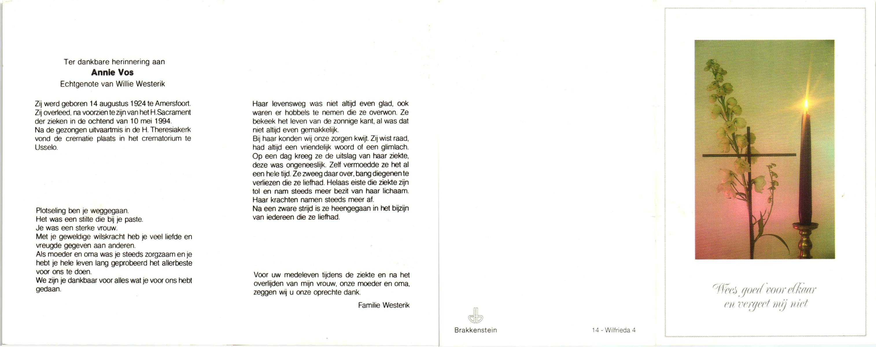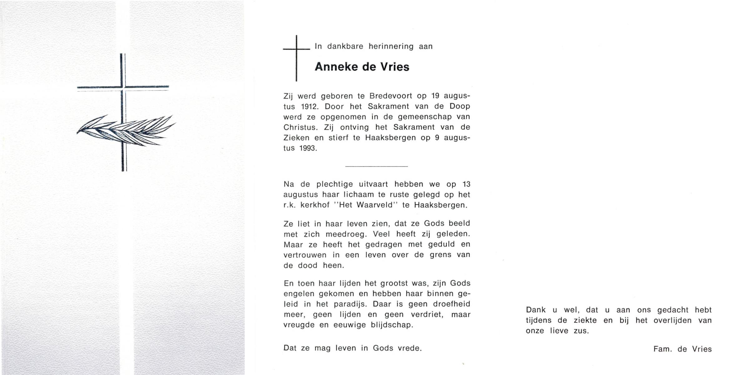 VRIES, de, Anneke, geboren op 19-8-1912 te Bredevoort, overleden op 9-8-1993 te Haaksbergen op 80-jarige leeftijd, begraven op 13-8-1993 te Haaksbergen.