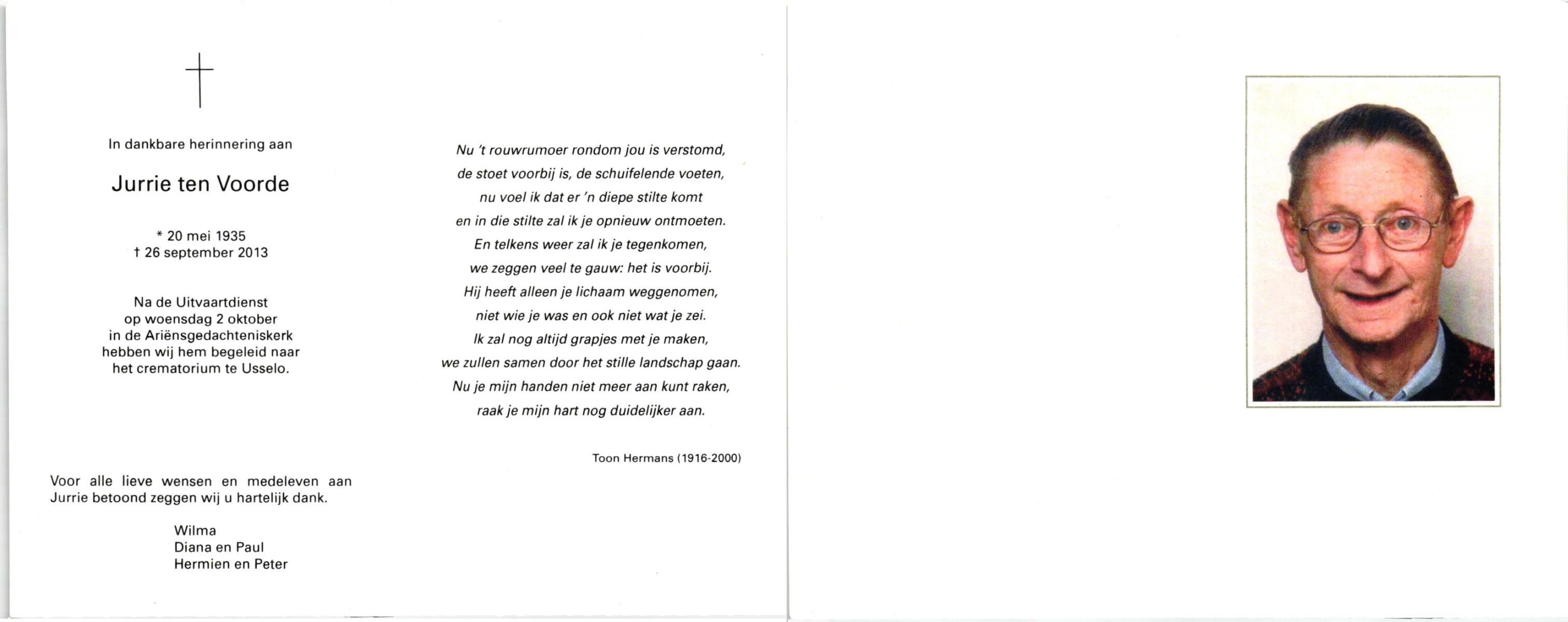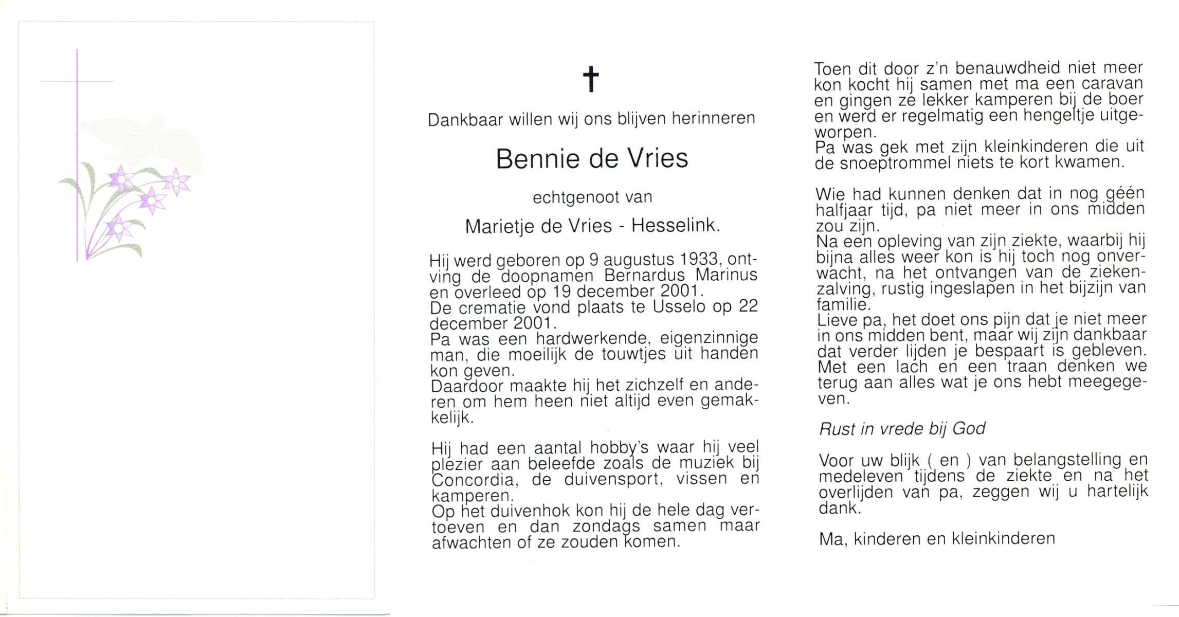 VRIES, de, Bennie, geboren op 9-8-1933, overleden op 19-12-2001 op 68-jarige leeftijd, gecremeerd op 22-12-2001 te Usselo.