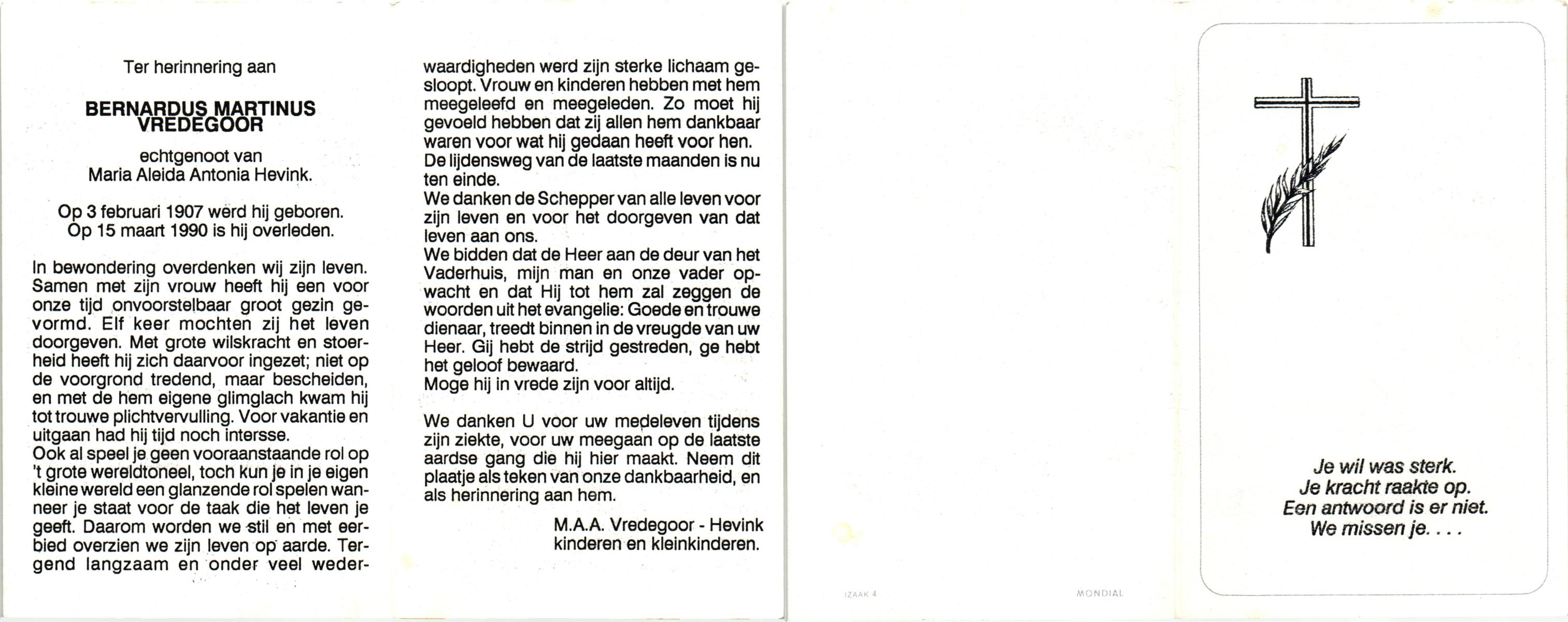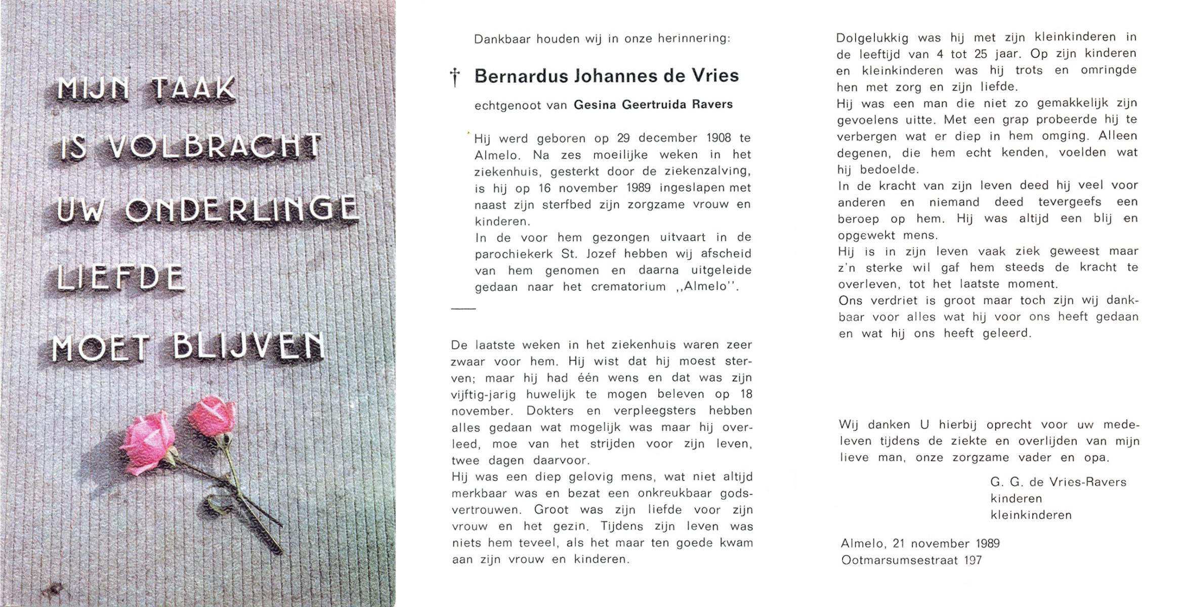 VRIES, de, Bernardus Johannes, geboren op 29-12-1908 te Almelo, overleden op 16-11-1989 op 80-jarige leeftijd, gecremeerd te Almelo.