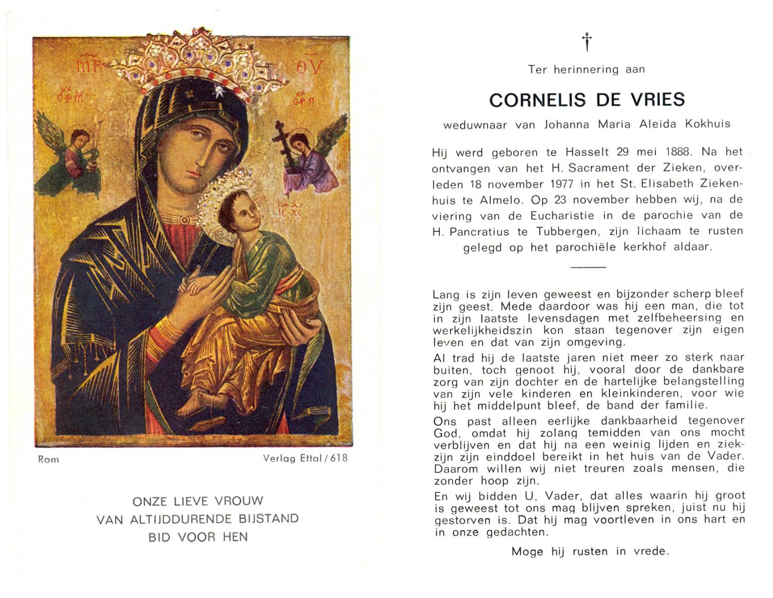 VRIES, de, Cornelis, geboren op 29-05-1888 te Hasselt, overleden op 18-11-1977 te Almelo op 89-jarige leeftijd, begraven op 23-11-1977 te Tubbergen.