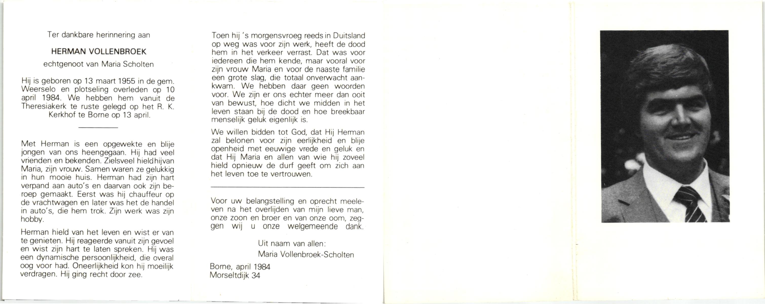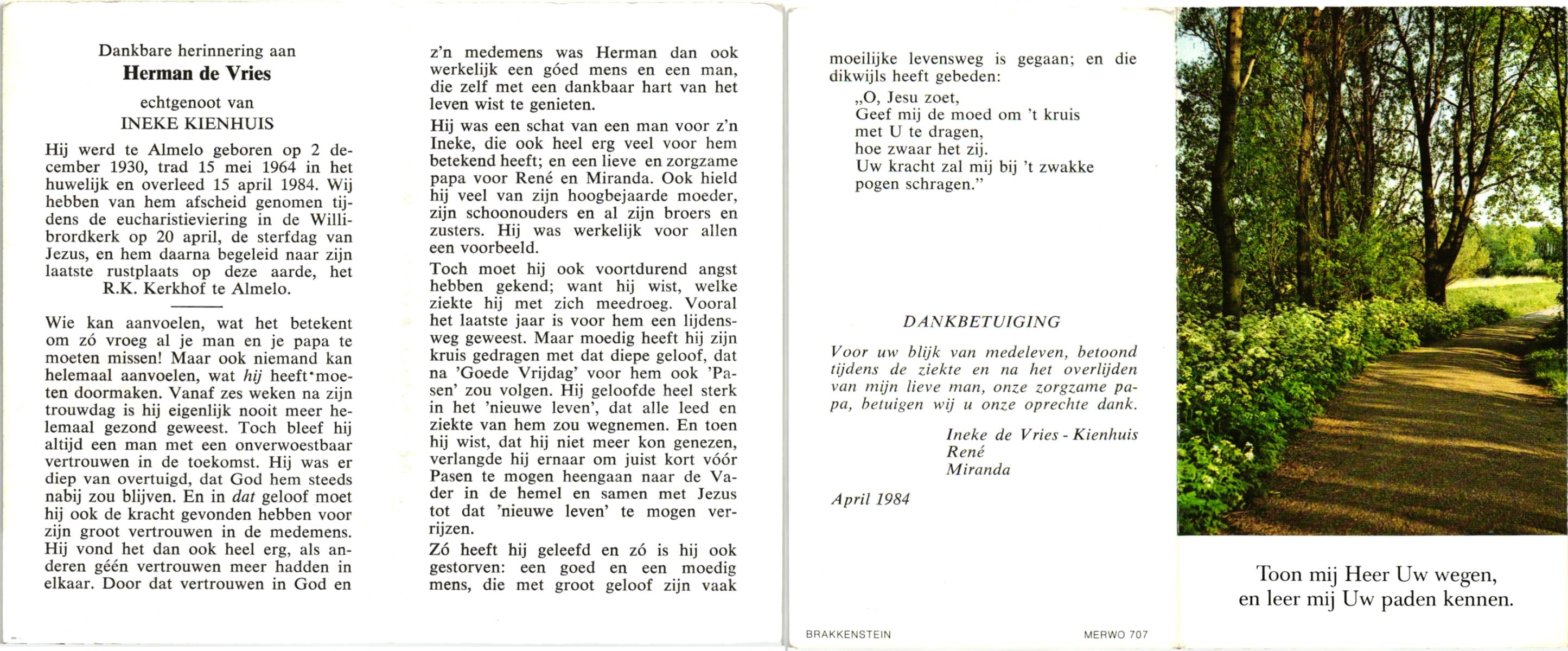 VRIES, de, Herman, geboren op 2-12-1930 te Almelo, overleden op 15-4-1984 op 53-jarige leeftijd, begraven op 20-4-1984 te Almelo.