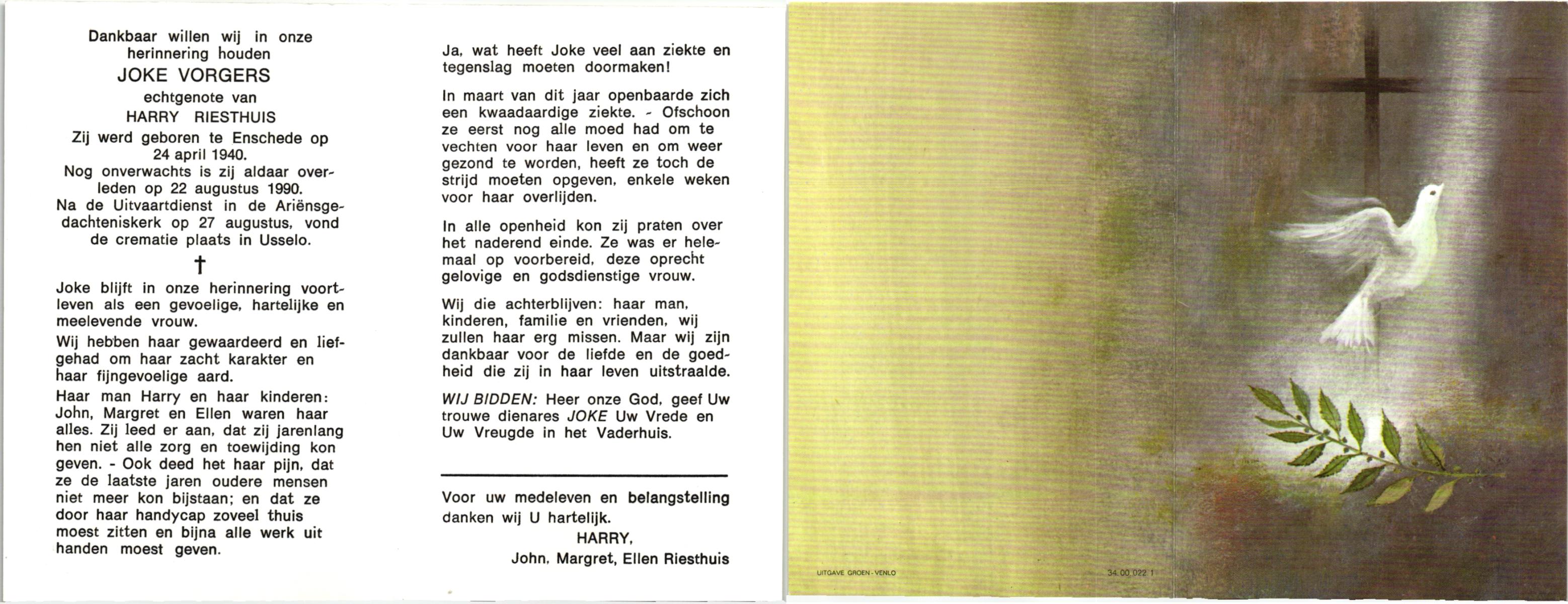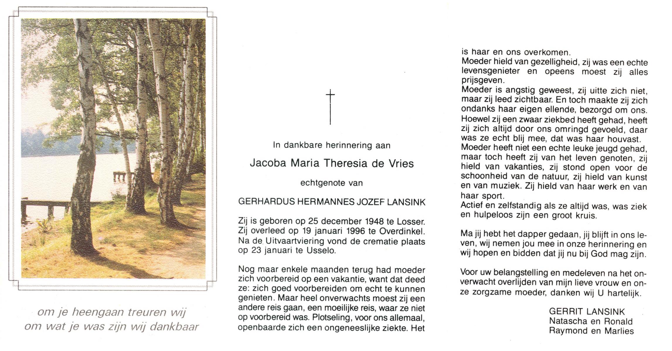VRIES, de, Jacoba Maria Theresia, geboren op 25-12-1948 te Losser, overleden op 19-1-1996 te Overdinkel op 47-jarige leeftijd, gecremeerd op 23-1-1996 te Usselo.