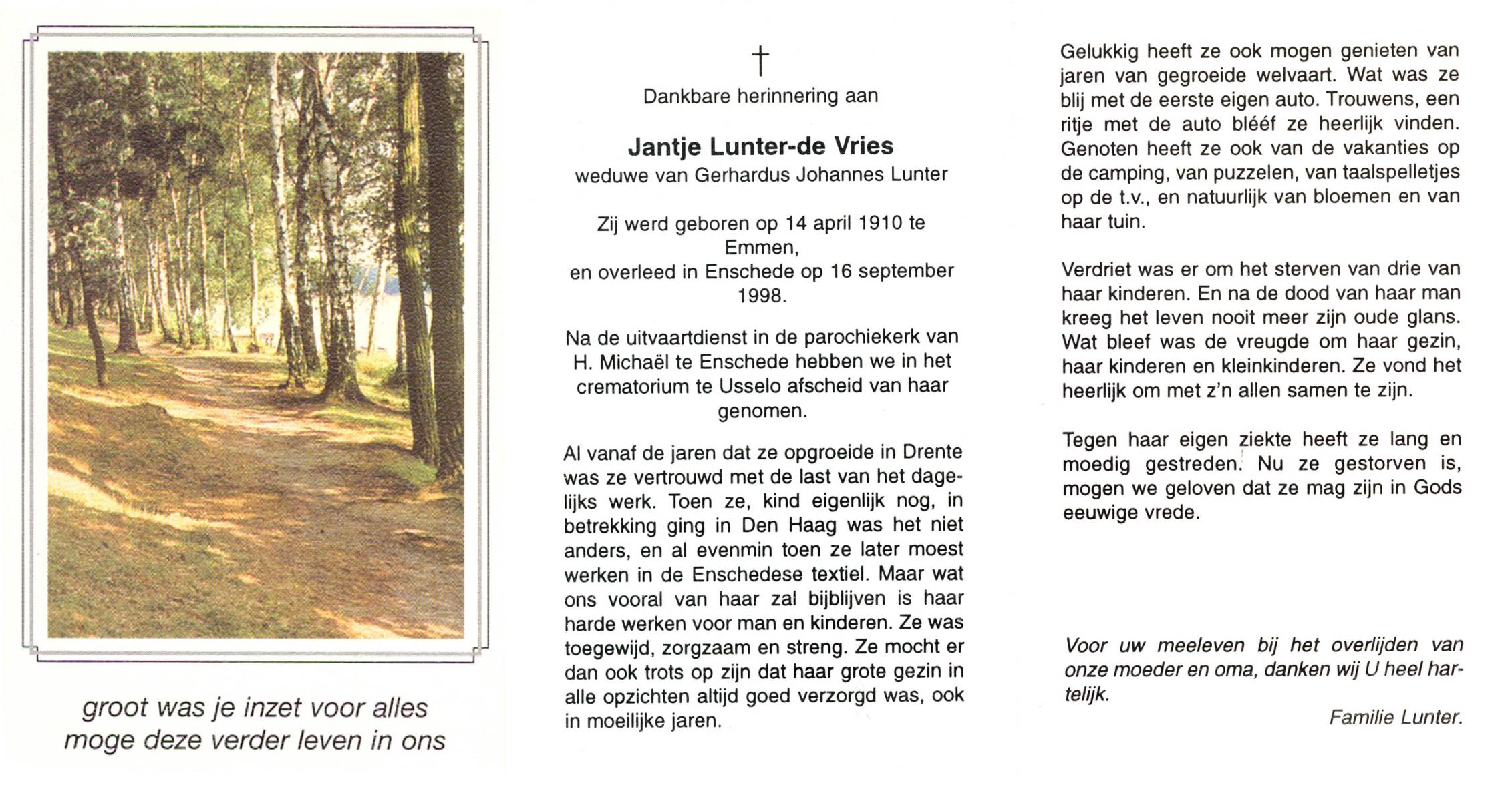 VRIES, de, Jantje, geboren op 14-4-1910 te Emmen, overleden op 16-9-1998 te Enschede op 88-jarige leeftijd, gecremeerd te Usselo.